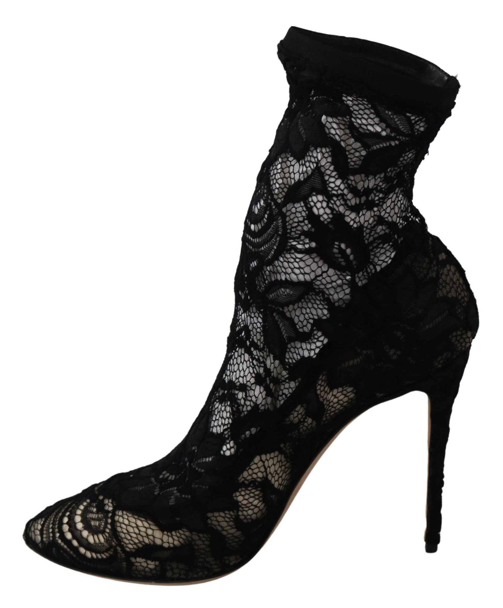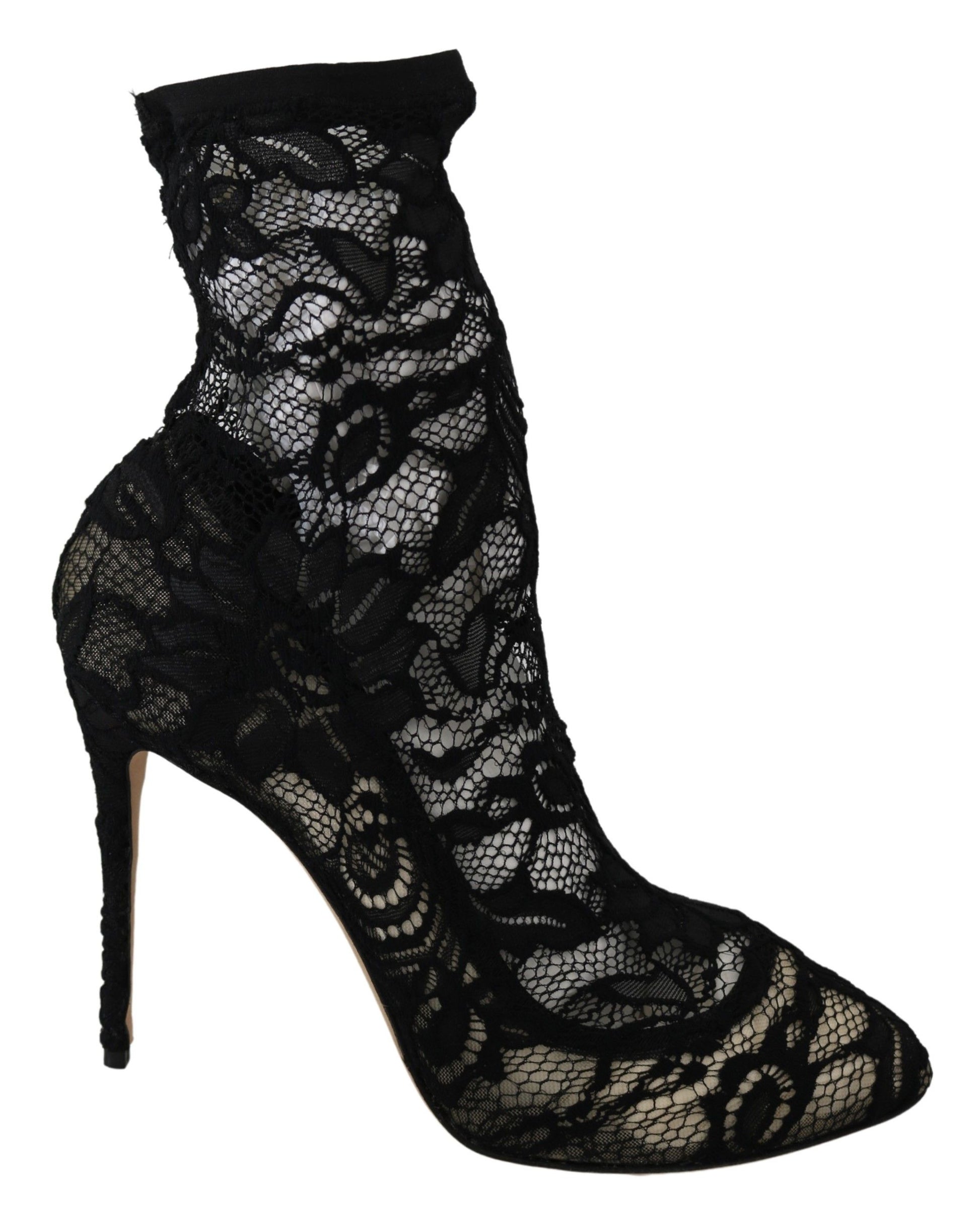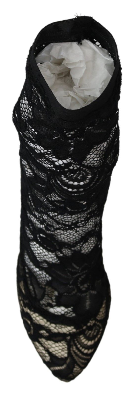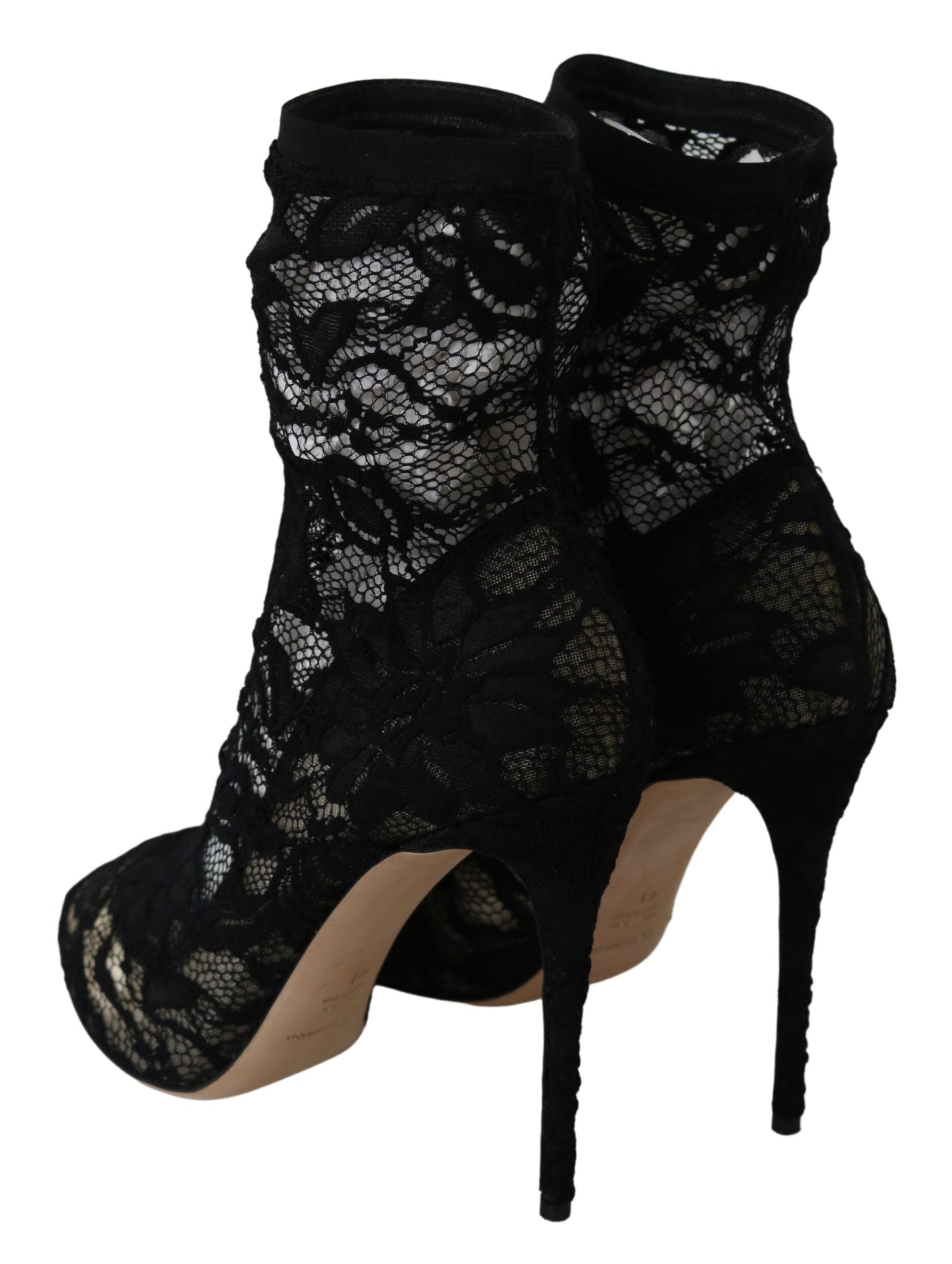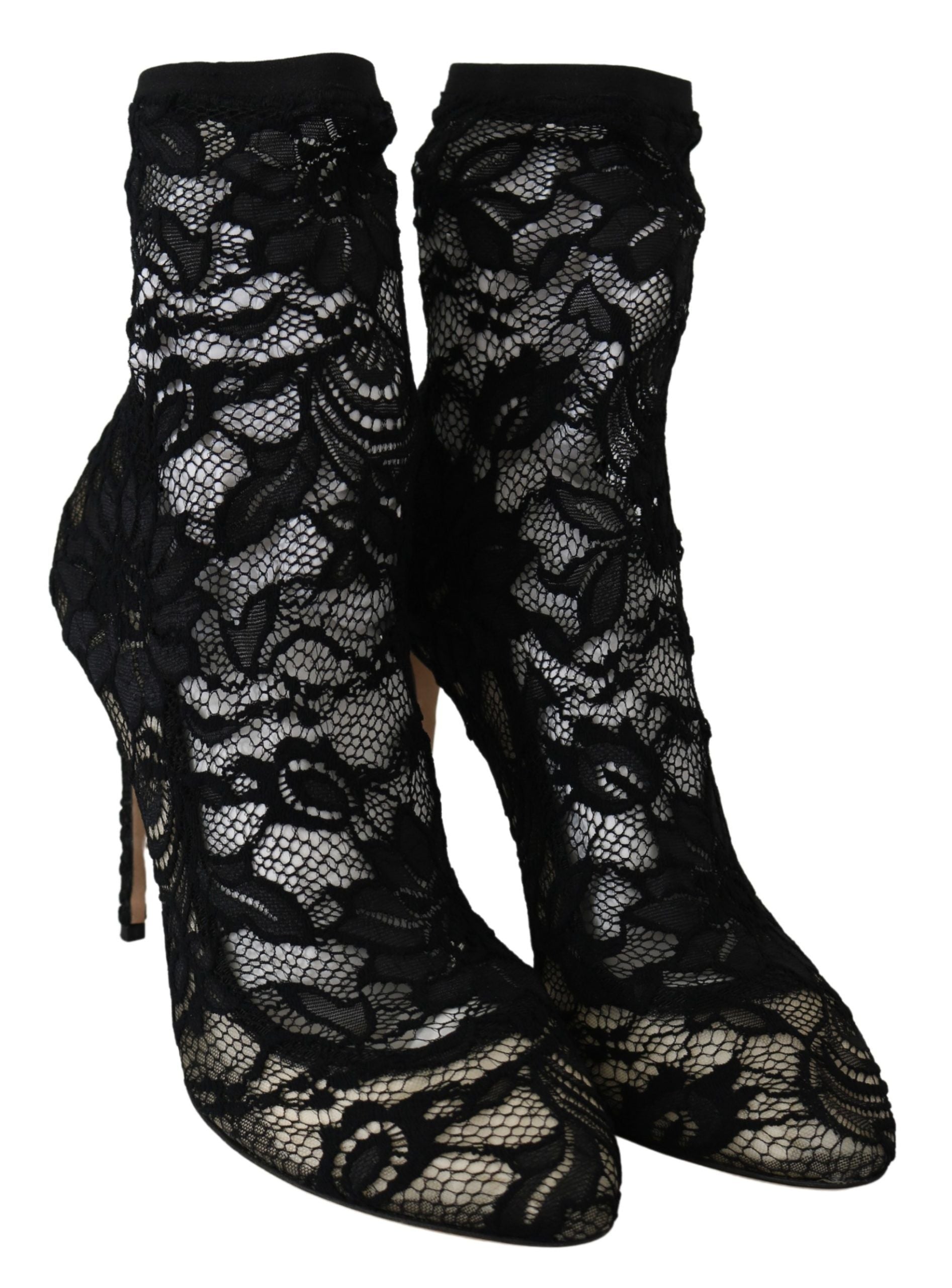 Step into a world of elegance with these exquisite Dolce & Gabbana Black Lace Ankle Boots. Perfect for adding a touch of sophistication to any outfit, these boots boast a charming floral lace pattern, sleek pointed toe, and a striking stiletto heel. Crafted in Italy, they promise both unparalleled quality and comfort. Their distinct logo detail subtly brands this luxurious footwear, ensuring they stand out at every occasion.
