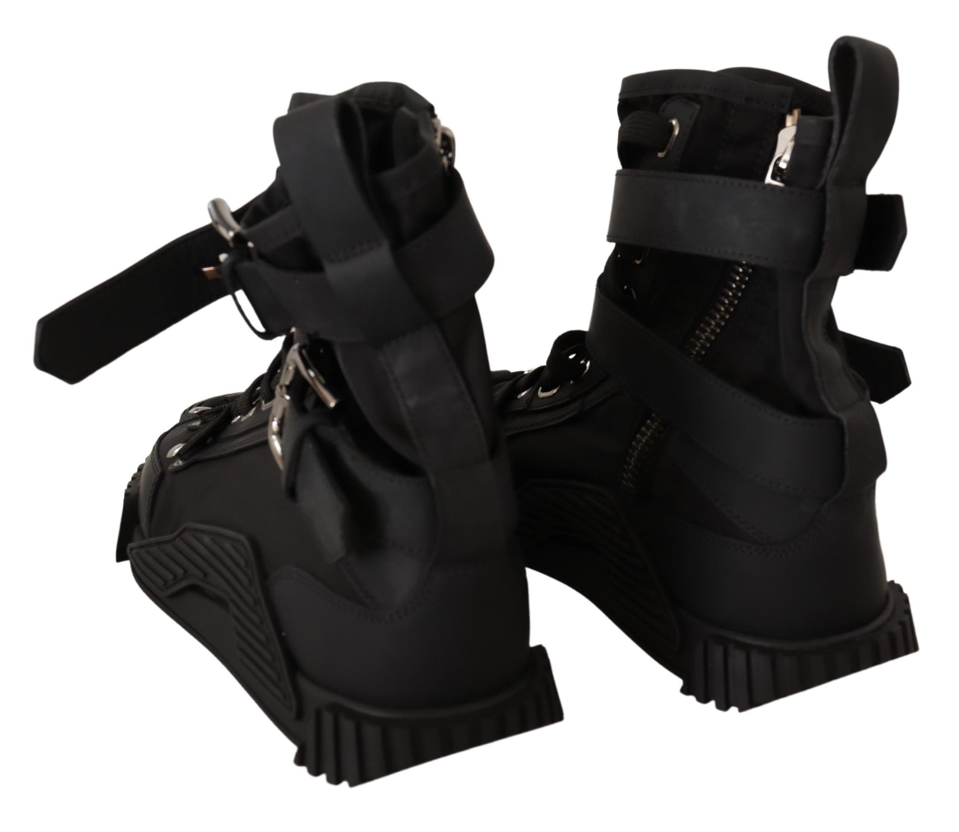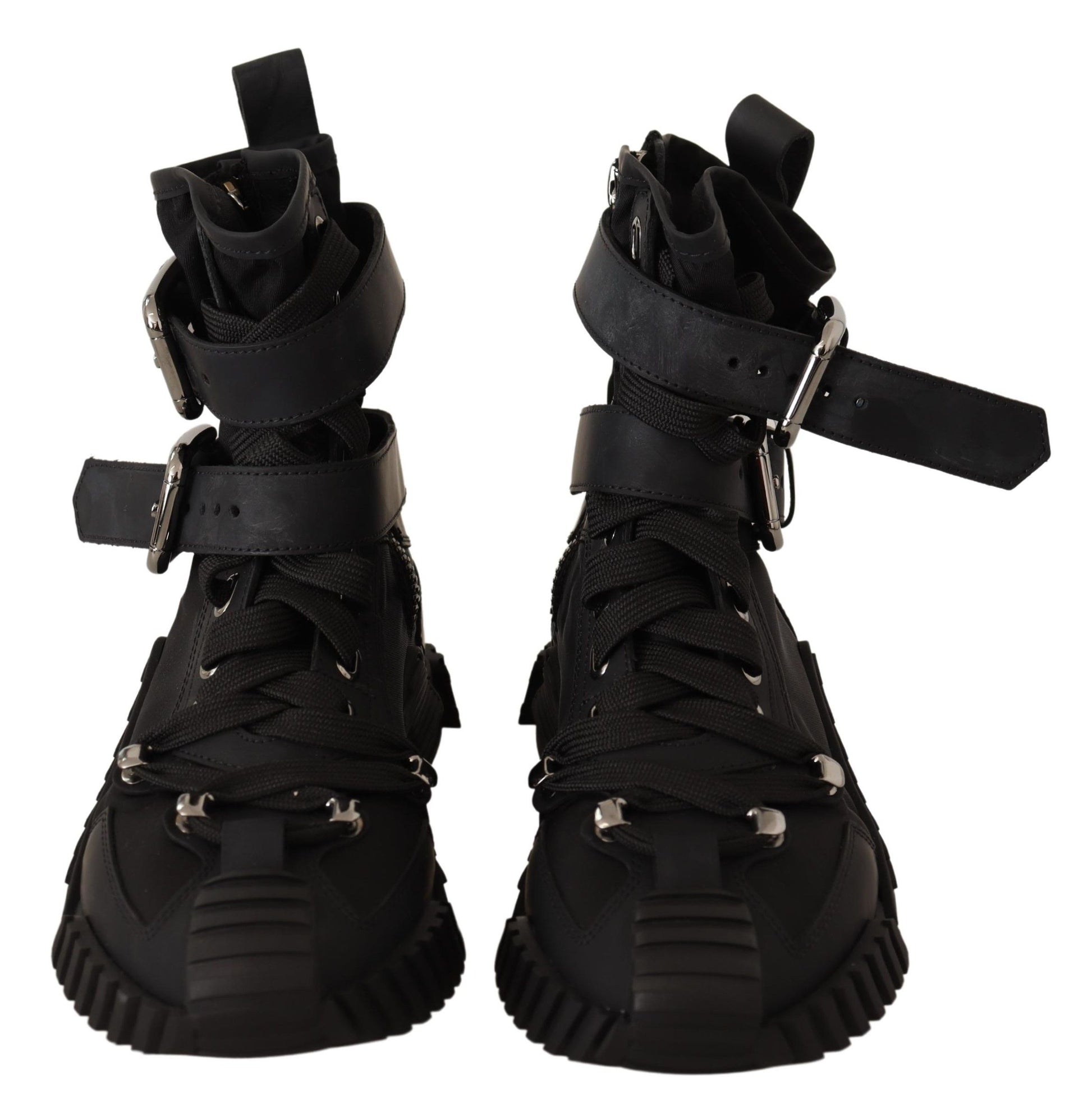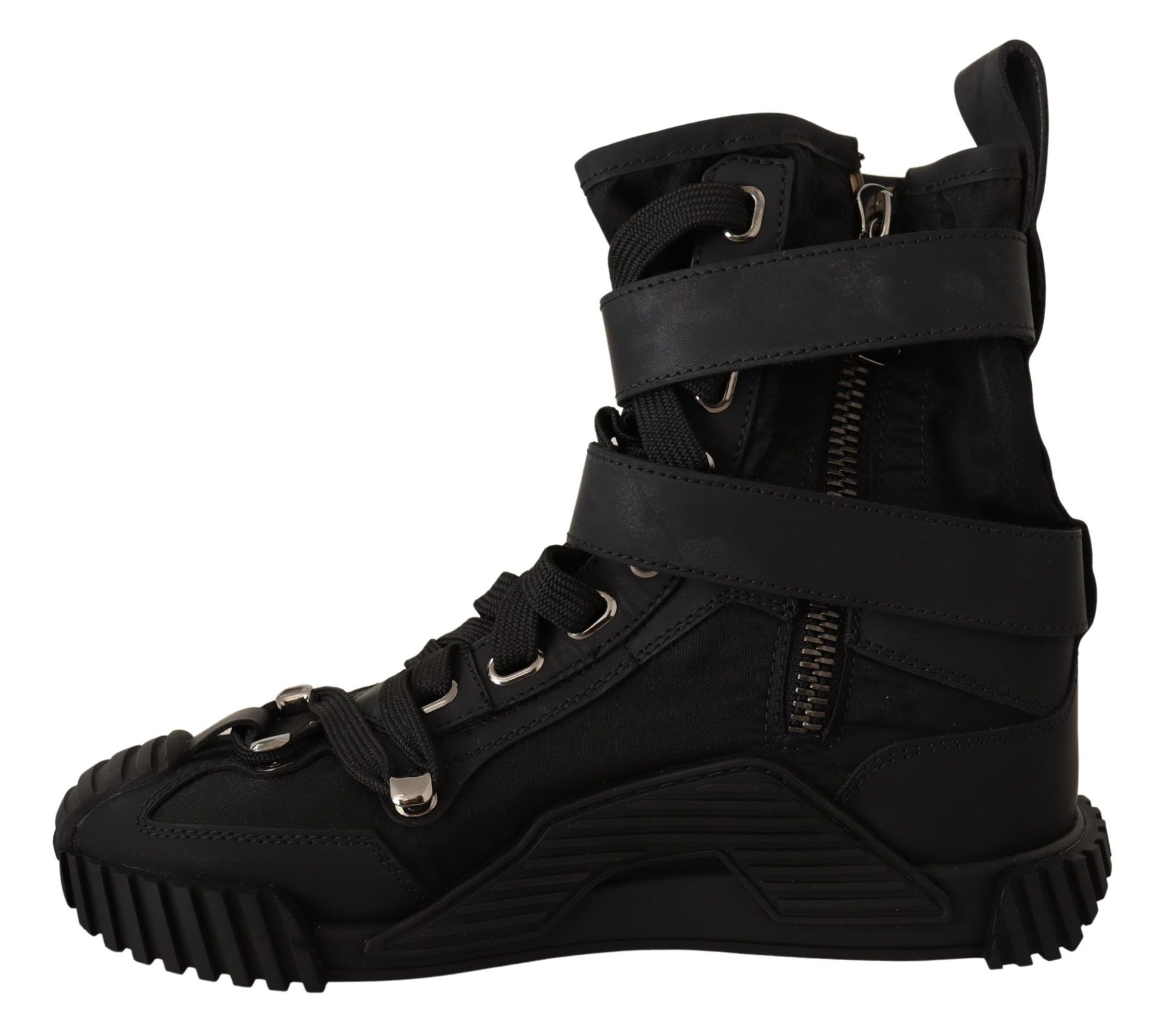 Step into luxury with these Dolce & Gabbana trekking boots, a blend of high fashion and durability. Perfect for the adventurous spirit with an eye for style, these boots are crafted from a mix of sturdy nylon and sleek matte leather, featuring sculpted ribbed overlays alongside their robust wide soles. Detailed with reinforced lacing and adjustable high-shaft straps, these boots are as practical as they are chic. The convenience of a side zipper crafted by the iconic duo, Domenico Dolce and Stefano Gabbana, adds to the ease of wear. With their rubber soles and the brand’s signature logo details, these boots embody exclusive craftsmanship, direct from Italy.