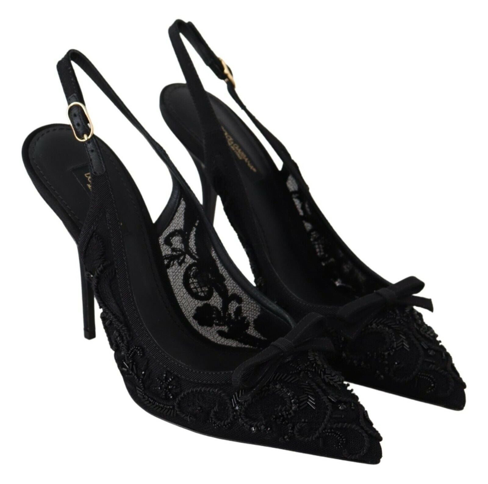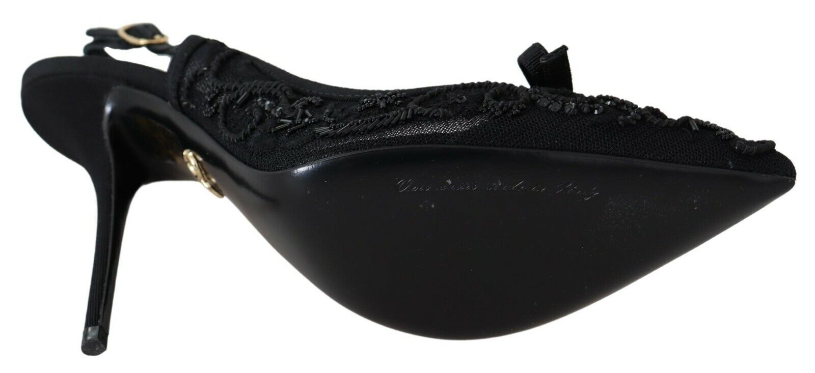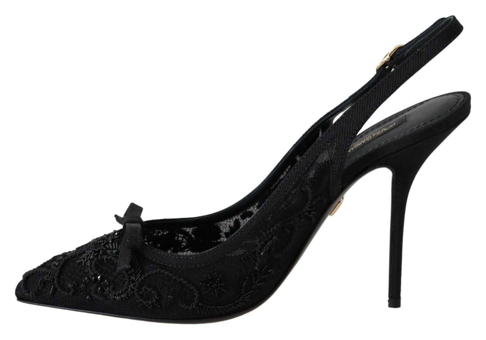 Indulge in the epitome of elegance with these exquisite black stilettos by Dolce & Gabbana. At first glance, they flaunt a seemingly lacey appearance, but upon closer inspection, you’ll discover a stunning embroidery of twisted cords and beads, intricately assembled to showcase a delicate floral design. Crafted with meticulous care, these heels feature a mesh backdrop, accentuated by grosgrain ribbon piping and a charming bow atop a slender cape – making these sling back heels a true work of art. Designed for glamour and engineered for elegance, they come complete with a leather sole and the iconic logo details.