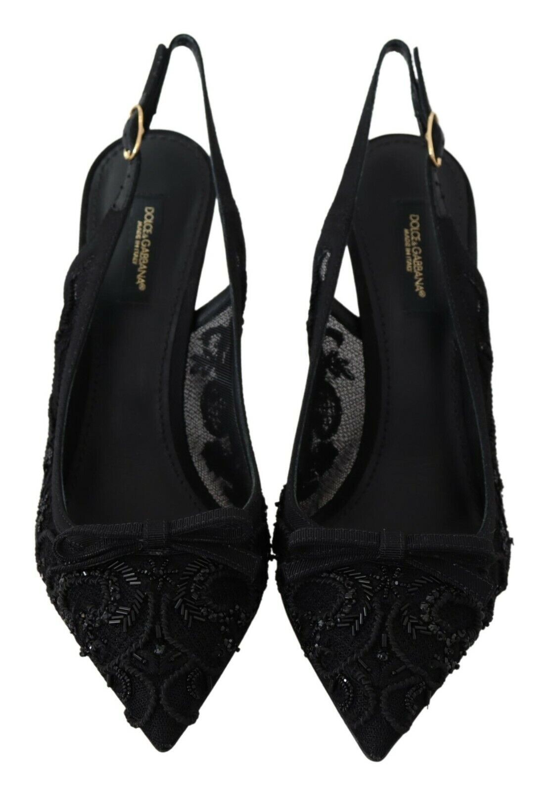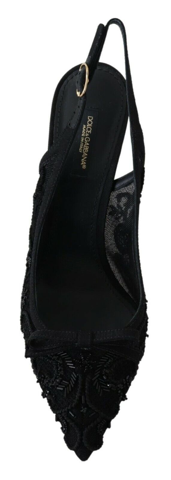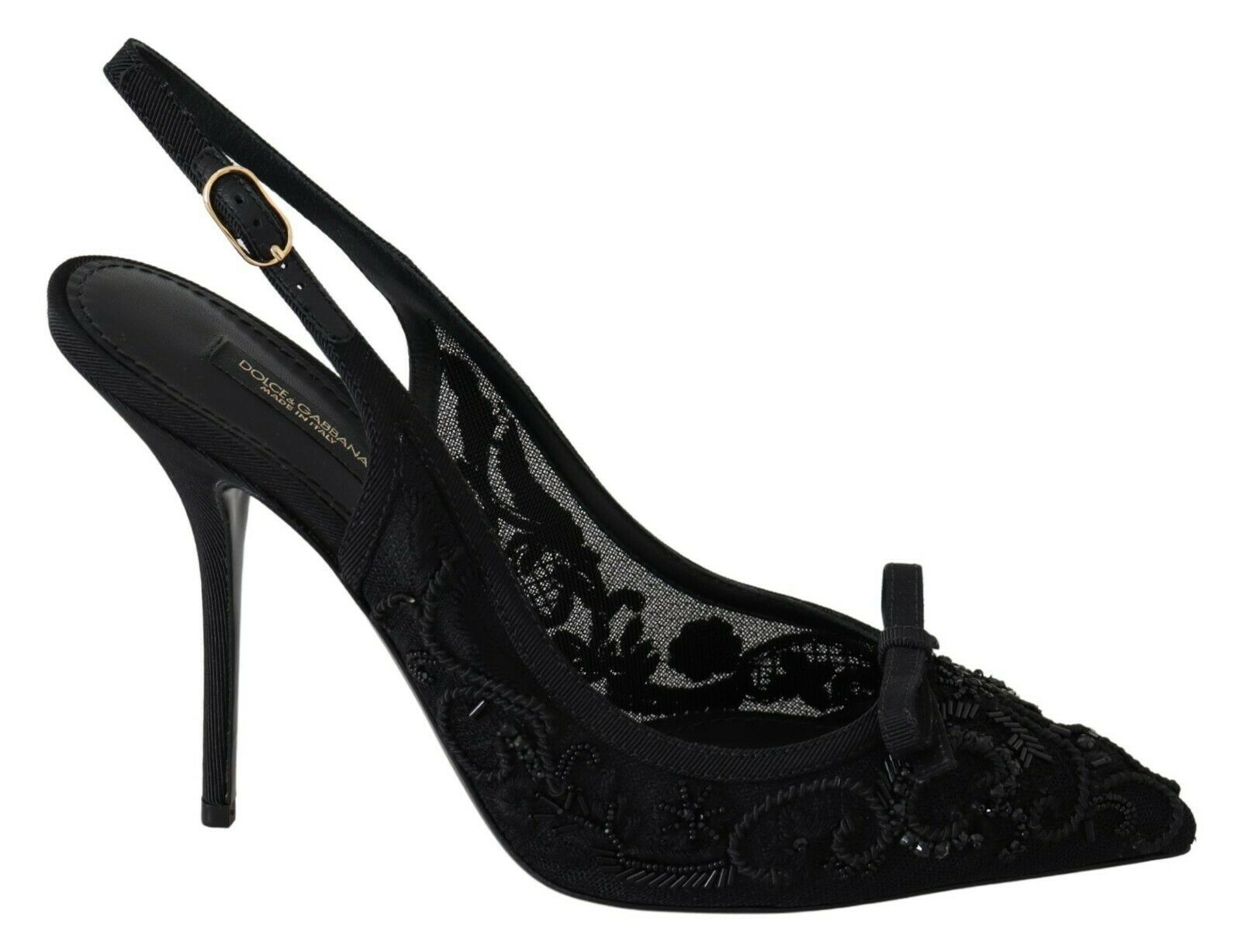 Indulge in the epitome of elegance with these exquisite black stilettos by Dolce & Gabbana. At first glance, they flaunt a seemingly lacey appearance, but upon closer inspection, you’ll discover a stunning embroidery of twisted cords and beads, intricately assembled to showcase a delicate floral design. Crafted with meticulous care, these heels feature a mesh backdrop, accentuated by grosgrain ribbon piping and a charming bow atop a slender cape – making these sling back heels a true work of art. Designed for glamour and engineered for elegance, they come complete with a leather sole and the iconic logo details.