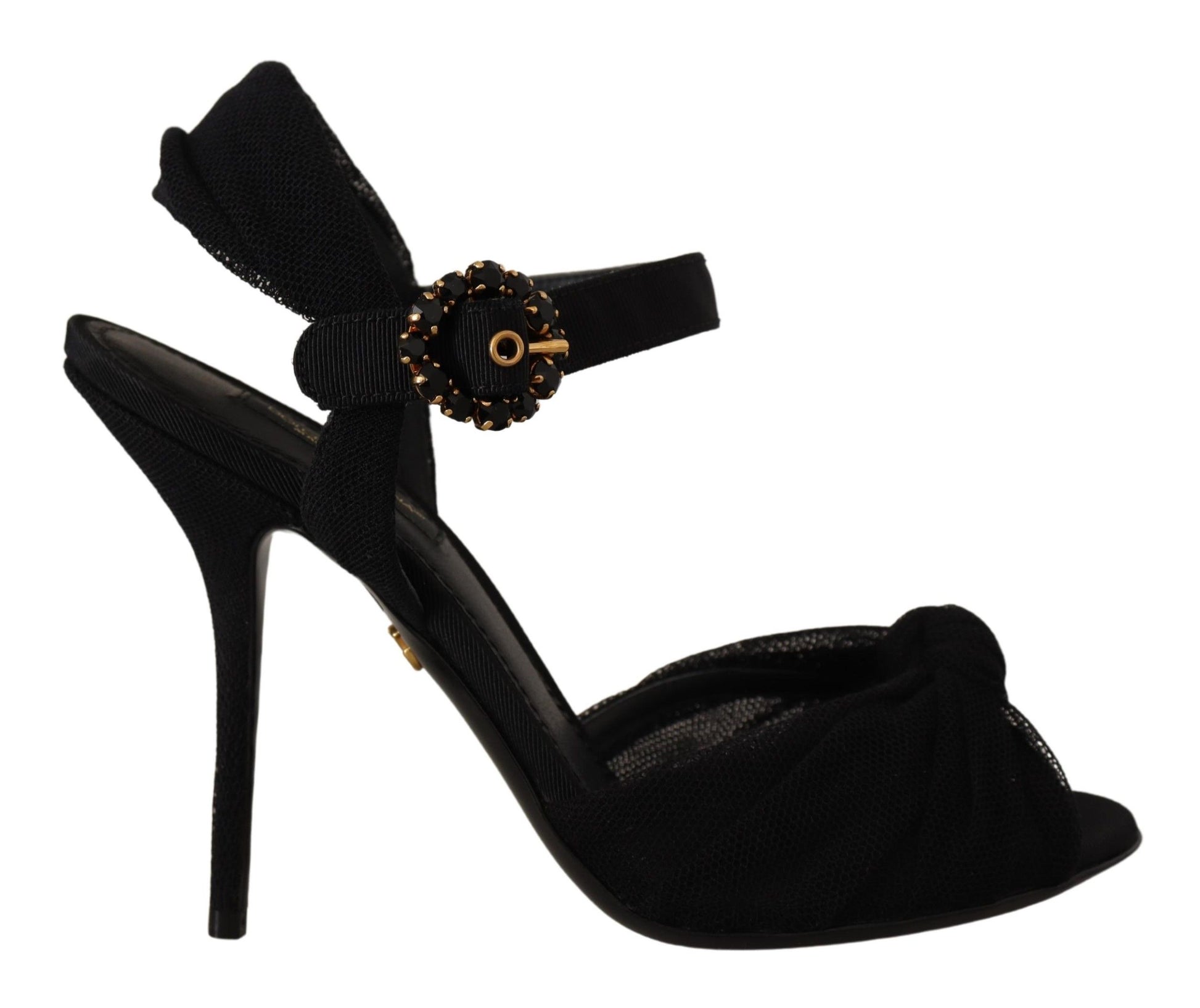 Black Tulle Ankle Strap Heels with Crystal Buckle