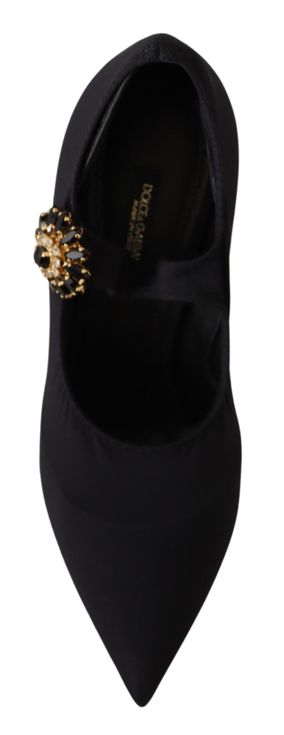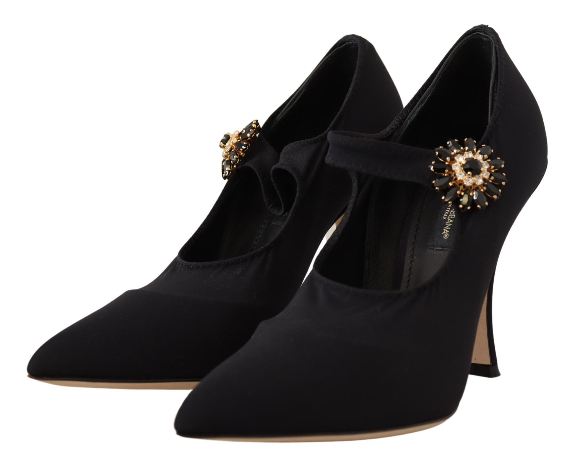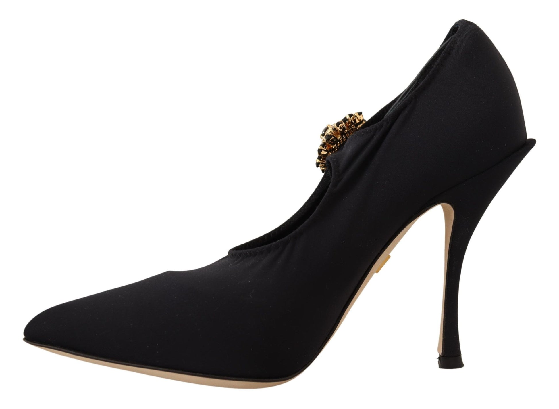 Step into luxury with these exquisite Dolce & Gabbana Mary Jane pumps. With an eye-catching appliqué adorned with silver, gold, and black decorative elements, these shoes are the epitome of sophistication and style. Crafted with a nylon and elastane blend for comfort, they feature a classic black hue that offers versatility and elegance for any occasion. The beige leather sole pairs beautifully with the luxurious leather inner and outer that whisper quality with every step you take, proudly made in Italy.