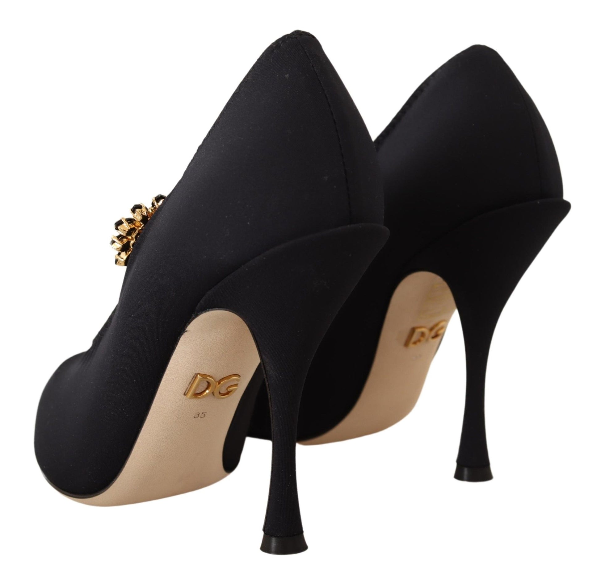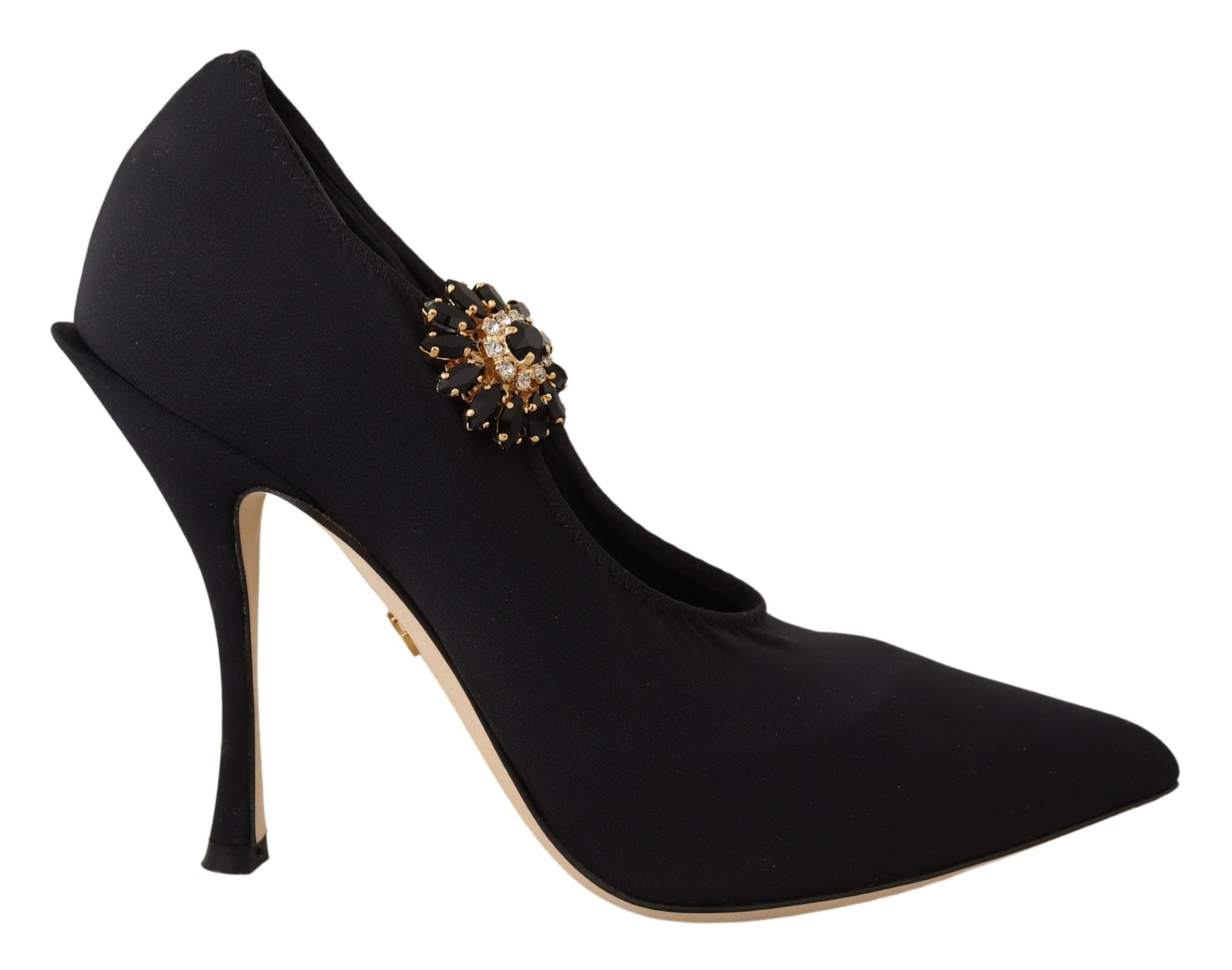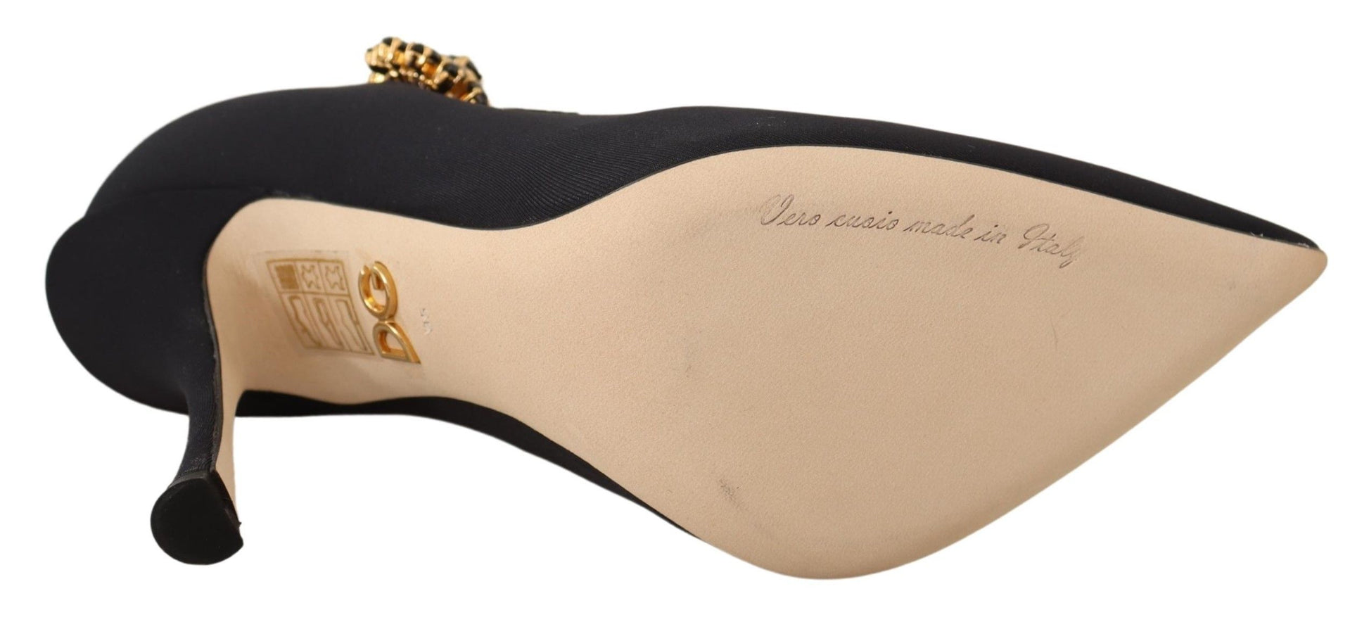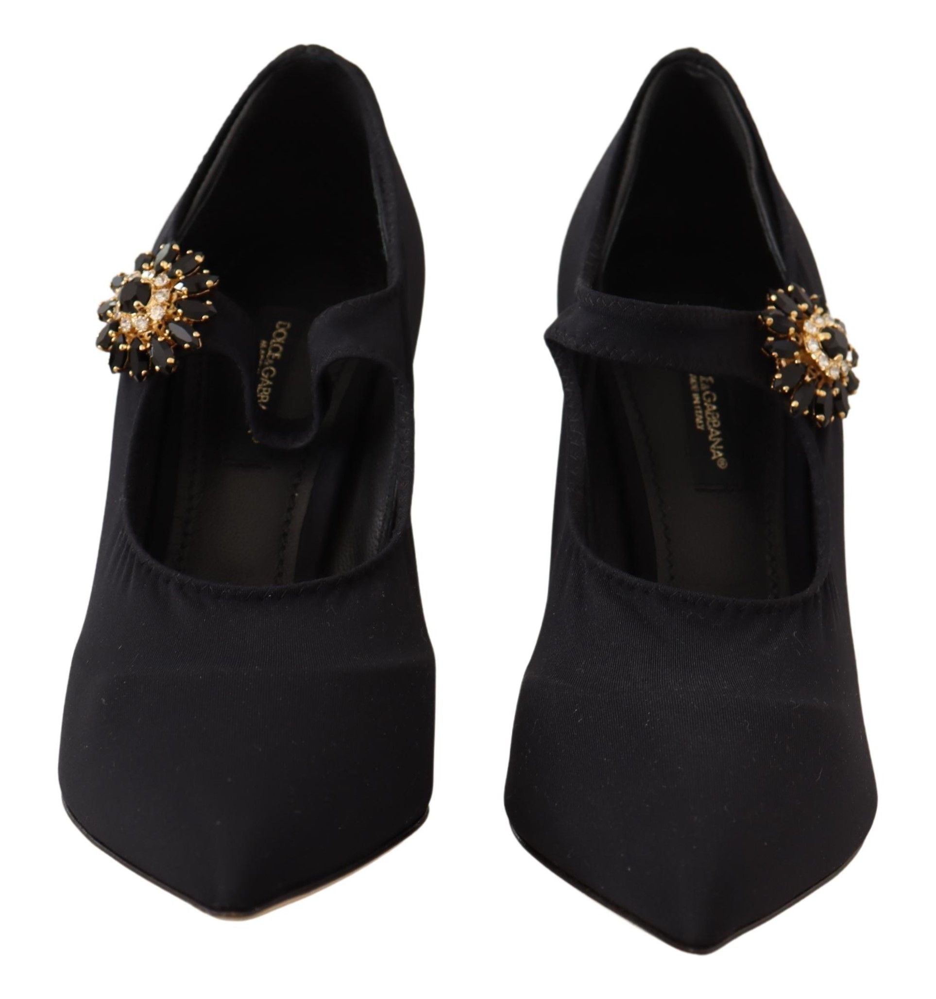 Step into luxury with these exquisite Dolce & Gabbana Mary Jane pumps. With an eye-catching appliqué adorned with silver, gold, and black decorative elements, these shoes are the epitome of sophistication and style. Crafted with a nylon and elastane blend for comfort, they feature a classic black hue that offers versatility and elegance for any occasion. The beige leather sole pairs beautifully with the luxurious leather inner and outer that whisper quality with every step you take, proudly made in Italy.
