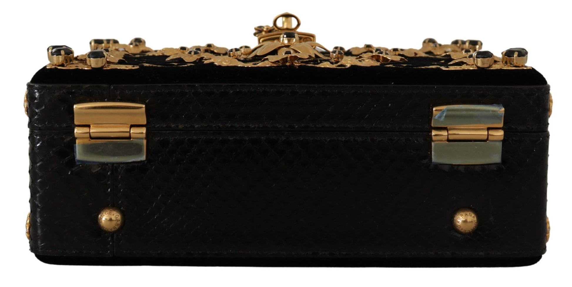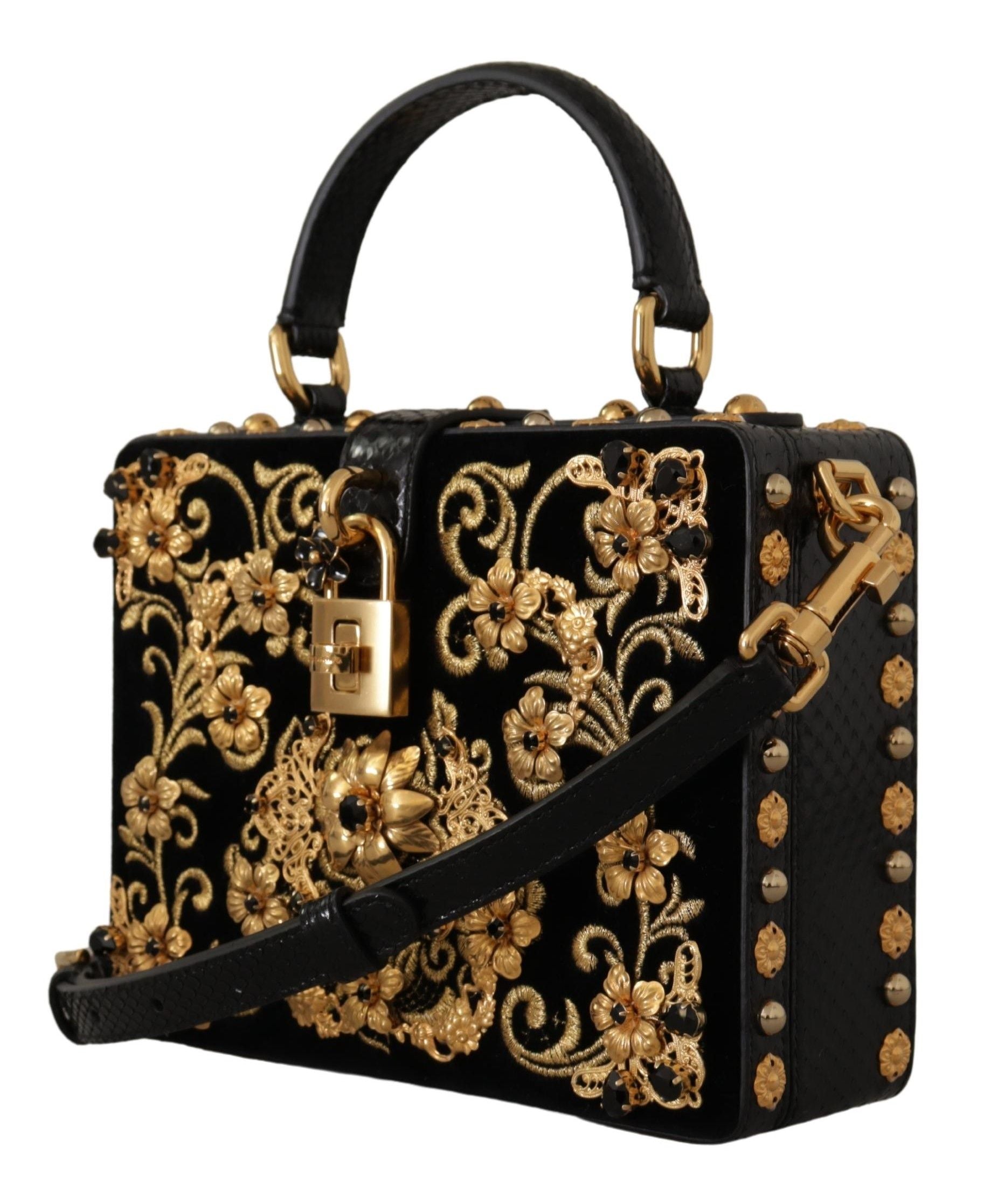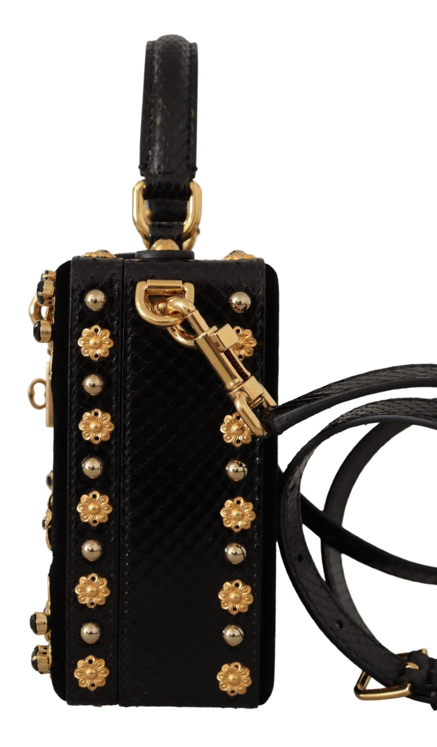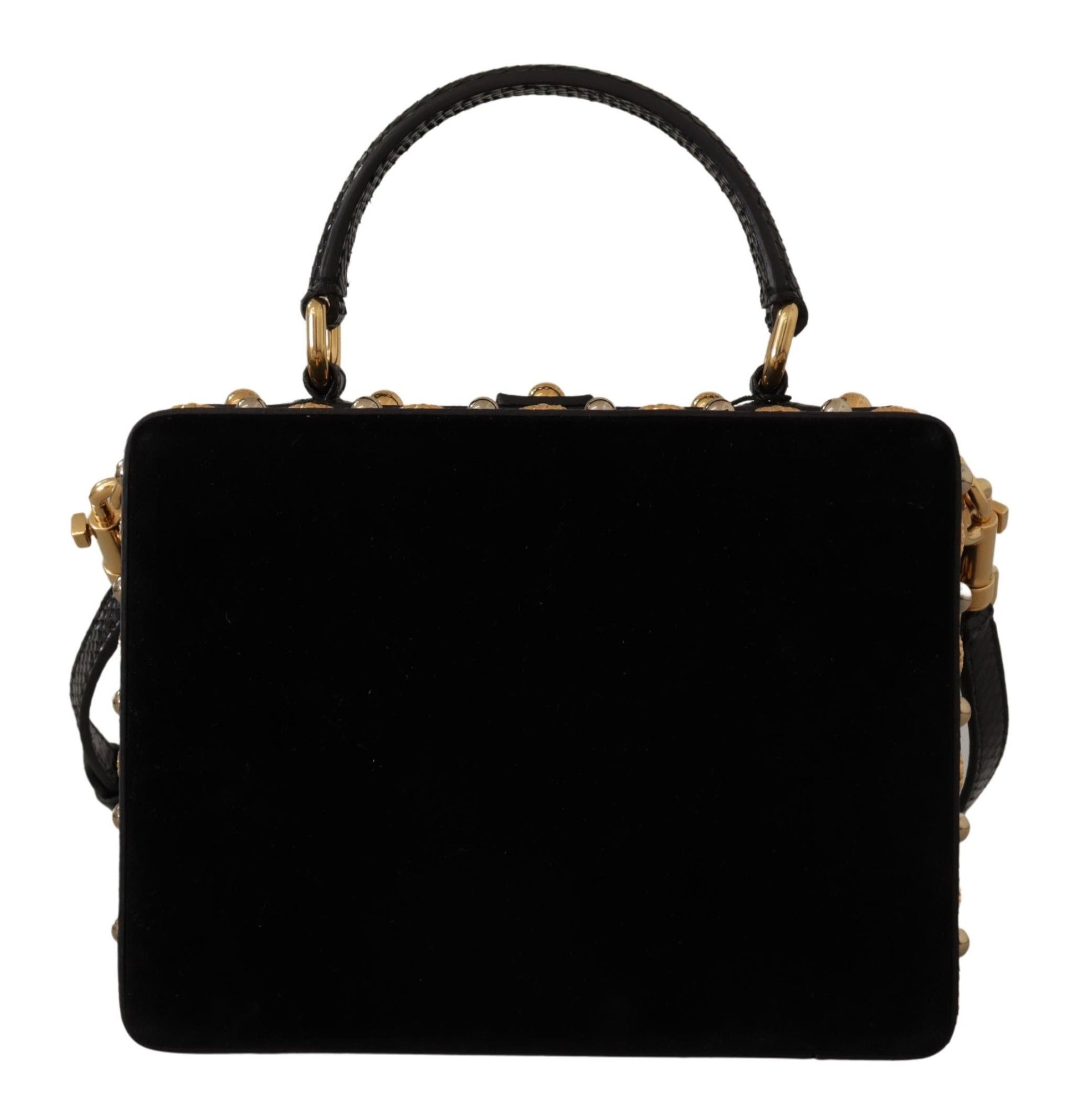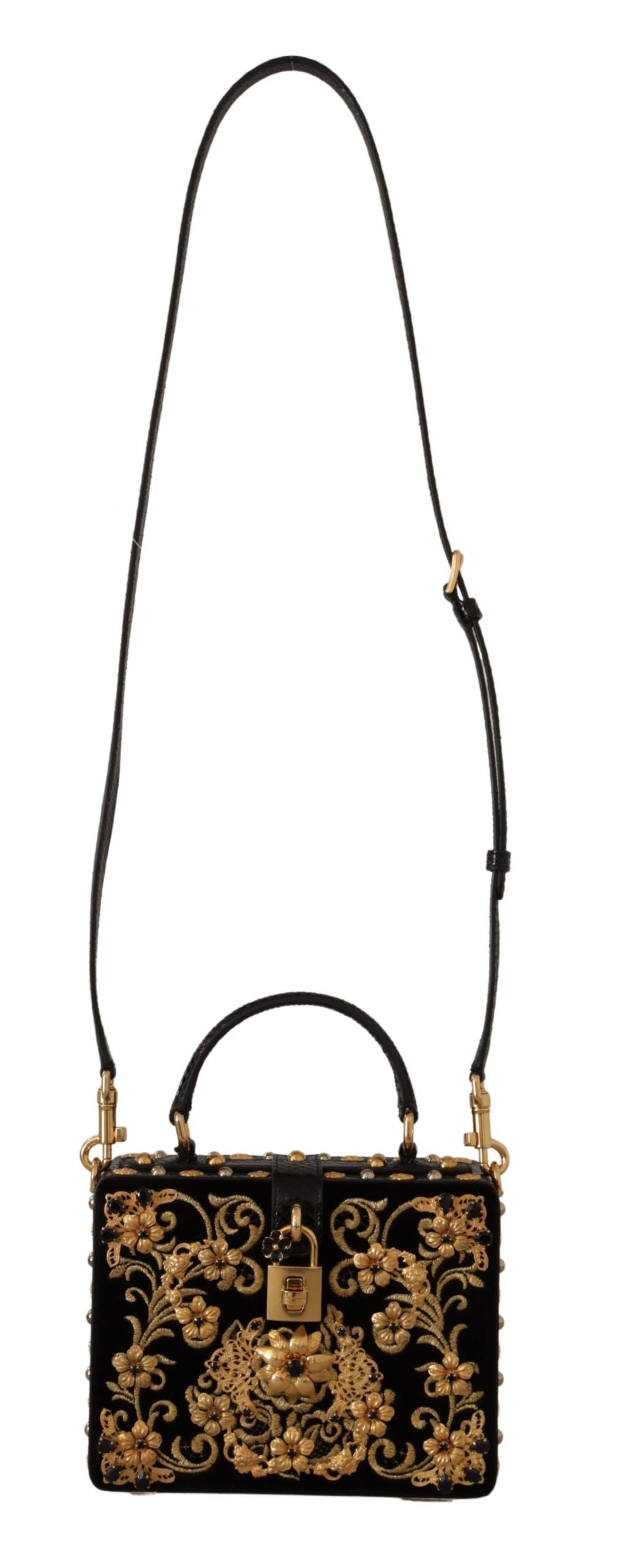 Indulge in the epitome of luxury with this exquisite Dolce & Gabbana Box Bag. Meticulously crafted with a blend of cotton and ayers, its black hue is elevated by shimmering gold metal accents and black crystal adornments. This masterpiece offers an adjustable and detachable ayers shoulder strap, providing versatility for any upscale event. The iconic padlock flap closure ensures your belongings are secure with a touch of elegance. Proudly made in Italy, this Dolce Box bag reflects exceptional craftsmanship and an air of exclusivity.