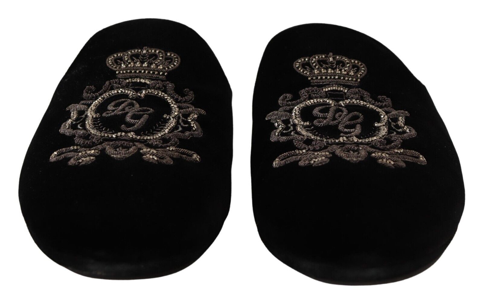 Indulge in the epitome of luxury with these Dolce & Gabbana velvet slides, perfect for elevating your casual ensembles. These gorgeous slides come brand new with tags, boasting a plush velvet exterior with a stunning matte sheen. Adorned with an intricately embroidered logo crown in silver threads and beads, these slides are a testament to exquisite craftsmanship. The insole is lavishly lined with smooth red satin, ensuring a touch of opulence with every step. Crafted in Italy, they feature a durable leather sole for long-lasting wear.