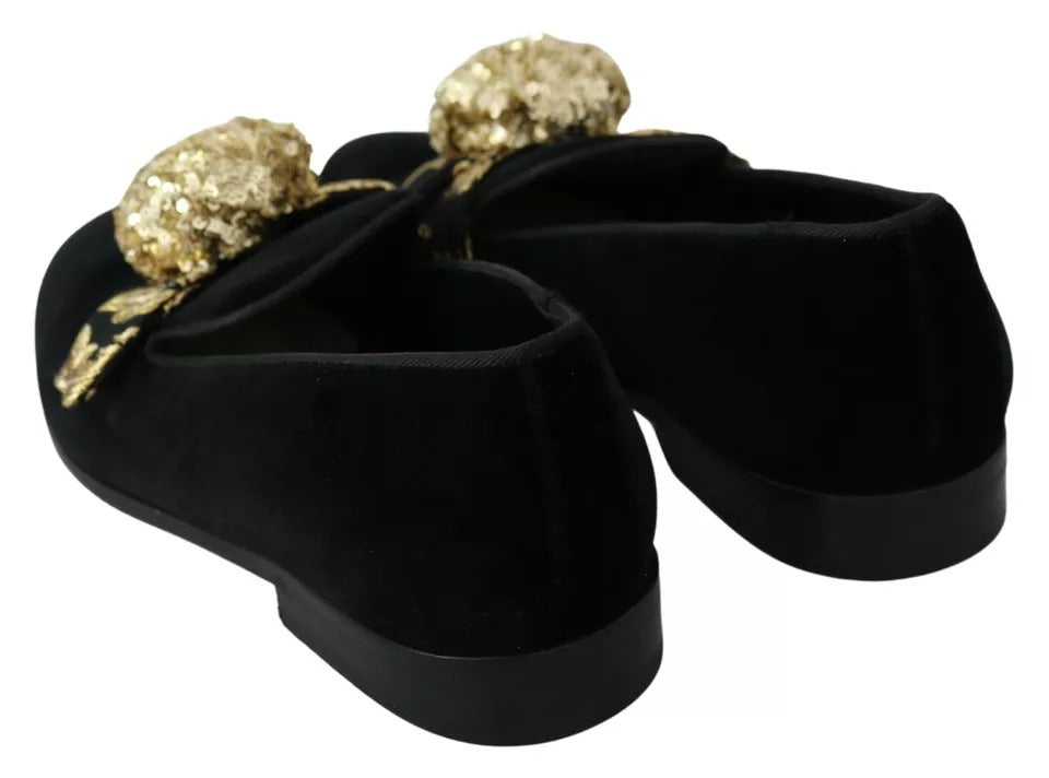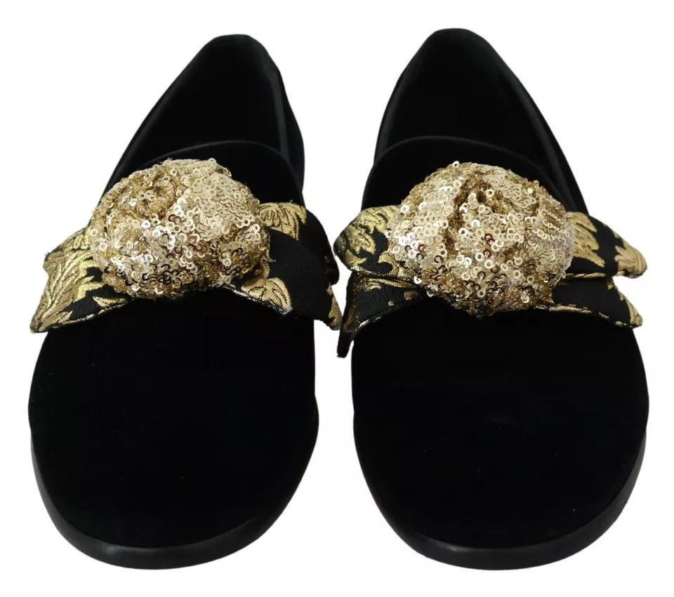 Black Velvet Gold Sequin Embellished Loafers Shoes