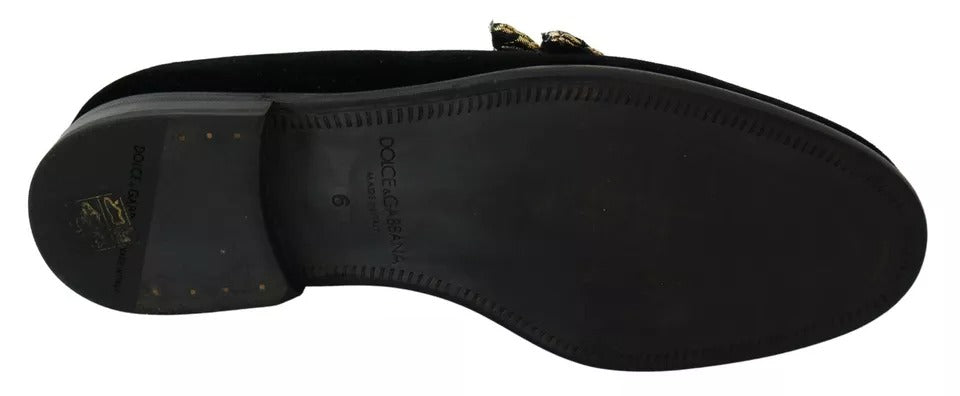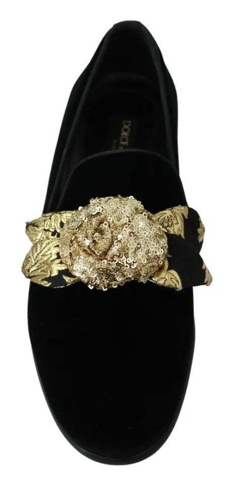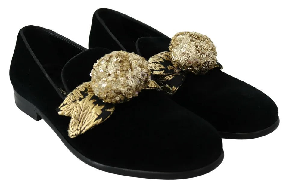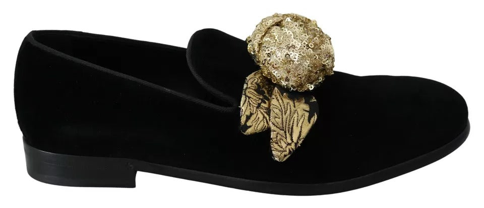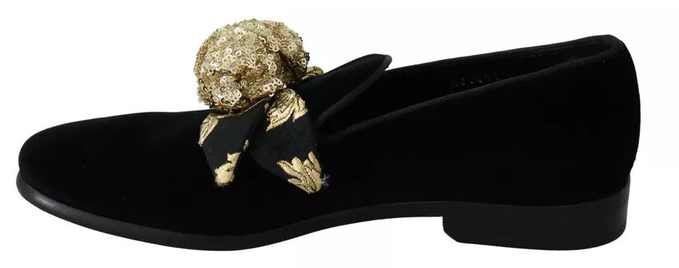 Gorgeous preowned with tags, 100% Authentic Dolce & Gabbana Loafers Black Velvet with Gold Sequined Embellished.