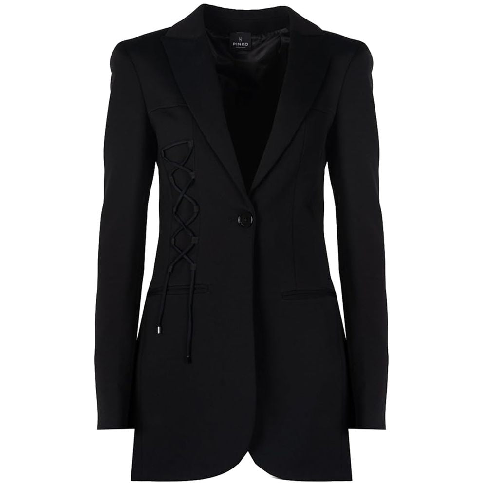 Pinko jacket in technical fabric stitch, one button closure, pointed lapels, decoration with crossed ribbon on the right side, two front pockets
