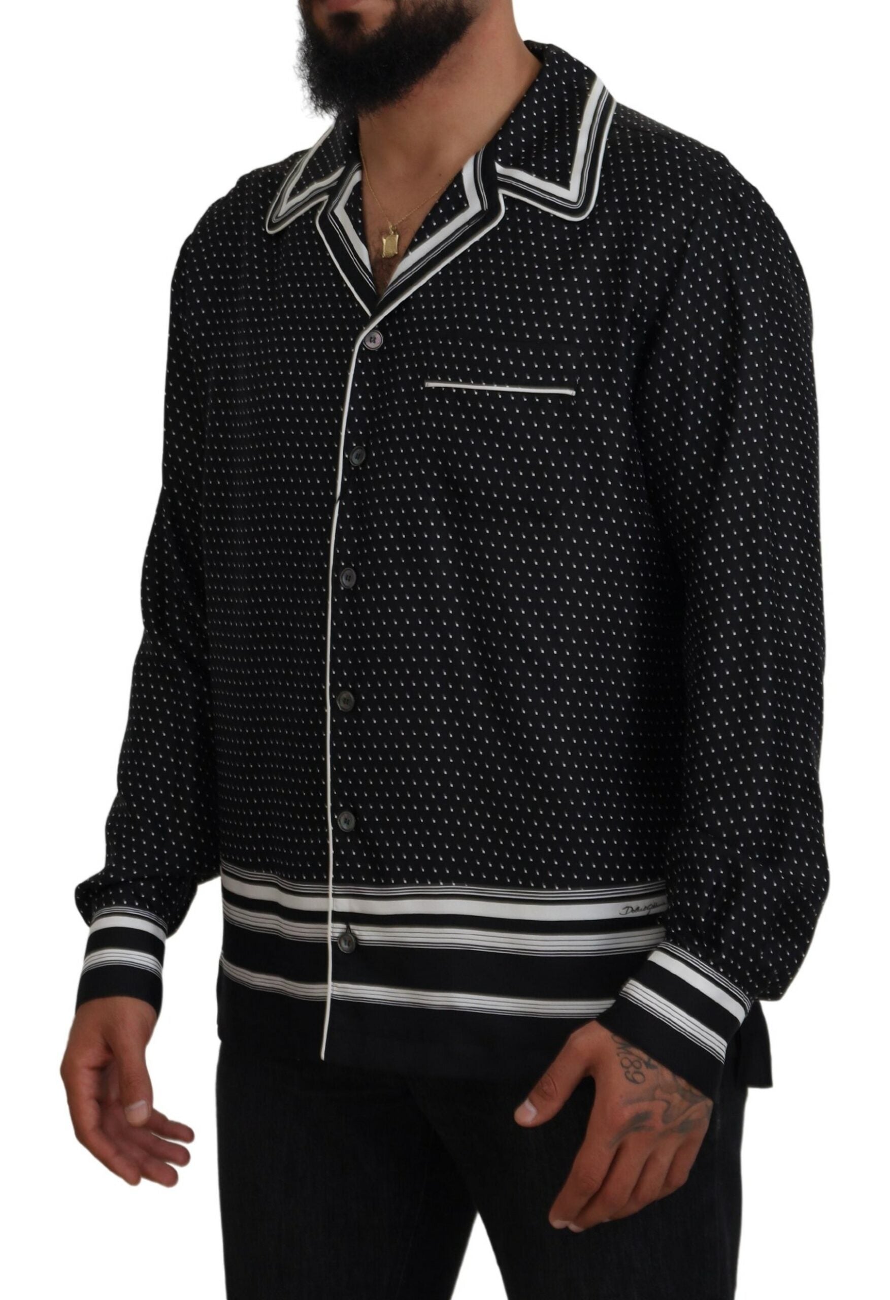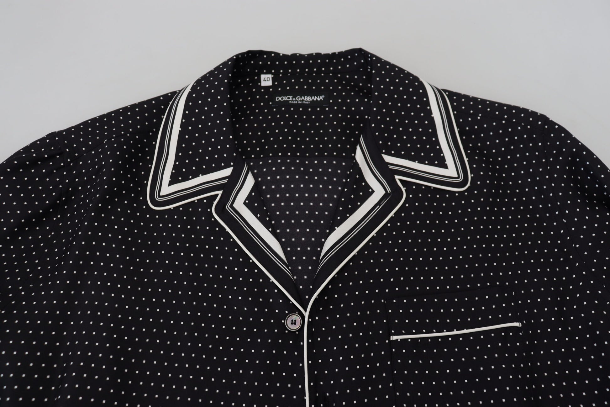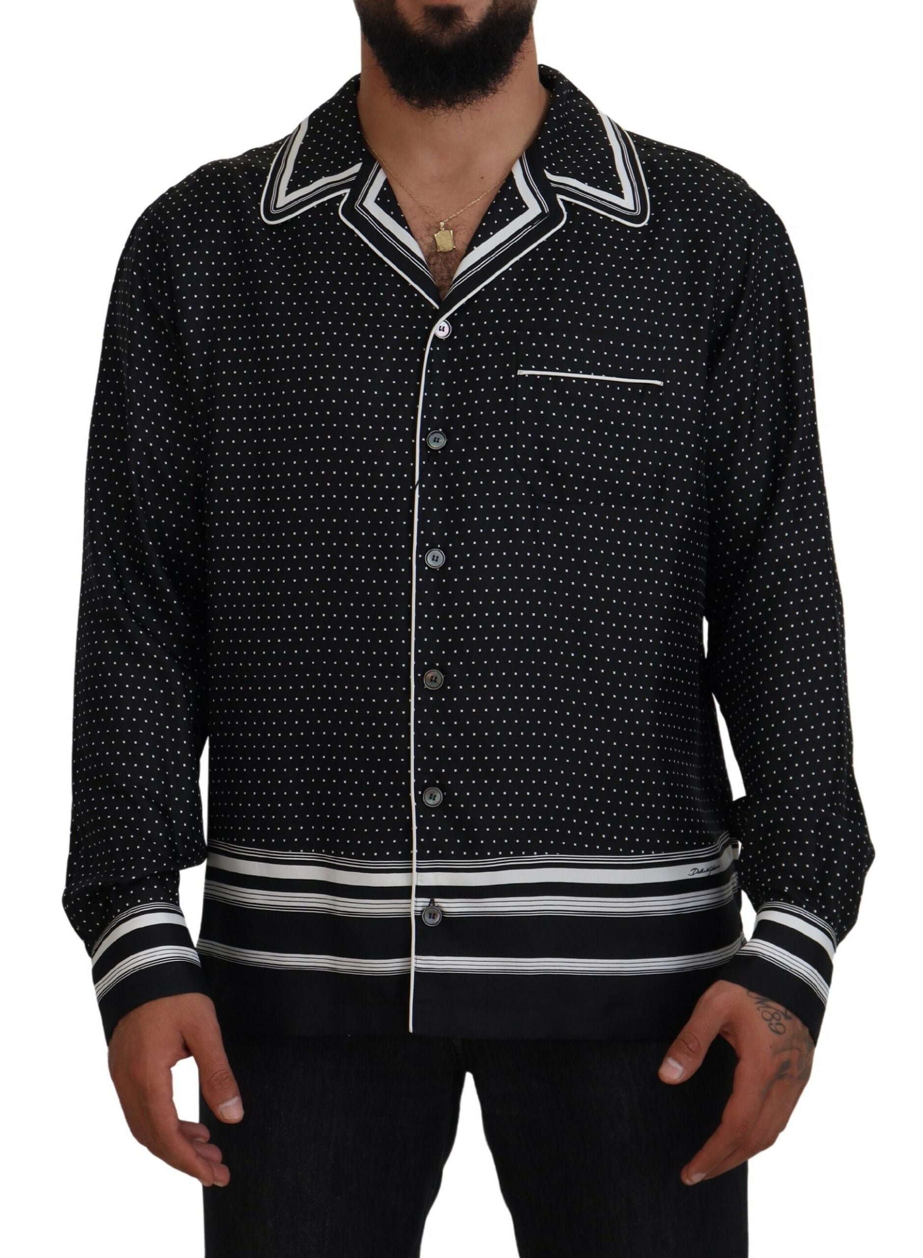Indulge in the epitome of luxury with this 100% Authentic, Dolce & Gabbana pajama top. Its sumptuous silk fabric and classic polka dot design exude effortless sophistication. Perfectly tailored with a regular fit, this pajama top features a timeless neck, lengthy sleeves, and a practical front button closure. Crafted in Italy, it infuses your loungewear with an element of high fashion. Experience elegance in comfort and style.