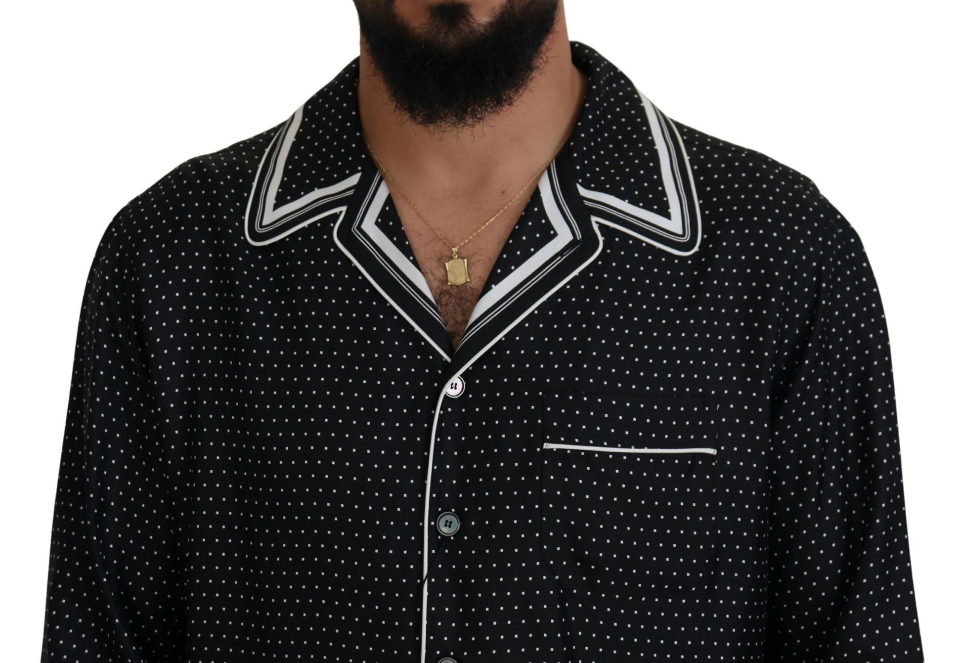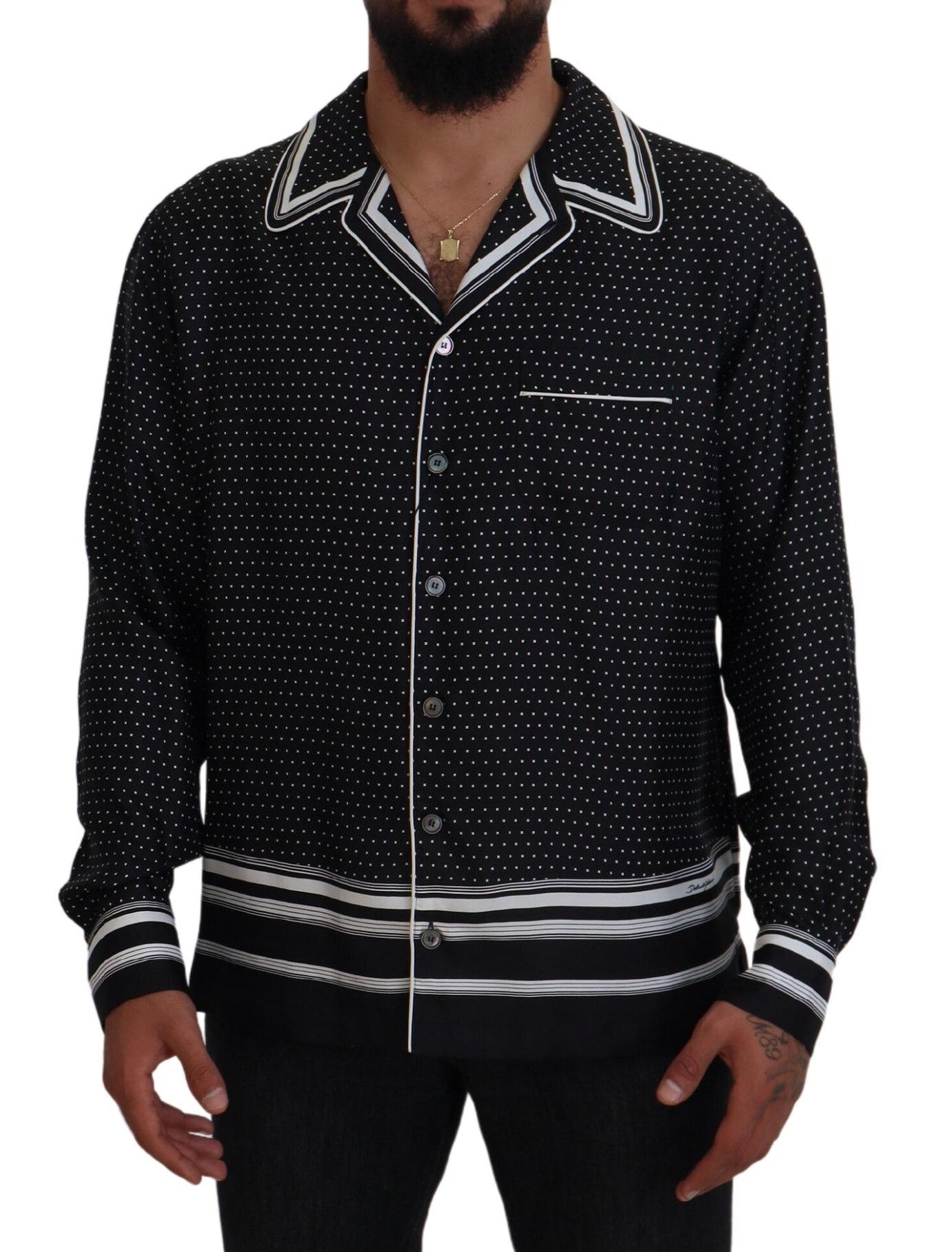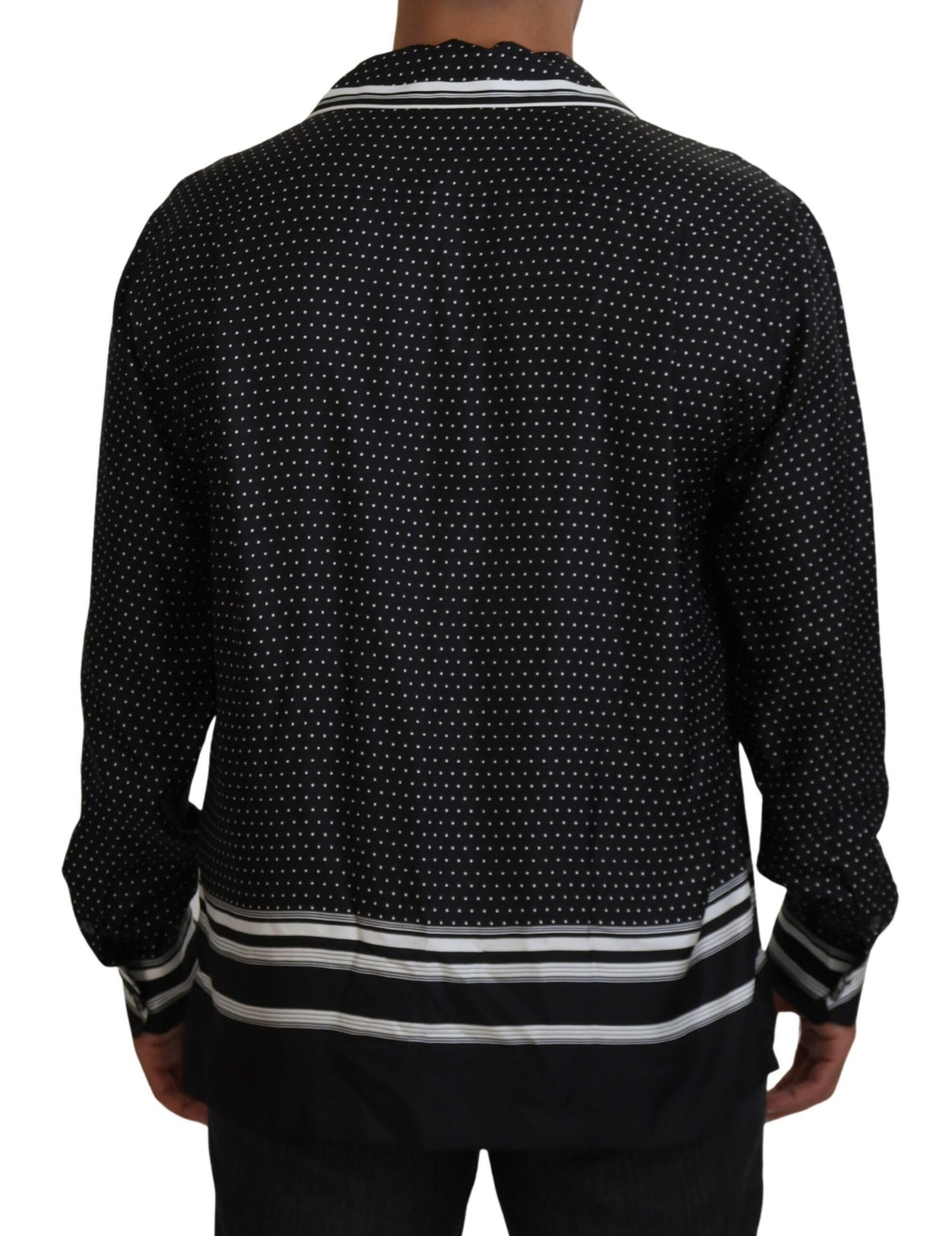 Indulge in the epitome of luxury with this 100% Authentic, Dolce & Gabbana pajama top. Its sumptuous silk fabric and classic polka dot design exude effortless sophistication. Perfectly tailored with a regular fit, this pajama top features a timeless neck, lengthy sleeves, and a practical front button closure. Crafted in Italy, it infuses your loungewear with an element of high fashion. Experience elegance in comfort and style.