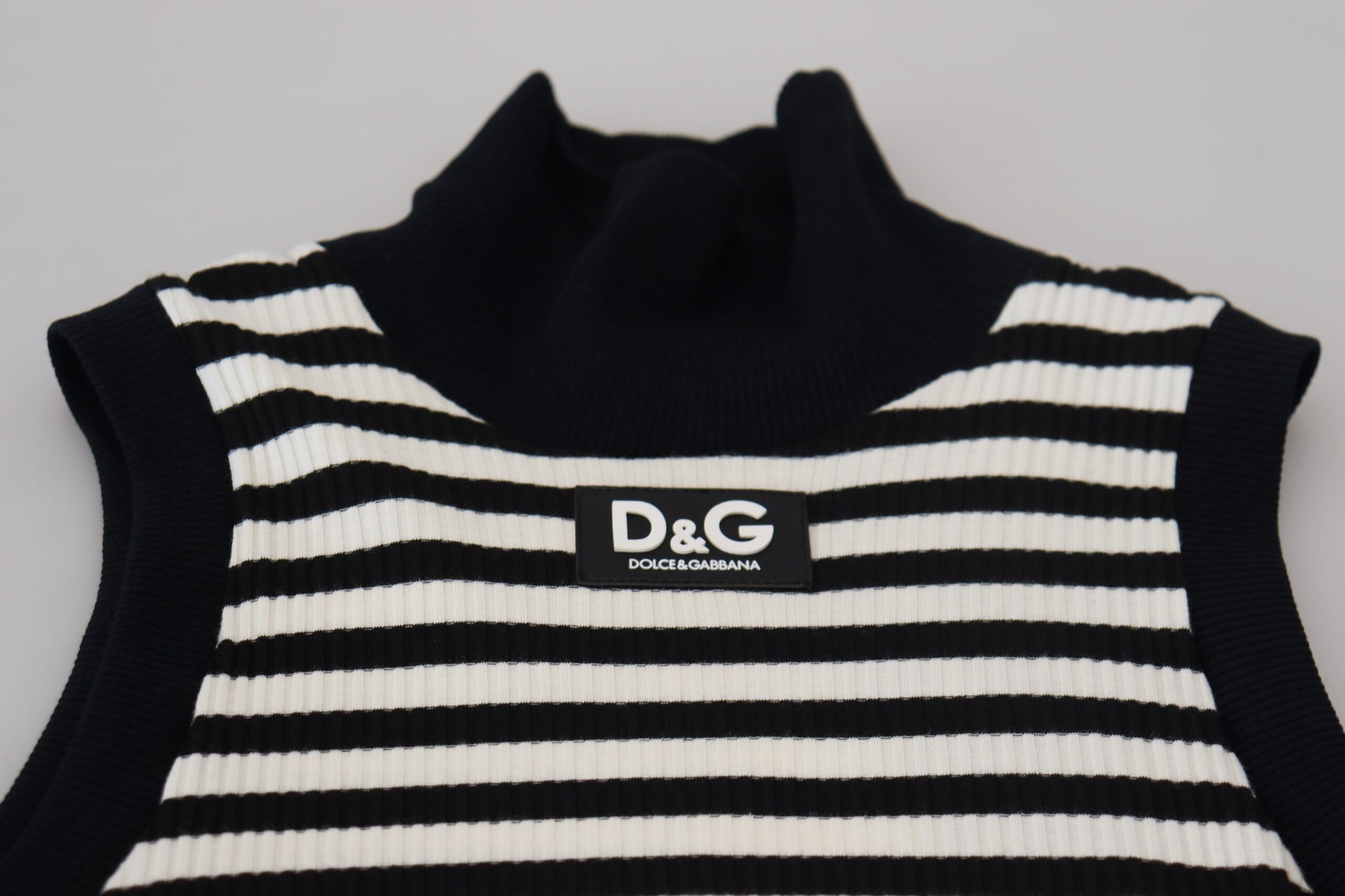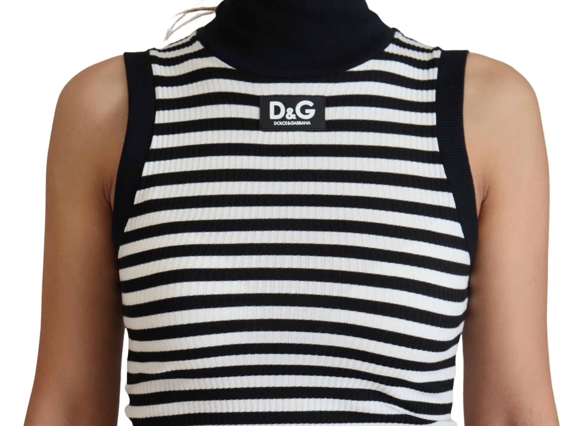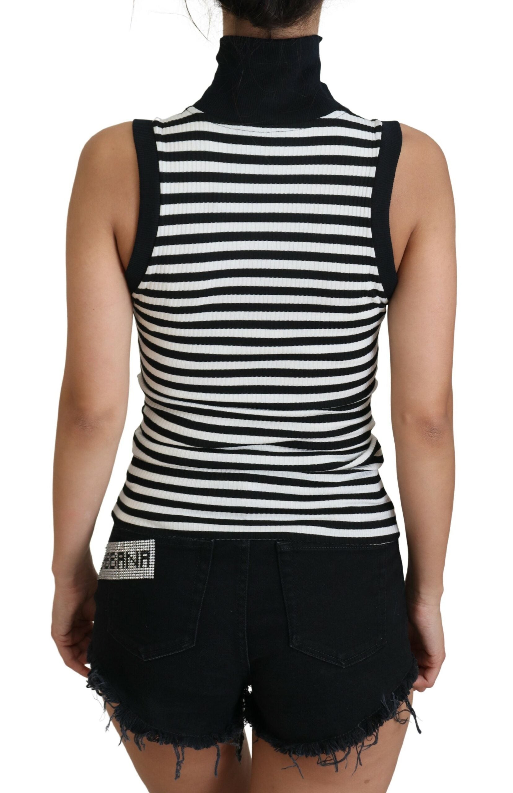 Indulge in the understated elegance of this chic, sleeveless turtleneck top by Dolce & Gabbana. Crafted from a soft blend of viscose and elastane, it offers both comfort and a figure-flattering fit. The classic black and white stripes exude timeless sophistication, making it a versatile addition to your wardrobe. Detailed with the discreet logo of the iconic brand, this top is a testament to Italian craftsmanship.