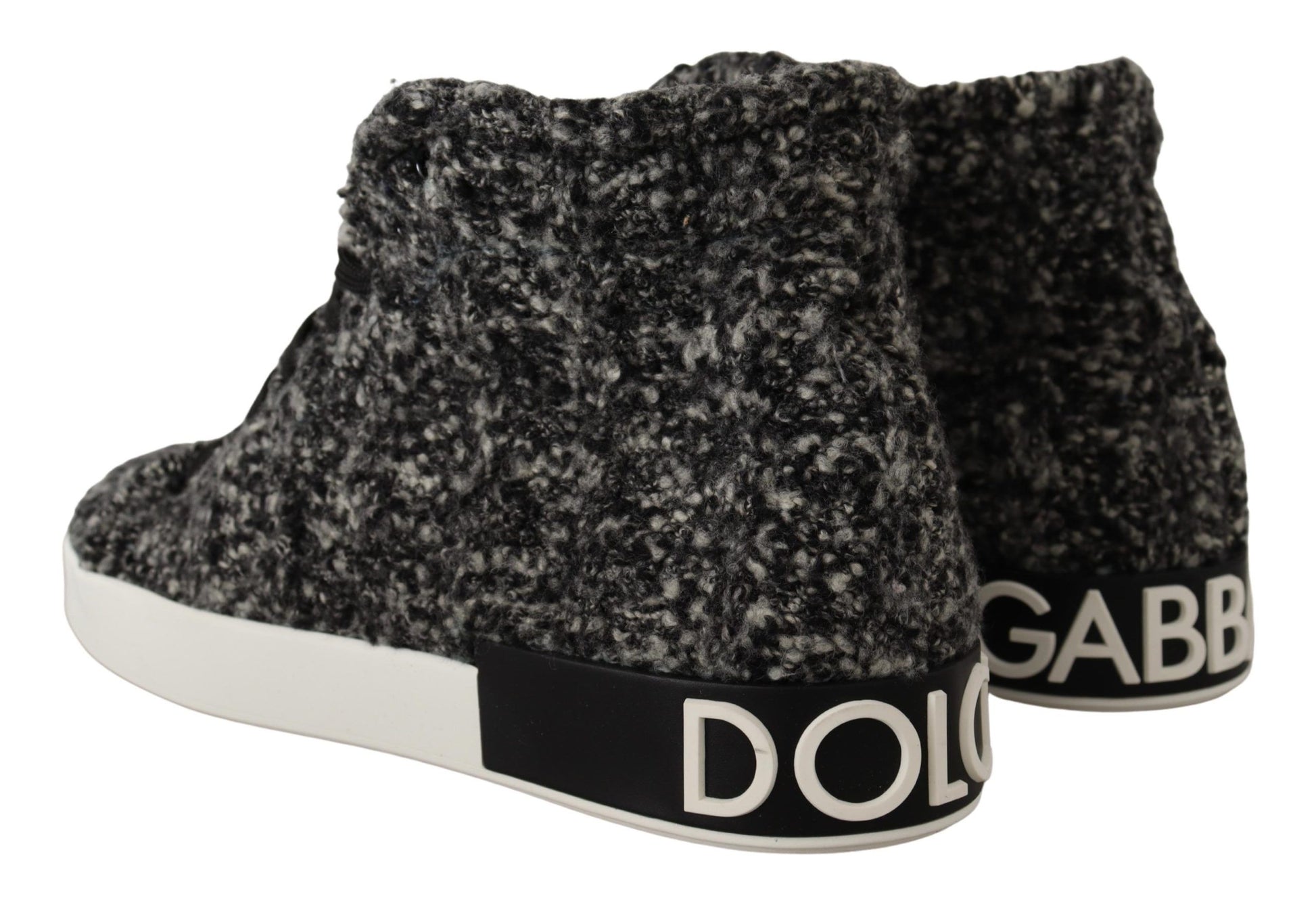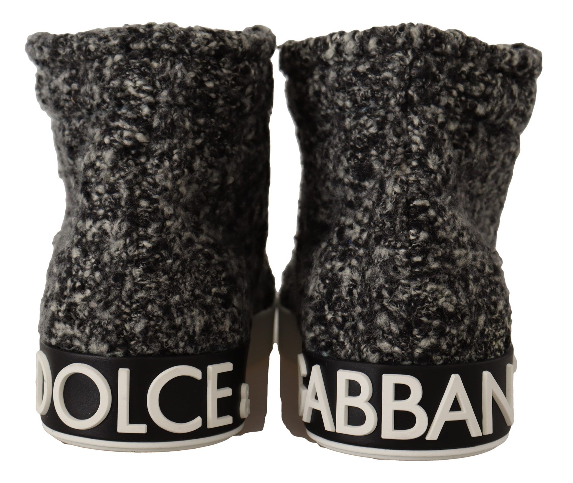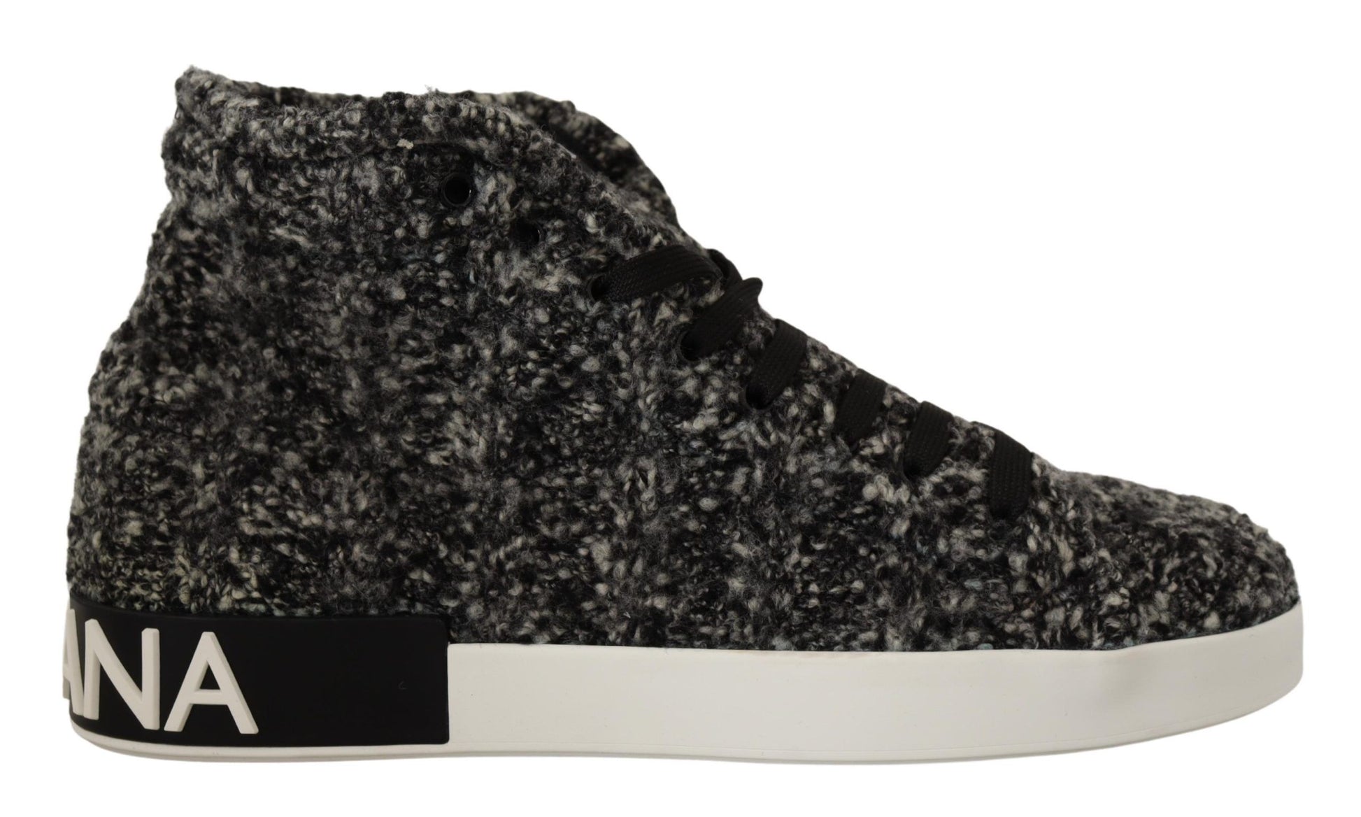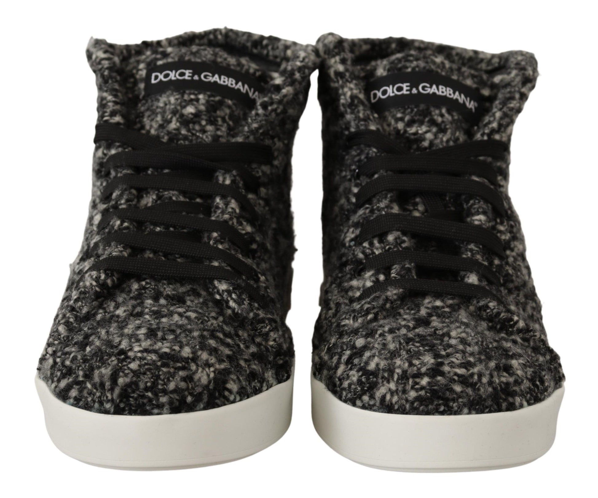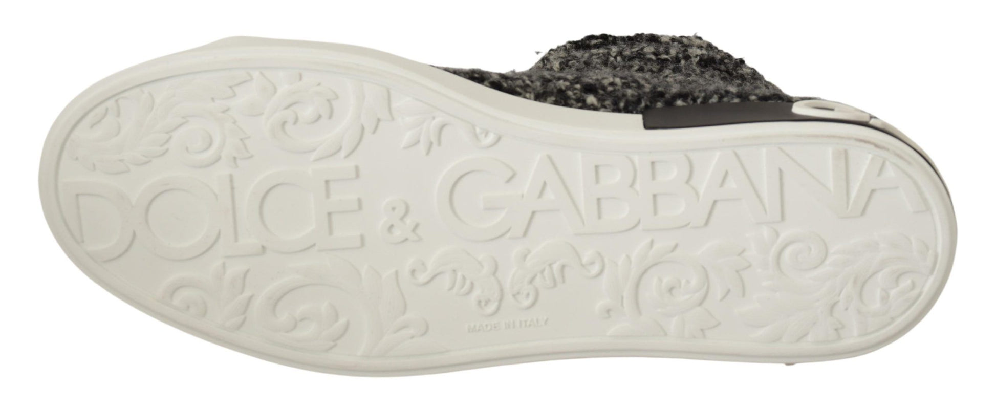 Steal the show with these sophisticated Dolce & Gabbana high top sneakers, an embodiment of style and comfort. Crafted with premium wool and cotton blend, these black sneakers are a versatile addition to your shoe collection, perfect for making a statement on any occasion. Their durable rubber sole and striking logo details ensure both longevity and brand recognition. Designed and made in Italy, these sneakers are a true testament to luxury fashion.