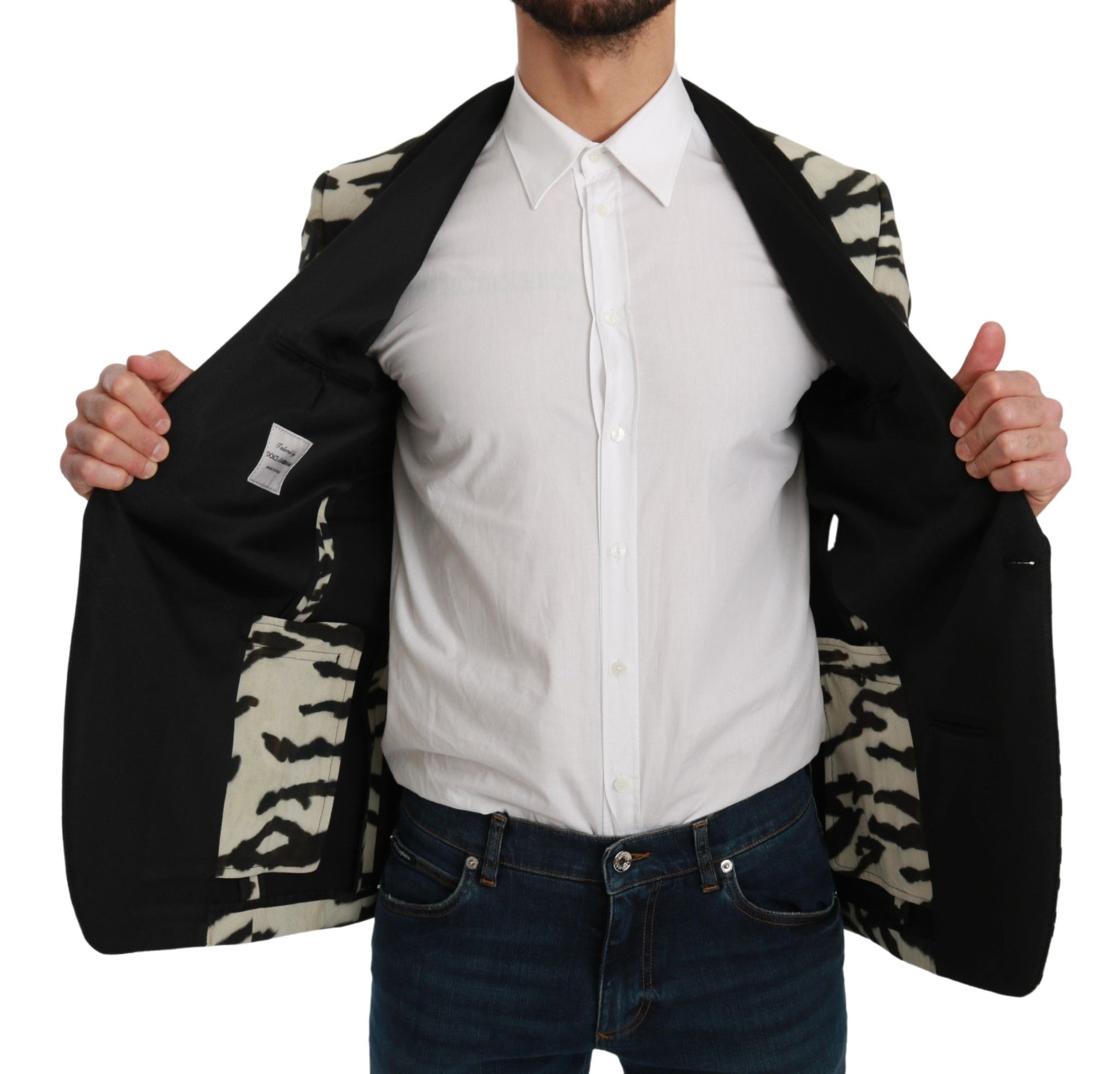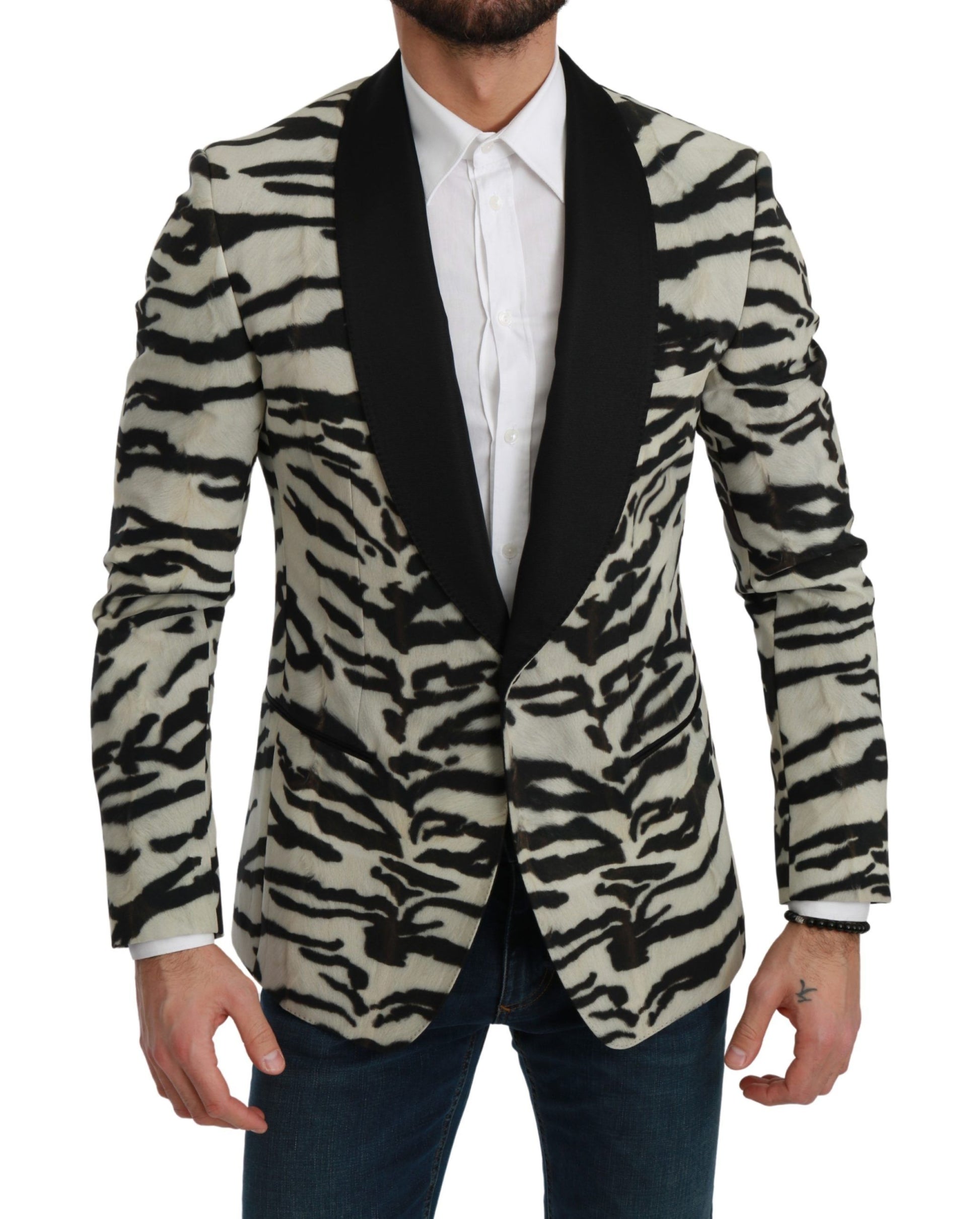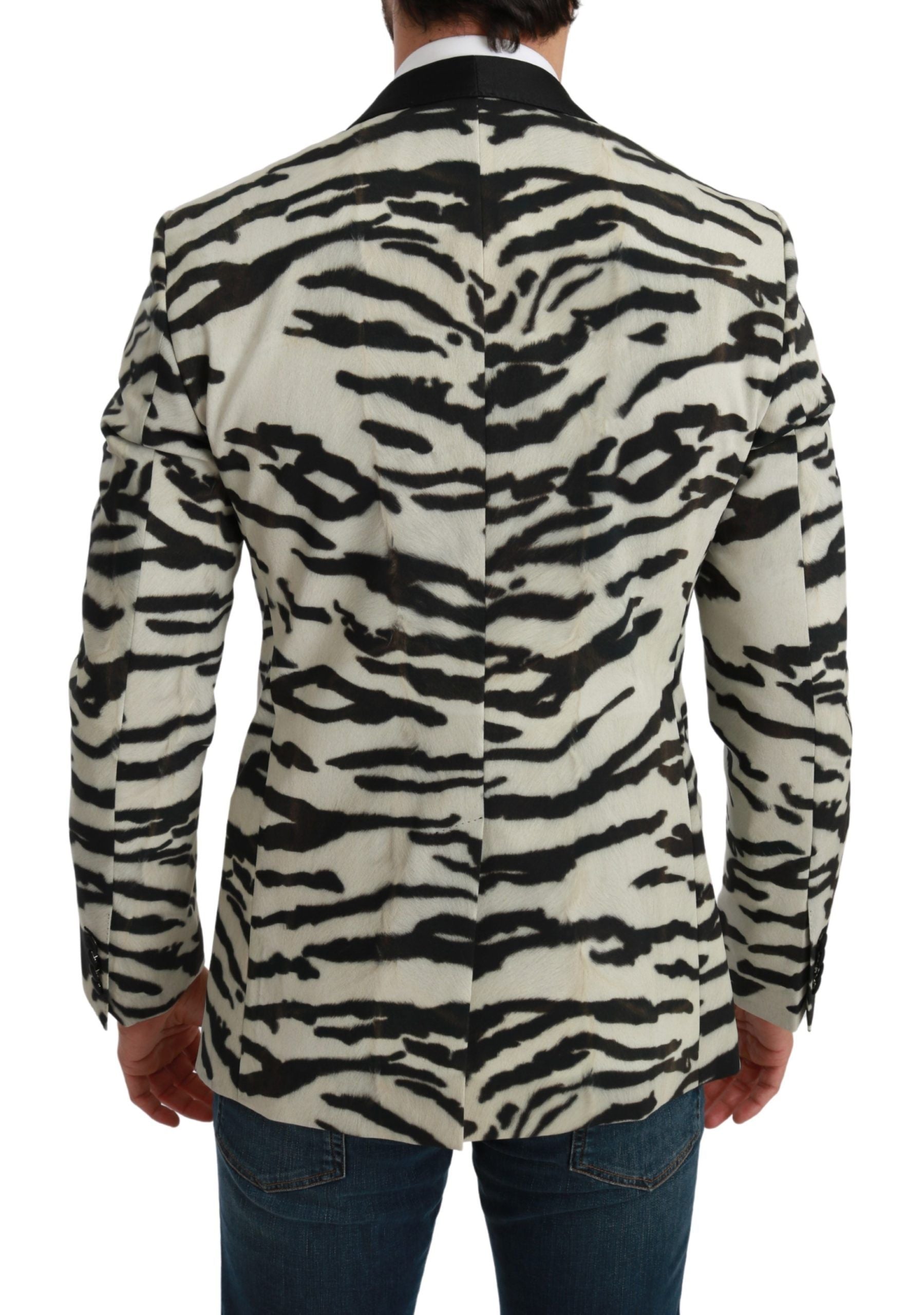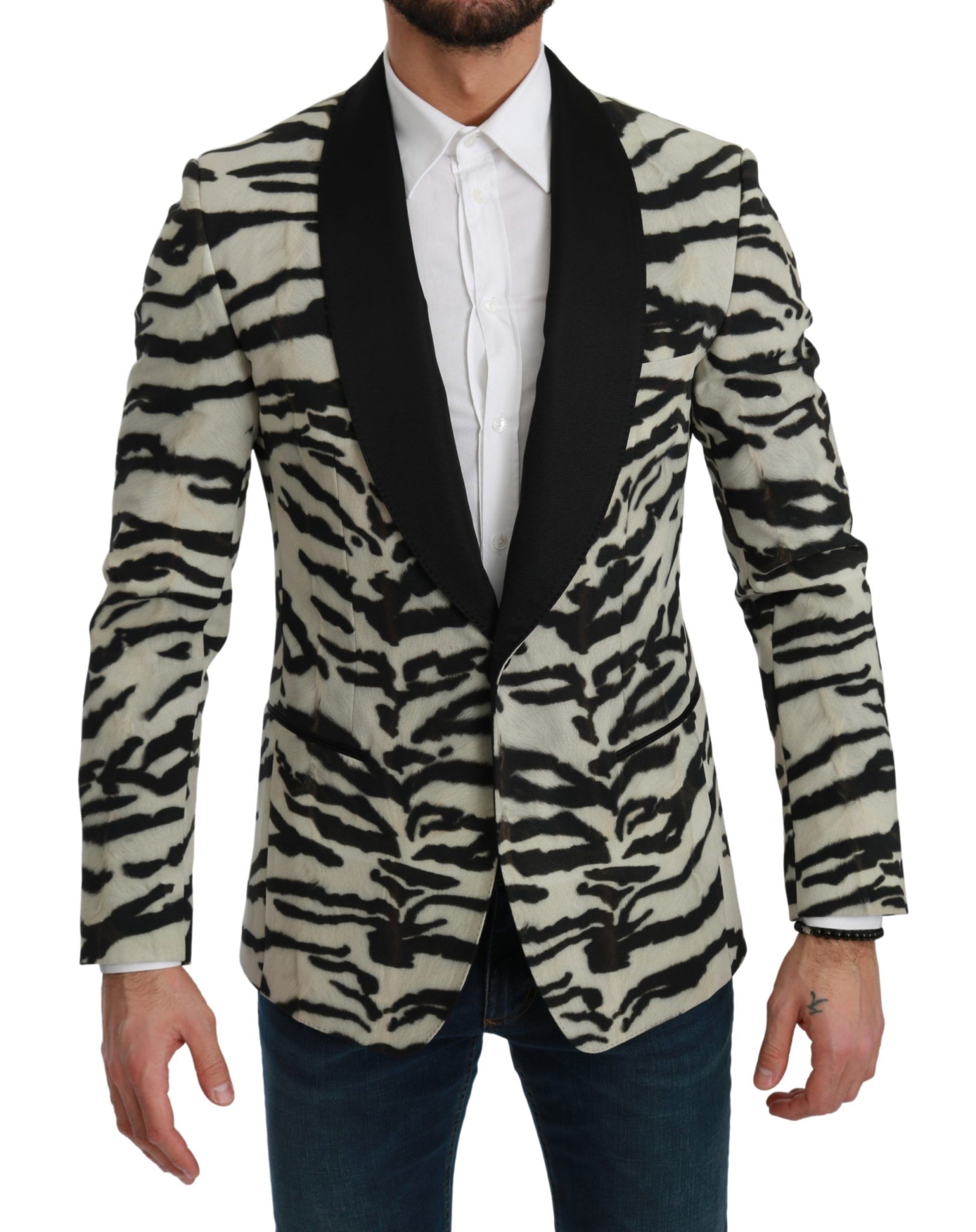 Unleash your sartorial spirit with a touch of the wild in this exquisite Zebra Print Silk Formal Blazer from the house of Dolce & Gabbana. Tailored to perfection, this slim fit blazer features a single-breasted design with a one-button front closure, perfect for upscale events or making a fashion-forward statement in the boardroom. The blazer boasts three elegant front pockets and three practical inside pockets, ensuring both style and utility. Meticulously crafted in Italy, it reflects the brand’s commitment to superior quality and design.