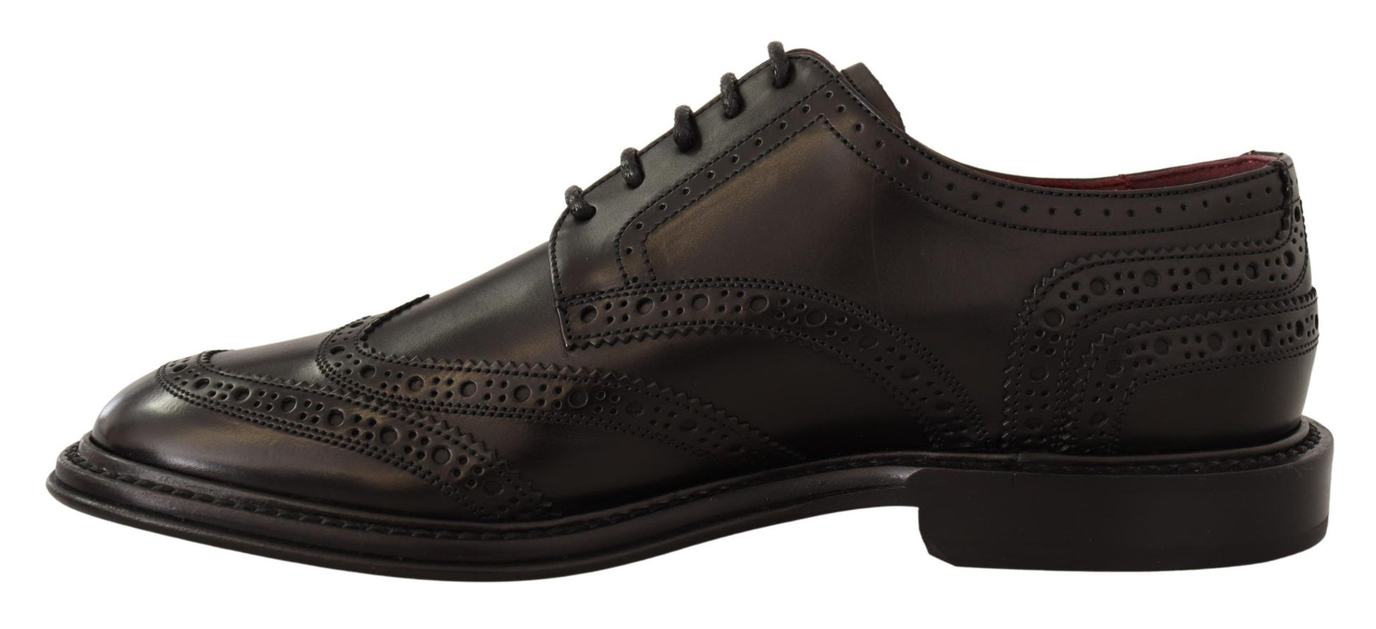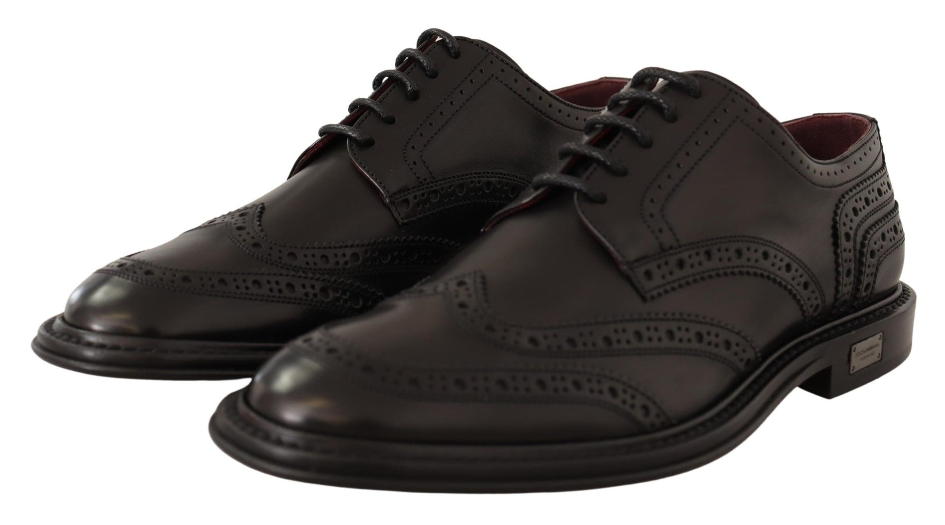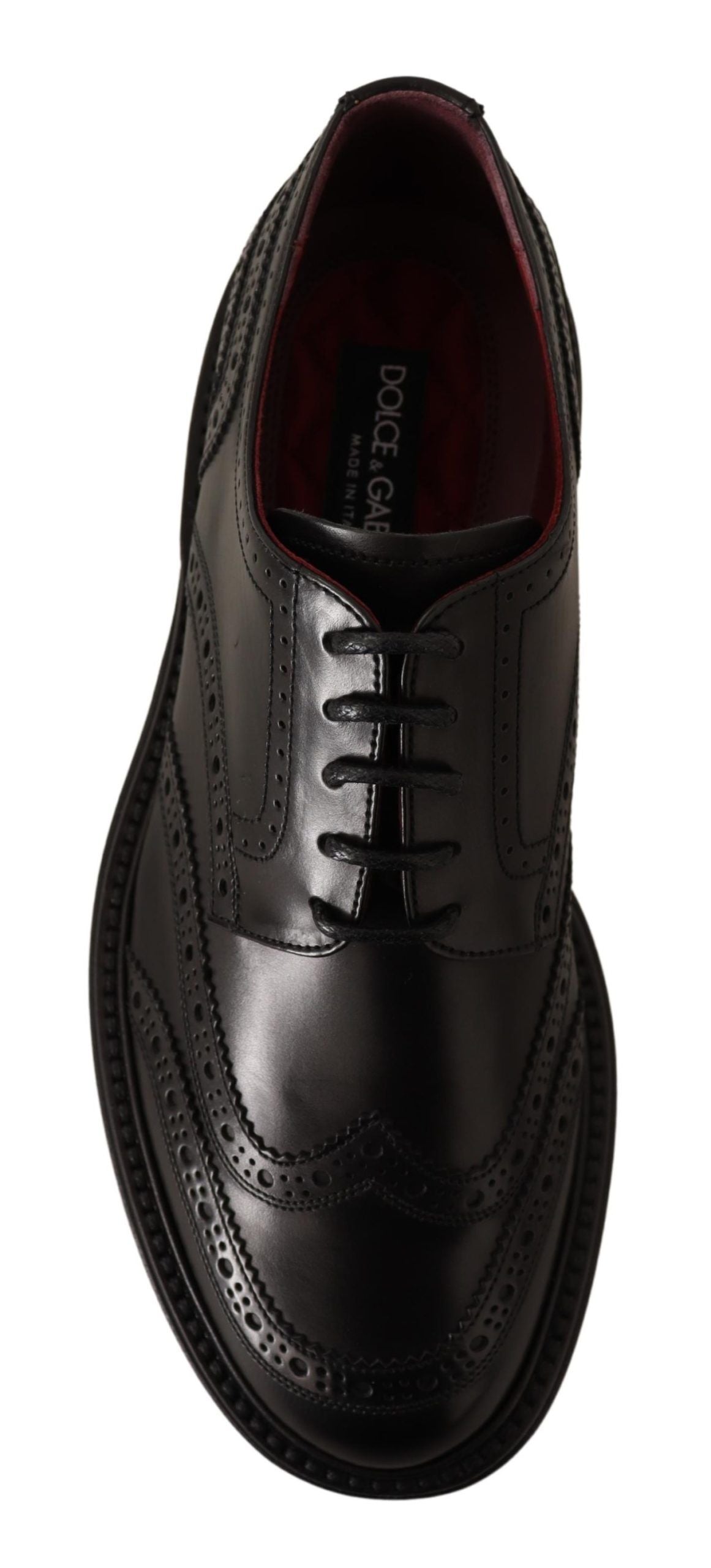 Step into sophistication with these exquisite black leather Derby shoes by Dolce & Gabbana. These stunning shoes feature intricate perforations, a lace-up front, and a dual-toned leather and rubber sole that blends impeccable style with durability. Crafted in Italy, they signal craftsmanship and luxury synonymous with the brand. Perfect for formal occasions, these shoes infuse elegance into every stride.
