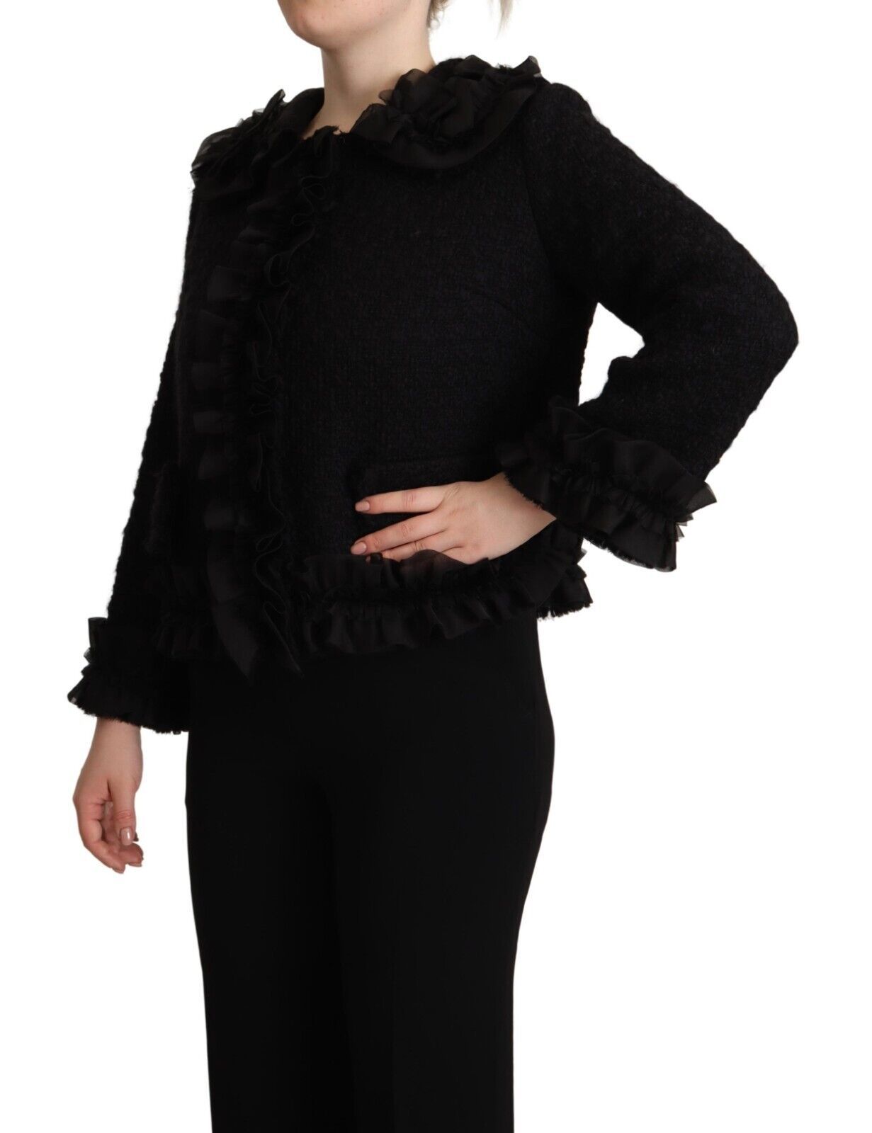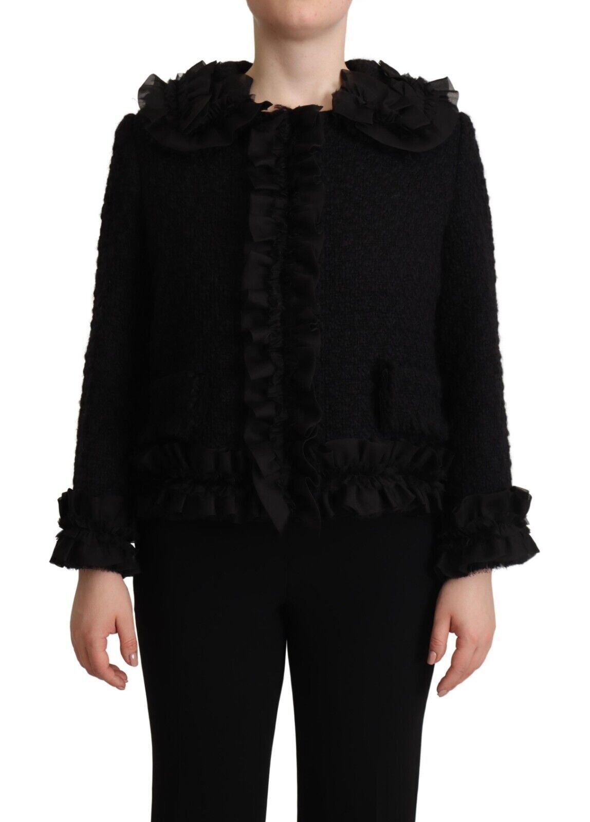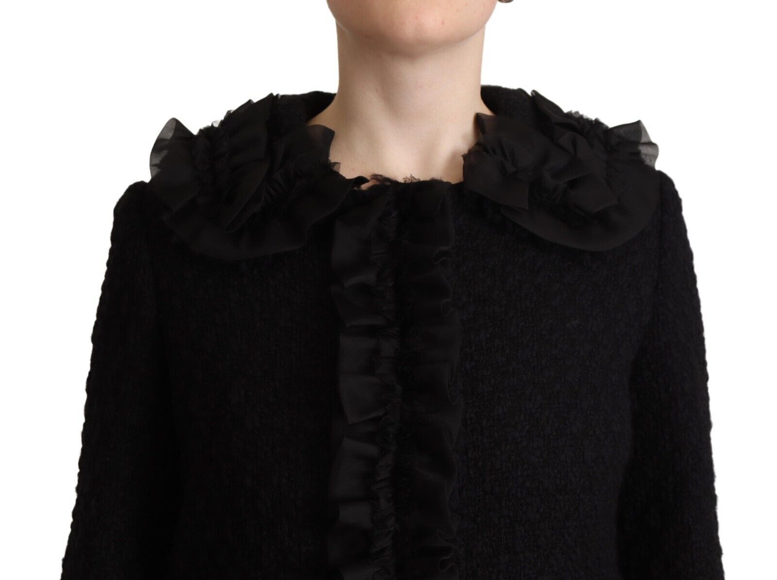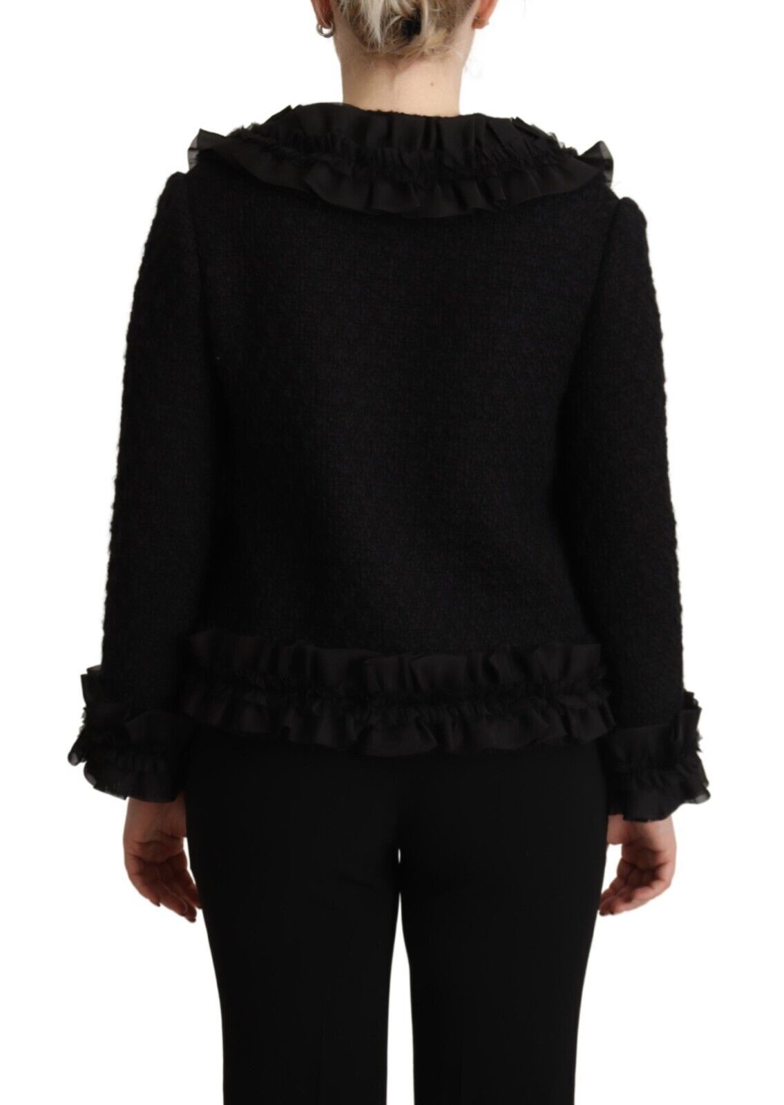 Experience the epitome of Italian craftsmanship with the luxurious Dolce & Gabbana ruffled jacket. This gorgeous new-with-tags piece exudes sophistication, with a design emphasizing femininity and the finest materials. Its perfect black hue offers a timeless appeal, paired effortlessly with an array of outfits for any stylish event.