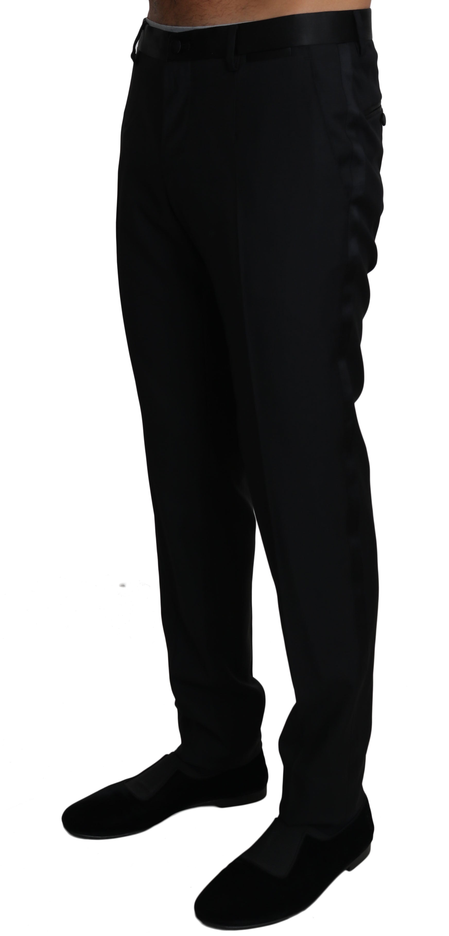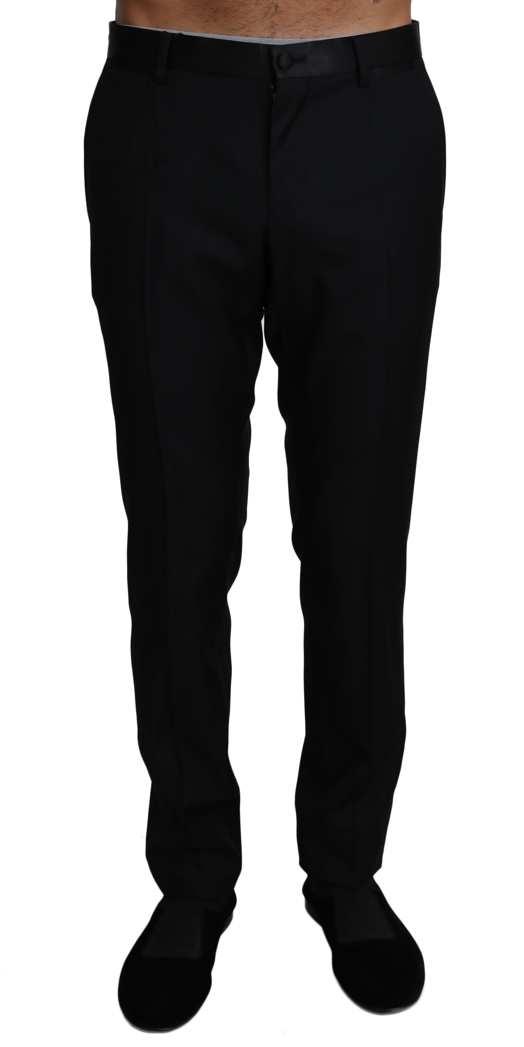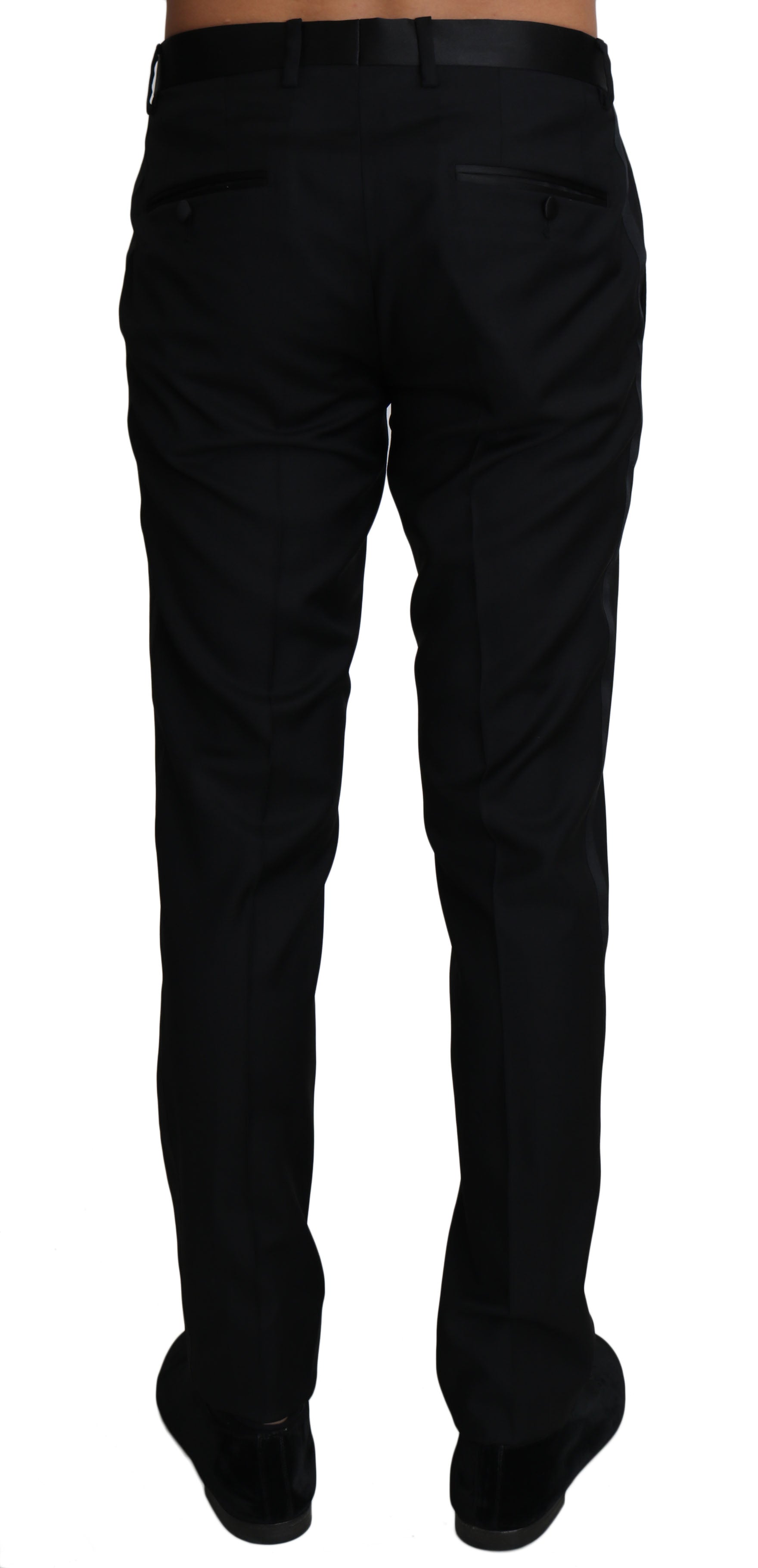 Step into luxury with these exquisite Dolce & Gabbana formal pants. Crafted from a premium blend of wool, silk, and polyester, these pants are the epitome of elegance and sophistication. The classic black color ensures a versatile piece that can be dressed up or down for any occasion, while the Italian craftsmanship speaks volumes of its exclusivity and attention to detail. Perfect for making a polished impression, these pants feature a sleek button and zipper fly closure, convenient front and back pockets, and are brand new with tags, guaranteeing their authenticity and pristine condition.