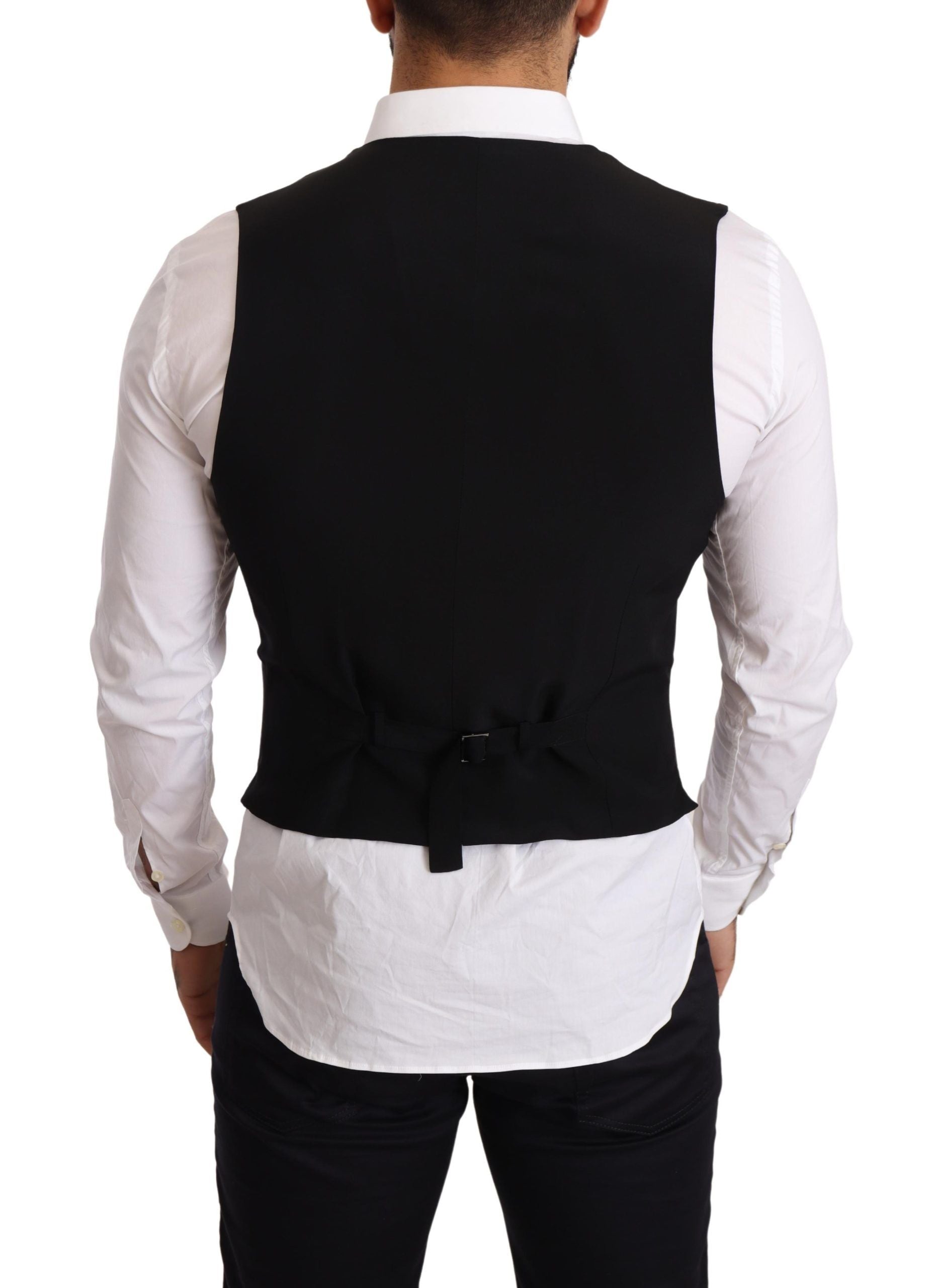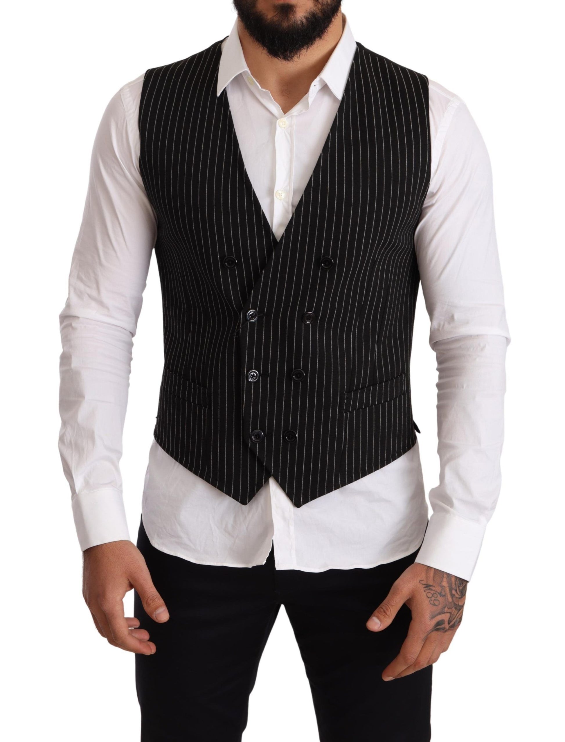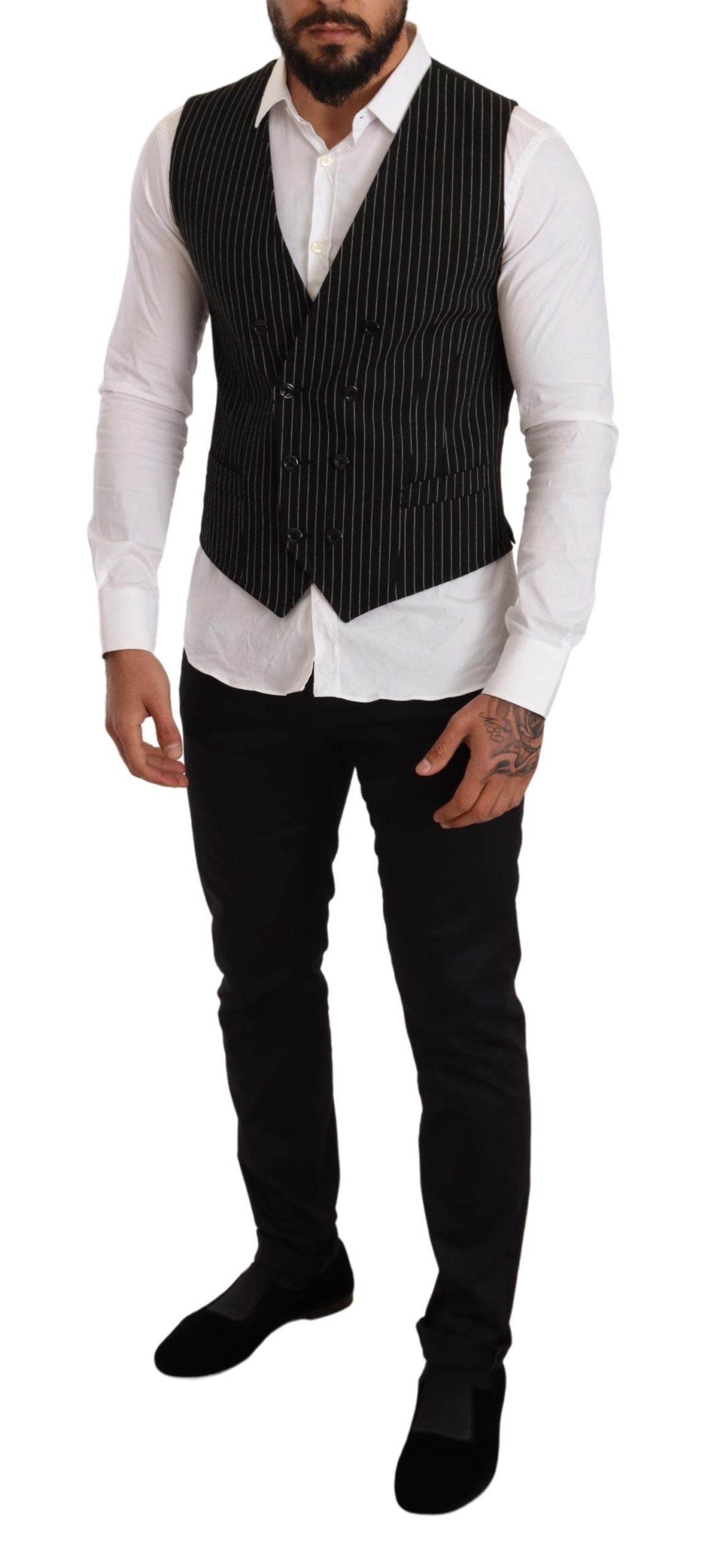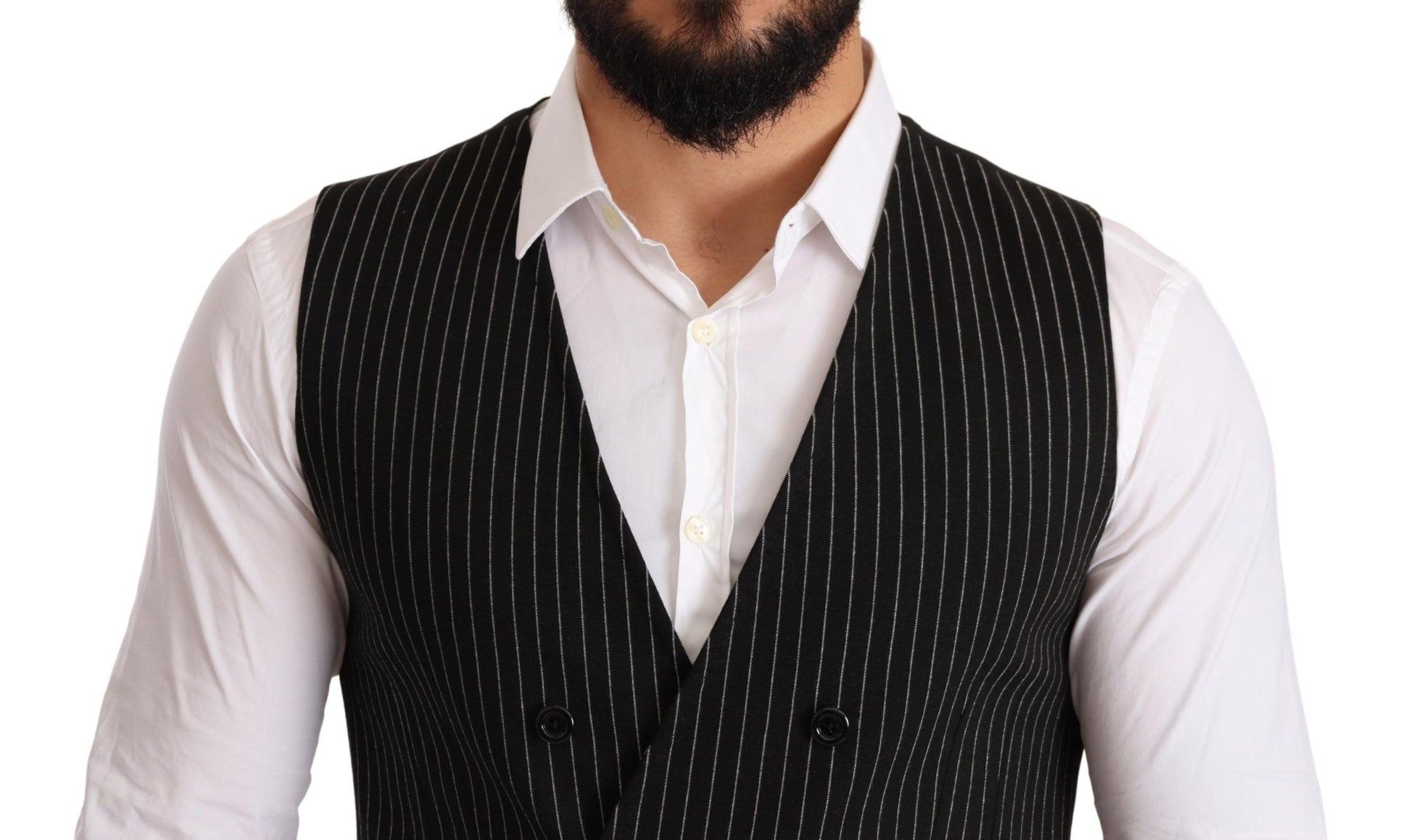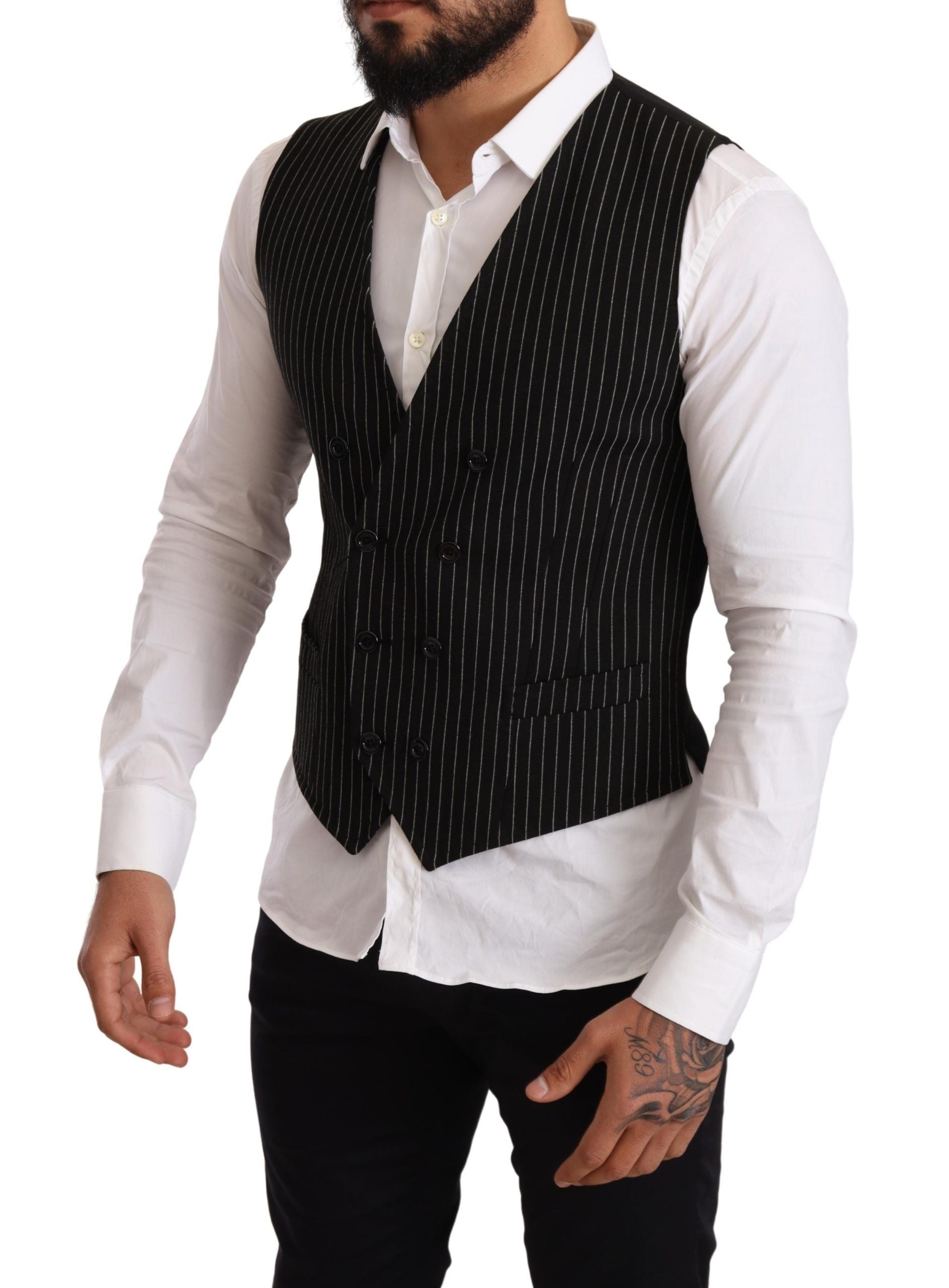 Exude timeless elegance with this Dolce & Gabbana Formal Dress Vest, a piece that promises to elevate your wardrobe. Boasting an immaculate design with a classic black and white striped pattern, this vest is tailored to perfection from the finest 100% Virgin Wool. A seamless blend of sophistication and Italian craftsmanship, this garment features a sleek front button closure and subtle logo details, demonstrating exclusivity and style. Made in Italy, it adheres to the highest standards of quality and luxury fashion.
