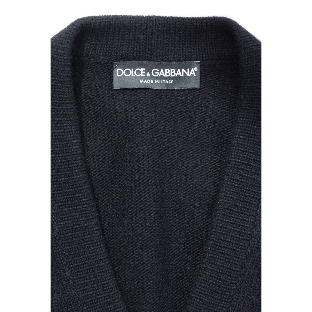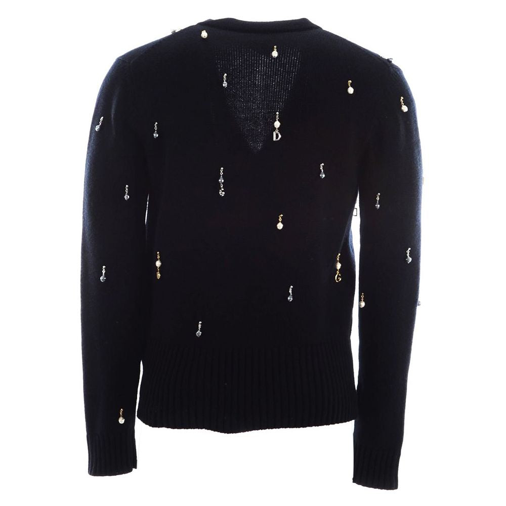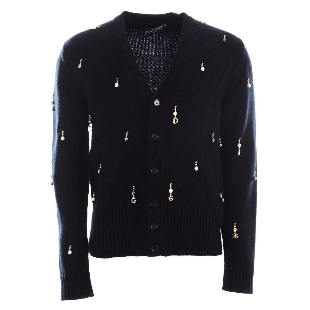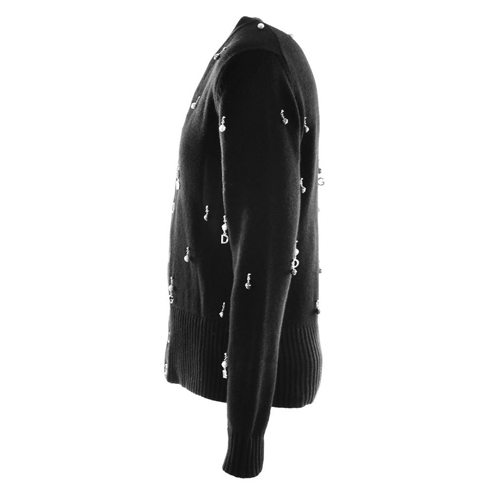Discover the epitome of luxury knitwear with this sophisticated black wool cardigan, featuring a V-neck and classic button closure. The cardigan is beautifully adorned with metallic pearl embellishments, creating a dazzling effect that elevates any outfit. Expertly crafted in Italy, this piece boasts ribbed sleeves and hem for a comfortable, snug fit that exudes elegance.