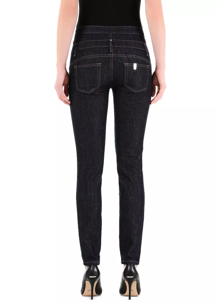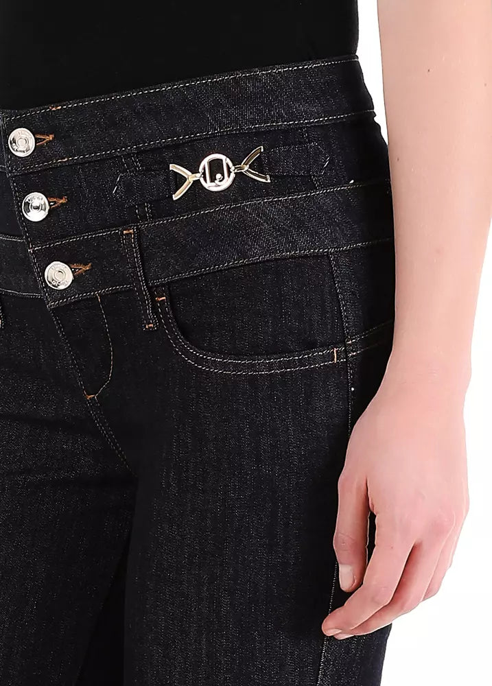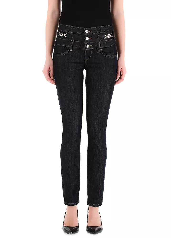 Sophistication meets comfort in these high-waisted skinny jeans that bring a touch of glamour to casual wear. Crafted from a premium blend that ensures both resilience and flexibility, these jeans feature jewel and metallic embellishments on the front for that extra sparkle. Their three-button closure offers a secure fit, while the four-pocket design adds practicality for your essentials. Perfect for elevating an everyday look or for chic evening outings.