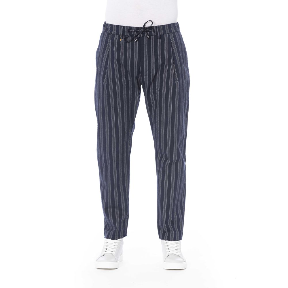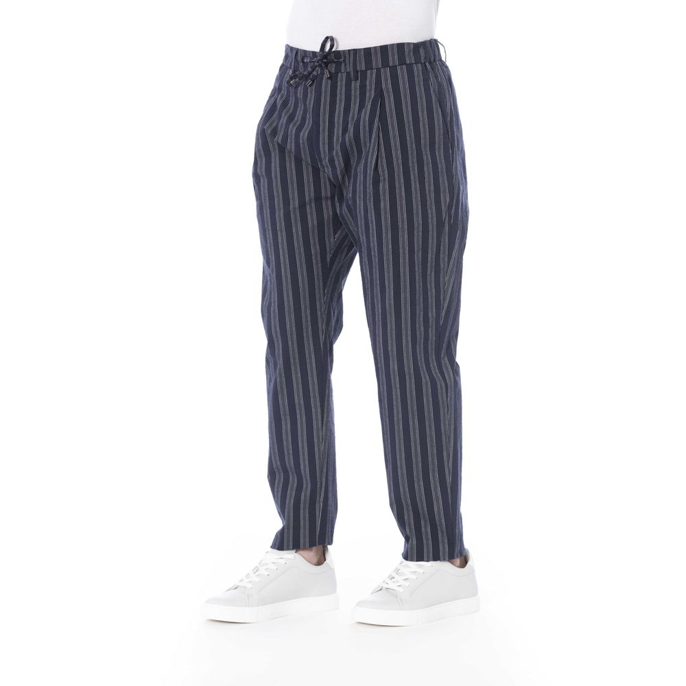 Elevate your wardrobe with Distretto12’s symphony of casual sophistication. These striped trousers are a seamless blend of comfort and style, boasting a lace closure and practical pockets for an effortless look that’s both sharp and functional. Indulge in the luxury of fine Italian craftsmanship and the timeless charm of blue hues, all while enjoying the perfect fit thanks to the subtle stretch provided by a touch of elastane. Make a statement with Distretto12.