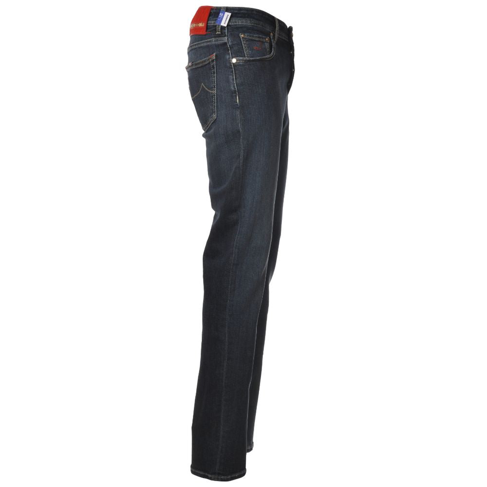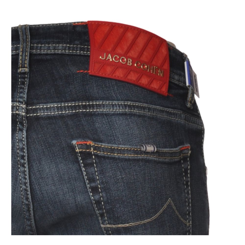 Jacob Cohën Nick super slim fit dark denim jeans in stretch cotton, logo patch on back in red pony skin and leather, red and white stitching details, silver buttons. Mid-rise design features belt loops, decorated button front closure, slim fit and five classic pockets.
