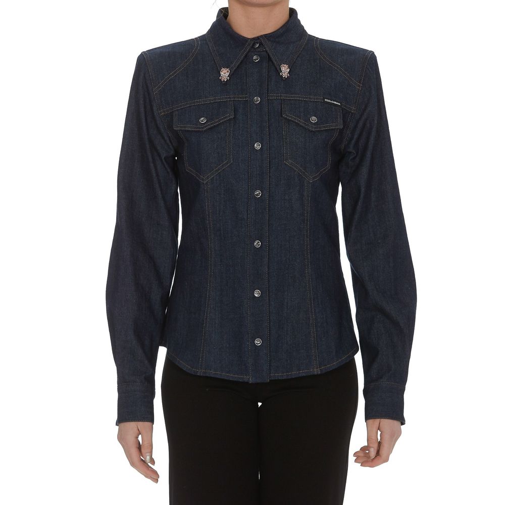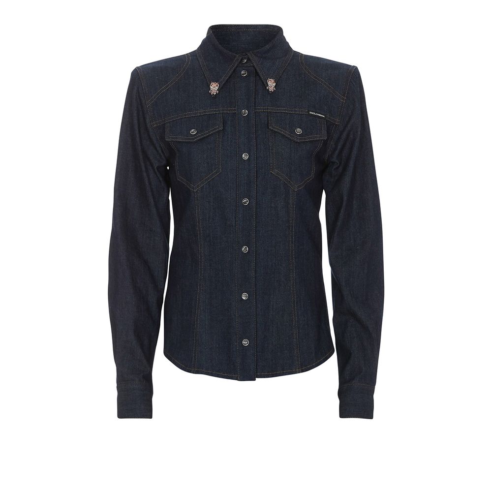 Add a touch of sparkle to your wardrobe with this exquisite dark blue denim shirt from Dolce & Gabbana. Elegantly crafted with rhinestone details on the collar, this shirt is a testament to Italian sophistication and style, perfect for those who appreciate a blend of casual denim and luxe accents.