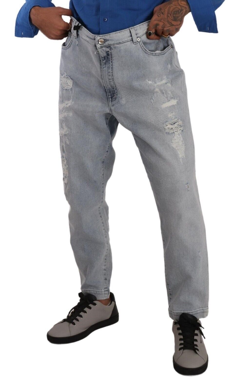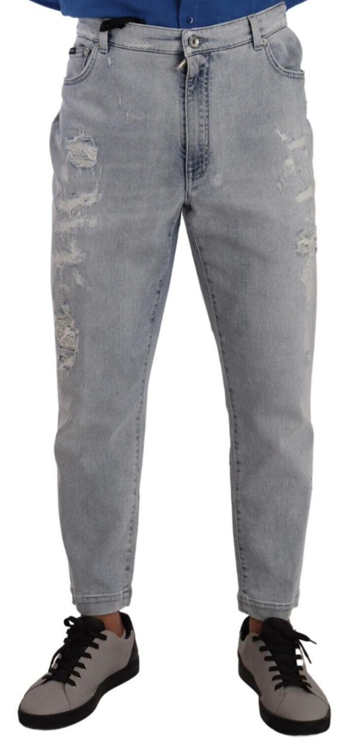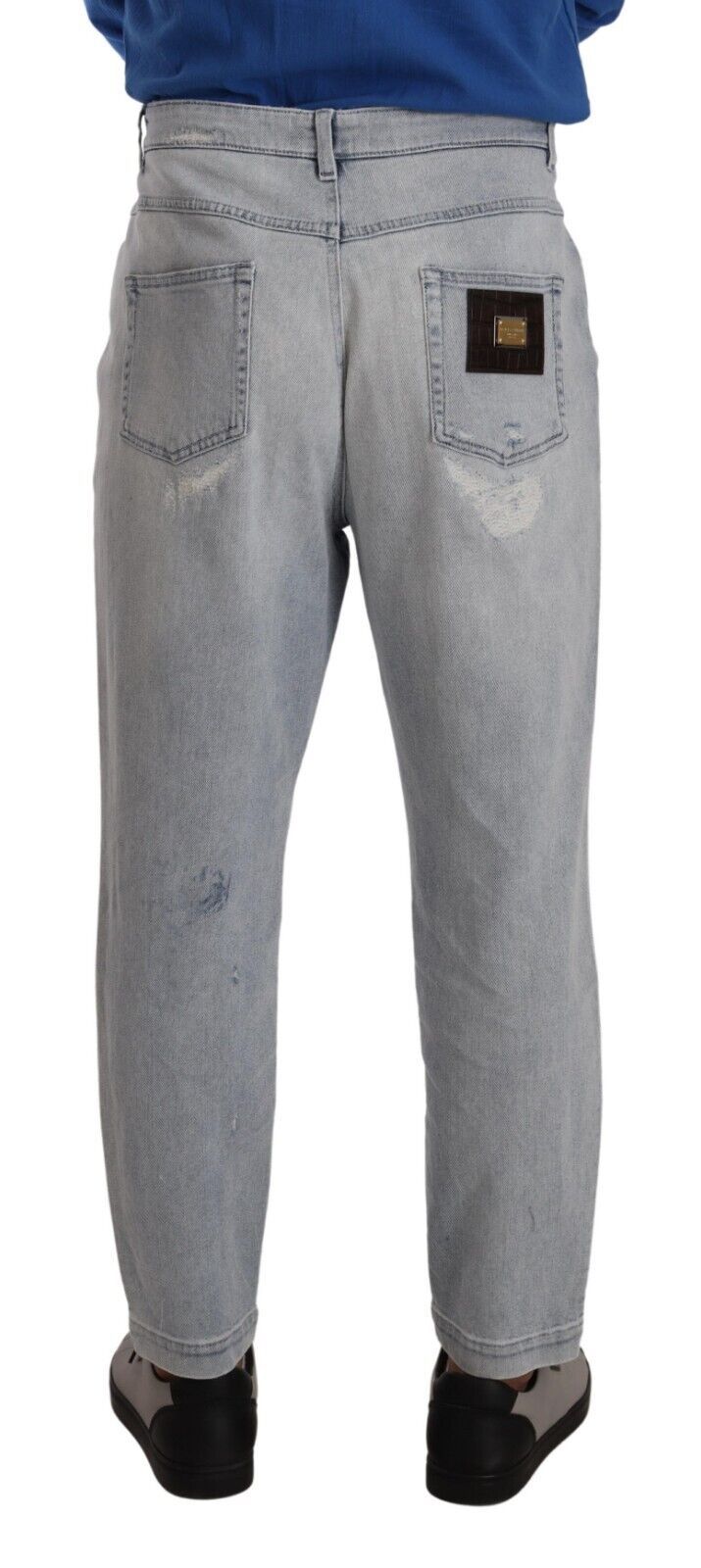 Discover the exquisite craftsmanship of Dolce & Gabbana with these stylish tapered denim jeans. Perfect for creating a sleek silhouette, these slim-fit jeans are a testament to classic design with a modern twist. Made from a comfortable cotton stretch blend, they feature a classic zipper and button closure, ensuring a snug and secure fit. The light blue color offers a fresh and versatile look, ideal for a variety of occasions. Logo detail subtly brands these jeans as a mark of luxury and quality. Crafted in Italy, they embodies the elegance and sophistication synonymous with the designer name.