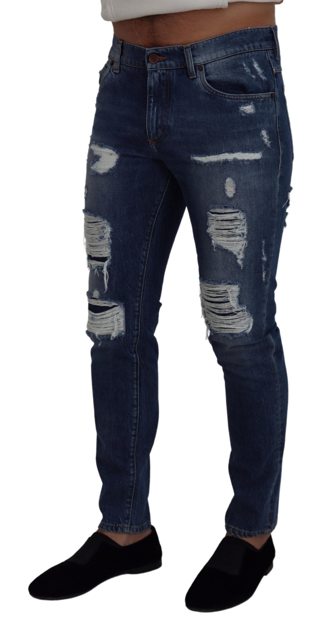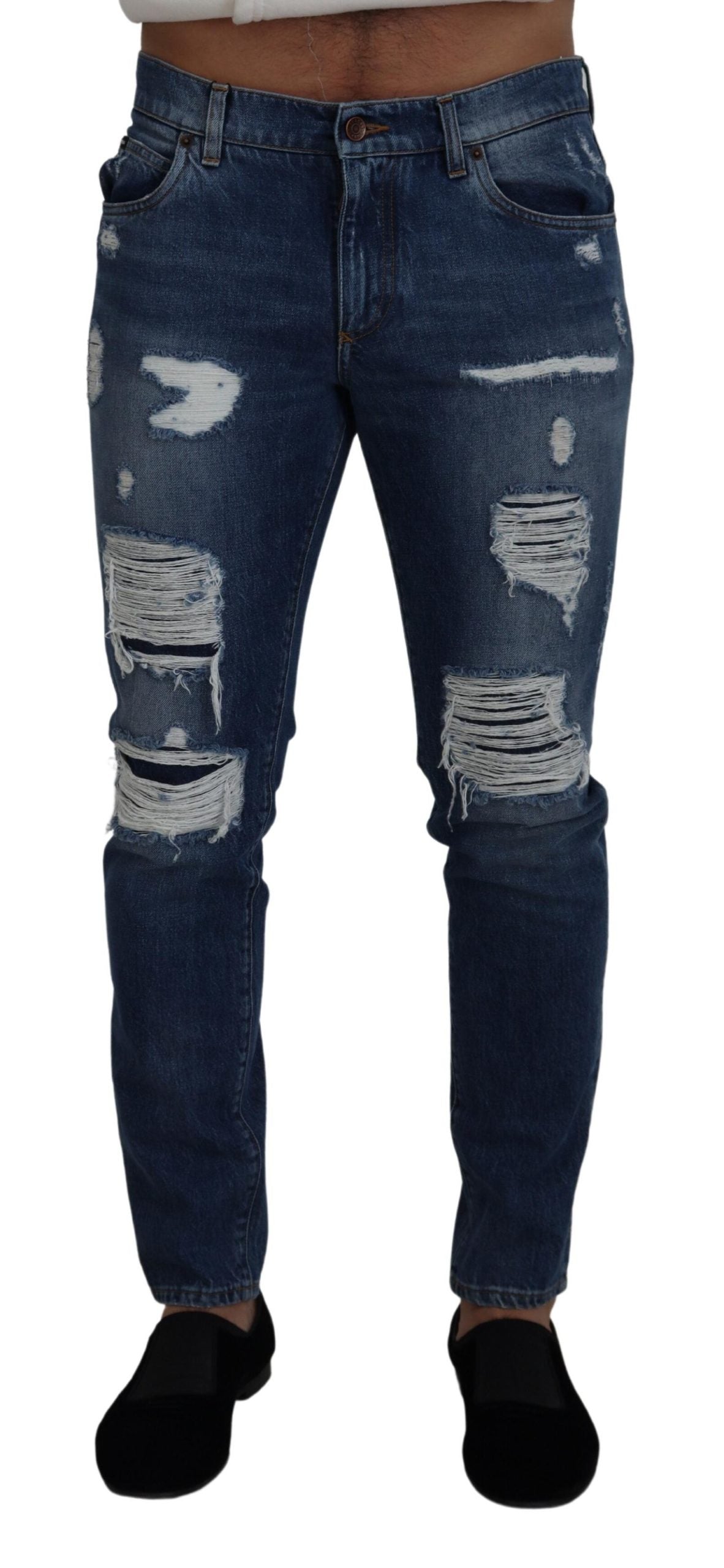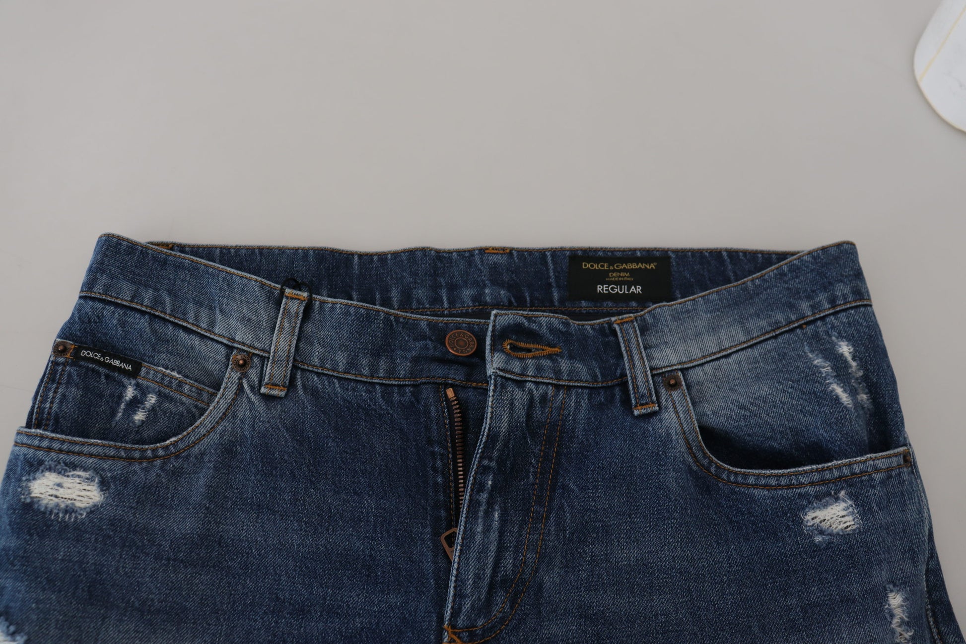 Step into the world of high fashion with these striking, brand-new tattered denim pants from the iconic Dolce & Gabbana. Crafted from 100% premium cotton, these jeans offer both unparalleled comfort and edgy style. The washed blue hue is versatile, perfect for a range of ensembles, while the meticulous Italian craftsmanship ensures longevity and luxury in every stitch. Make a bold statement with these jeans, adorning logo details and a classic zipper closure.