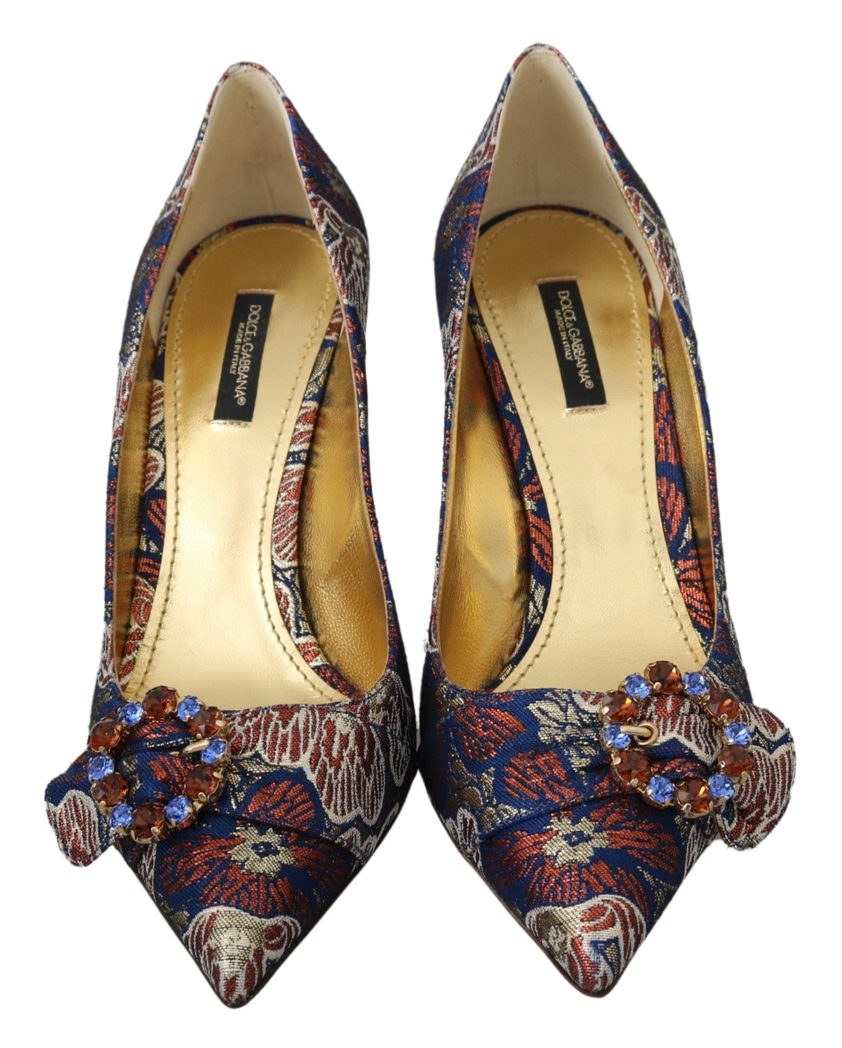 Step into luxury with these stunning Dolce & Gabbana heels, showcasing a vibrant blue jacquard pattern. Adorned with eye-catching multicolor crystals, these shoes are the pinnacle of high fashion and offer unmatched quality and comfort. Meticulously crafted in Italy, these heels are perfect for those seeking sophistication and a touch of sparkle. Whether for a glamorous event or a sophisticated evening out, these pumps will elevate any ensemble.