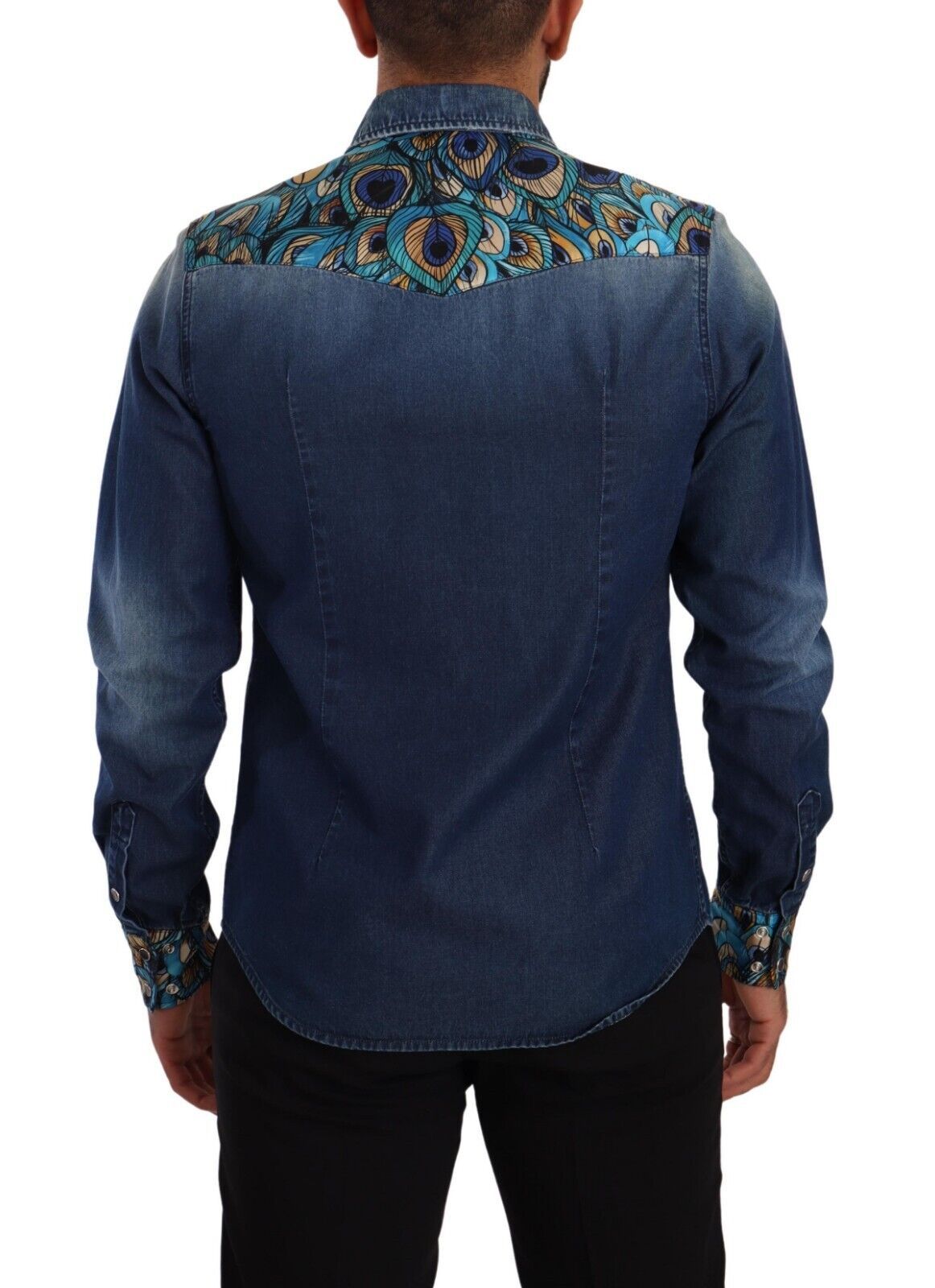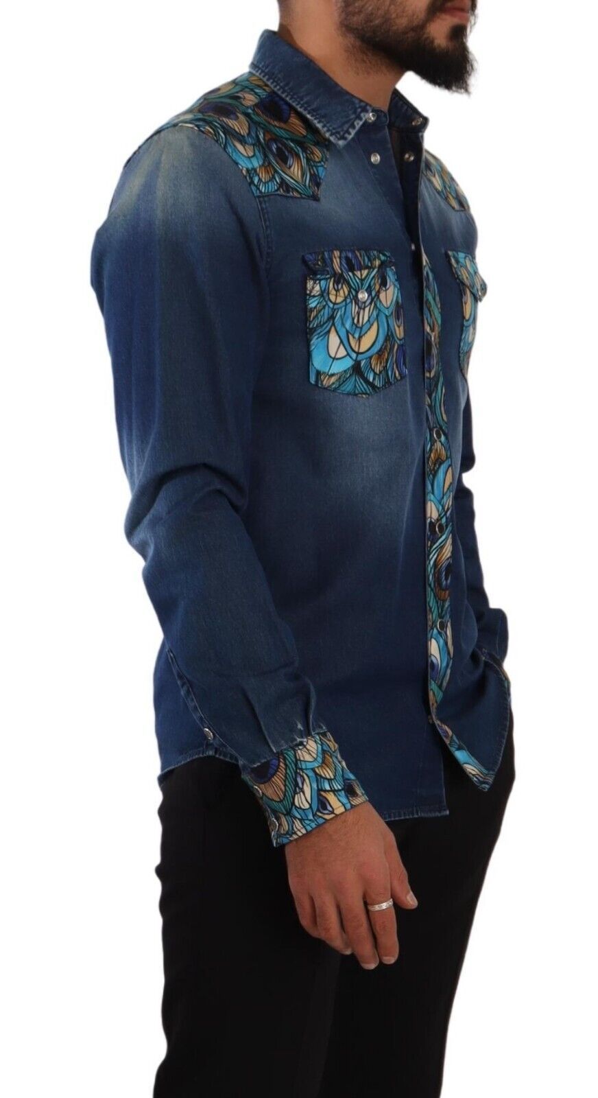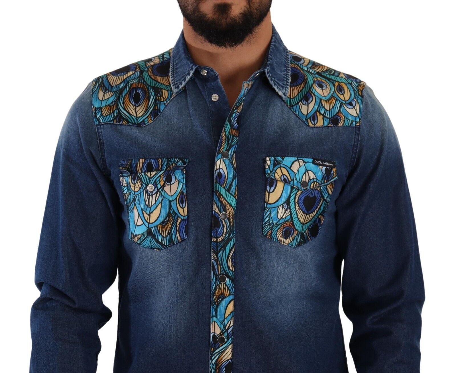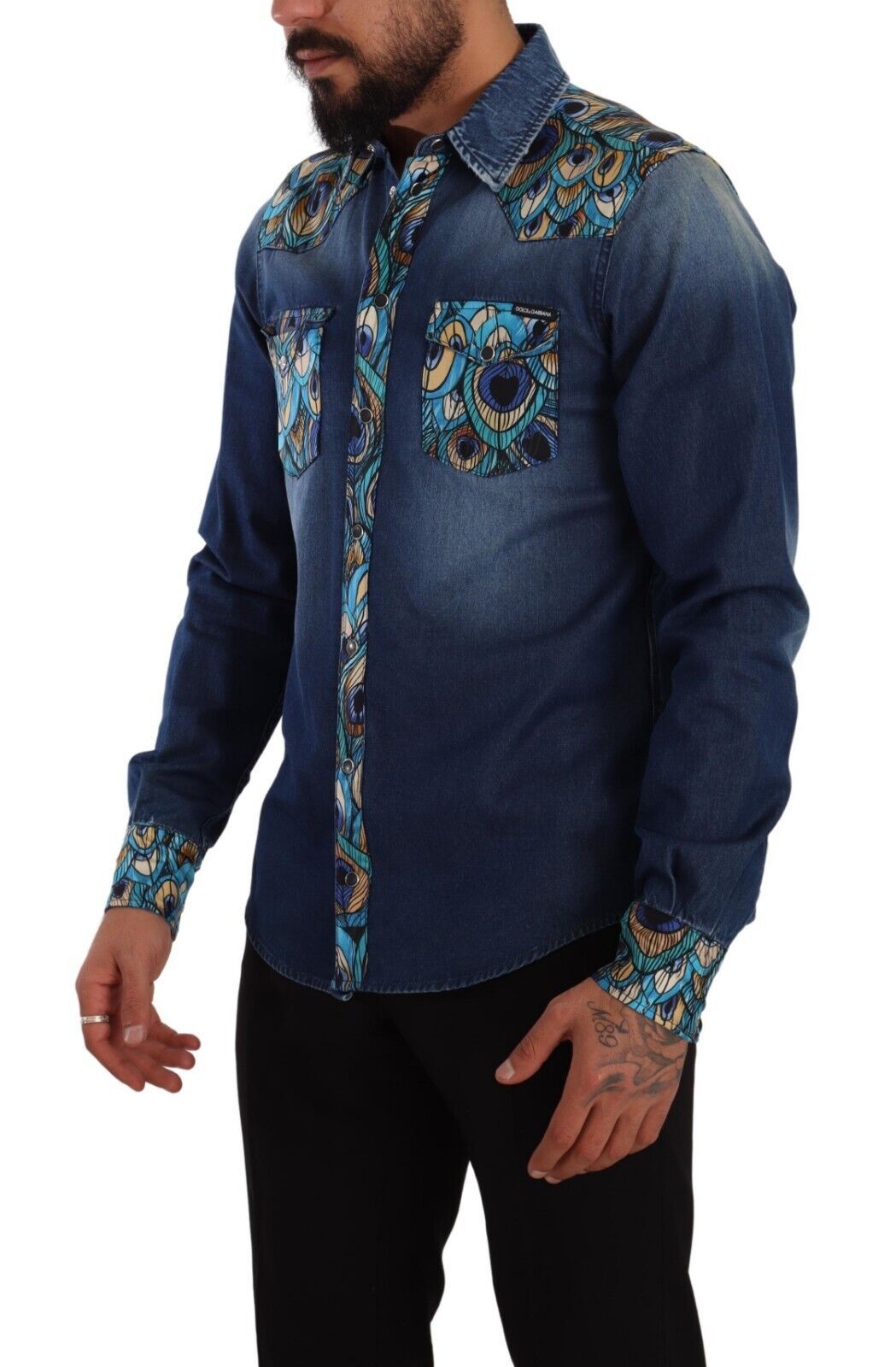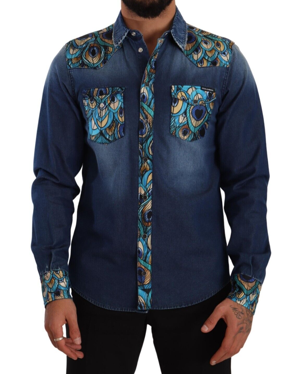 Step into a world of Italian luxury with this exquisite Dolce & Gabbana button-down denim shirt, adorned with a stunning peacock print that exudes elegance with every thread. Crafted to cater to the man with a taste for slim fit sophistication and the comfort of cotton blend texture, this piece embodies both laid-back luxe and high-end design, making it a versatile add-on to your wardrobe.