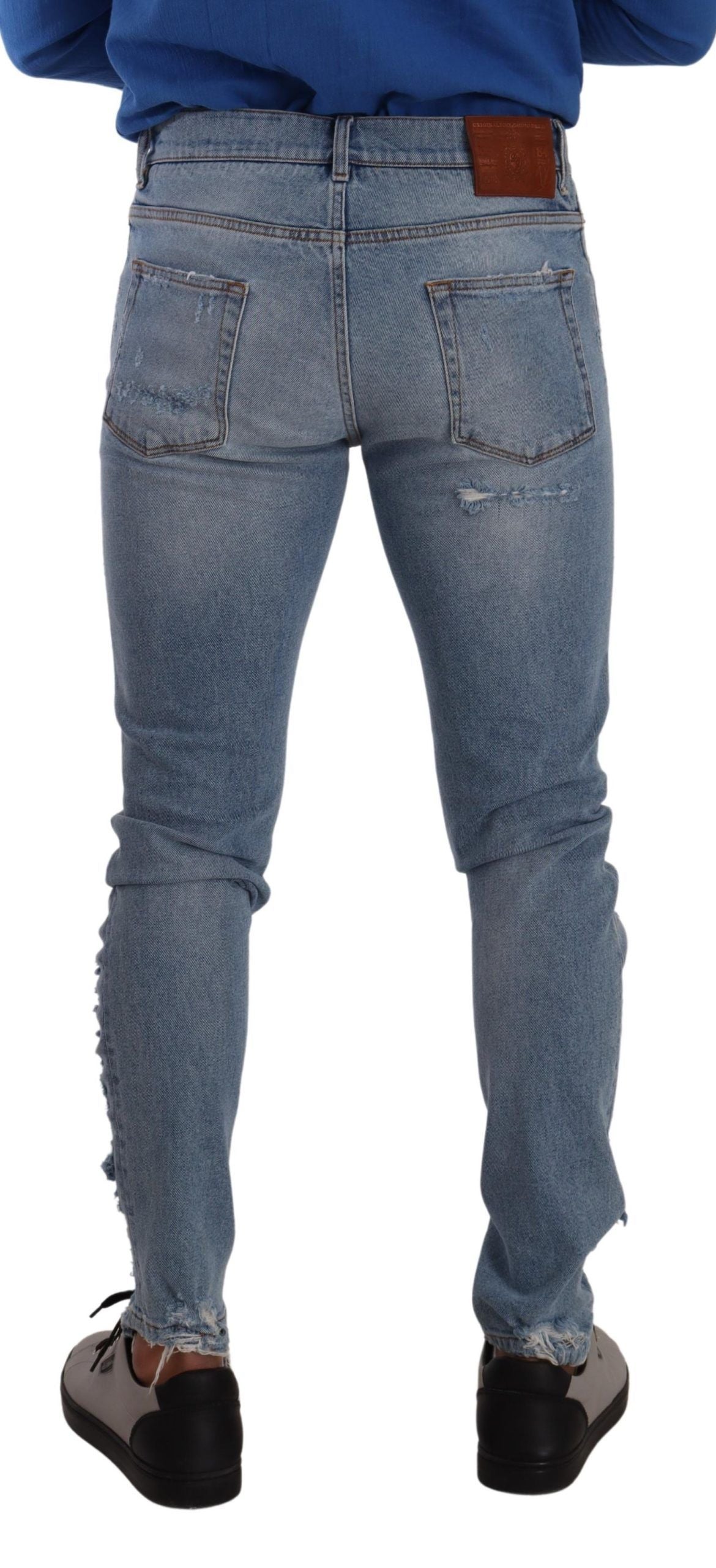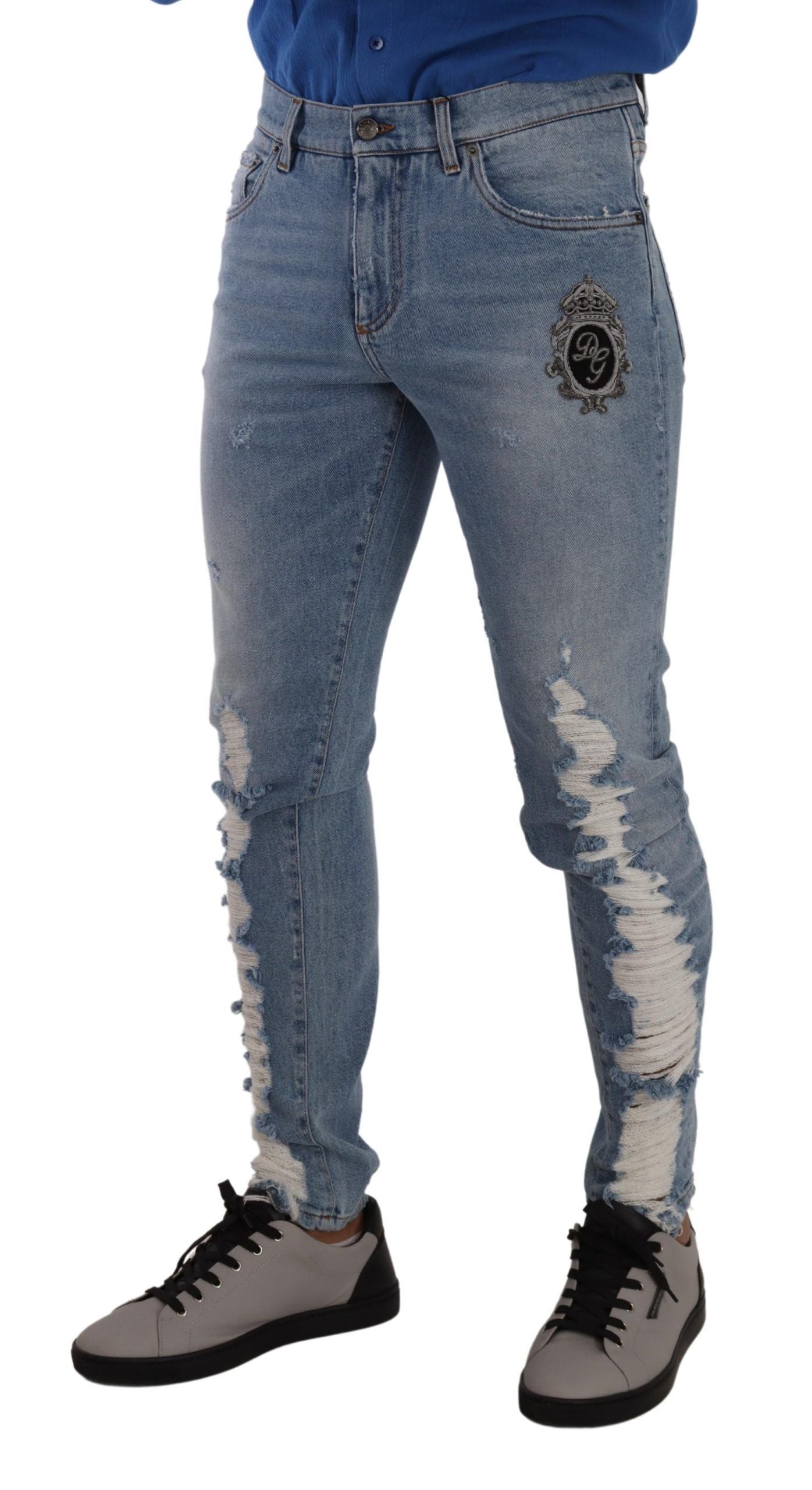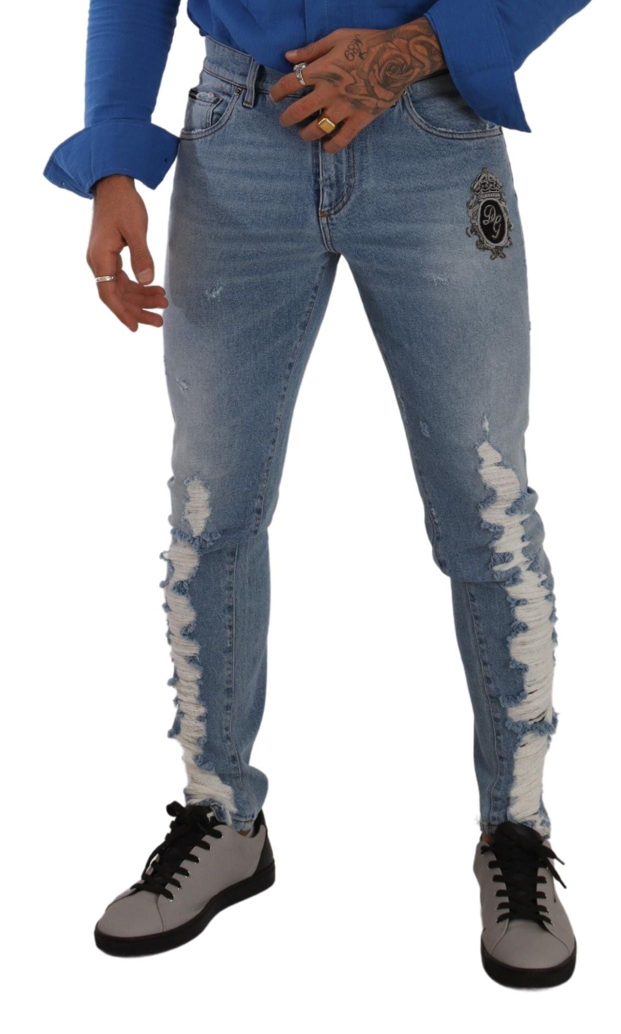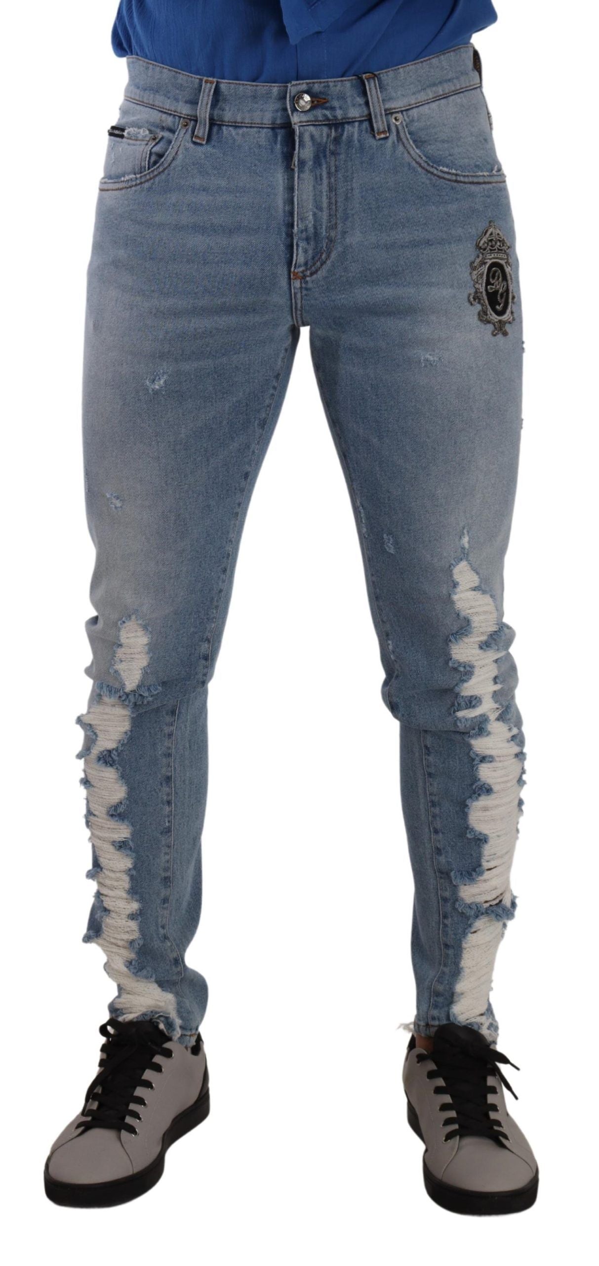Step into style with these exquisite light blue slim jeans from the renowned house of Dolce & Gabbana. Perfect for creating a polished, casual look, these tattered denim jeans feature tasteful logo embroidery, aligning luxury with everyday wear. Crafted in Italy from a comfortable cotton stretch blend, they come with a zip and button closure, promising a perfect fit and unparalleled style.