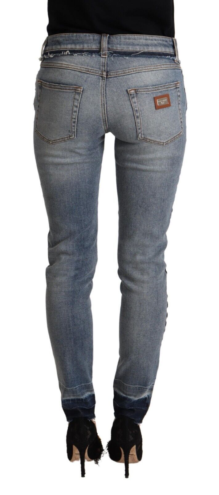 Indulge in the epitome of Italian craftsmanship with these stunning, brand new Dolce & Gabbana distressed denim jeans. These low waisted, slim fit jeans are designed to flatter your silhouette while providing the ultimate luxury feel. Perfectly blending style with comfort, they feature a chic distressed look in a versatile blue shade, ready to complement your favourite ensemble. Whether it’s a casual outing or a night out, these jeans are sure to make a statement.