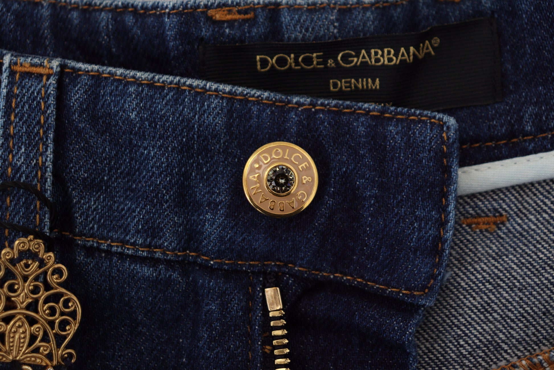 Gorgeous brand new with tags, 100% Authentic Dolce & Gabbana embellished straight jeans. These luxurious pants are a staple from the exclusive MainLine Collection, offering not just premium quality but also a stylish edge to your wardrobe. Designed with a regular fit, they serve both comfort and fashion.