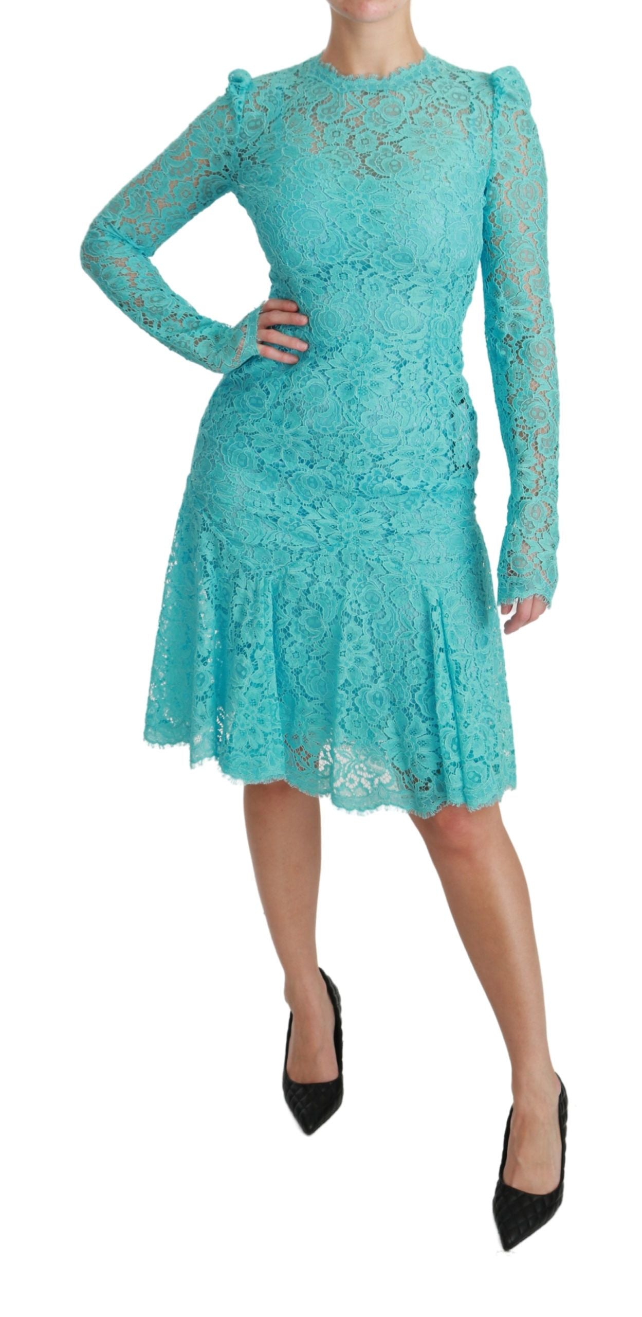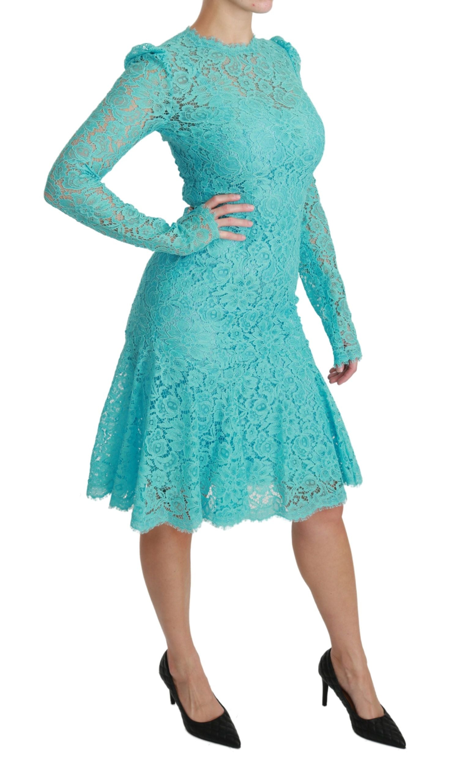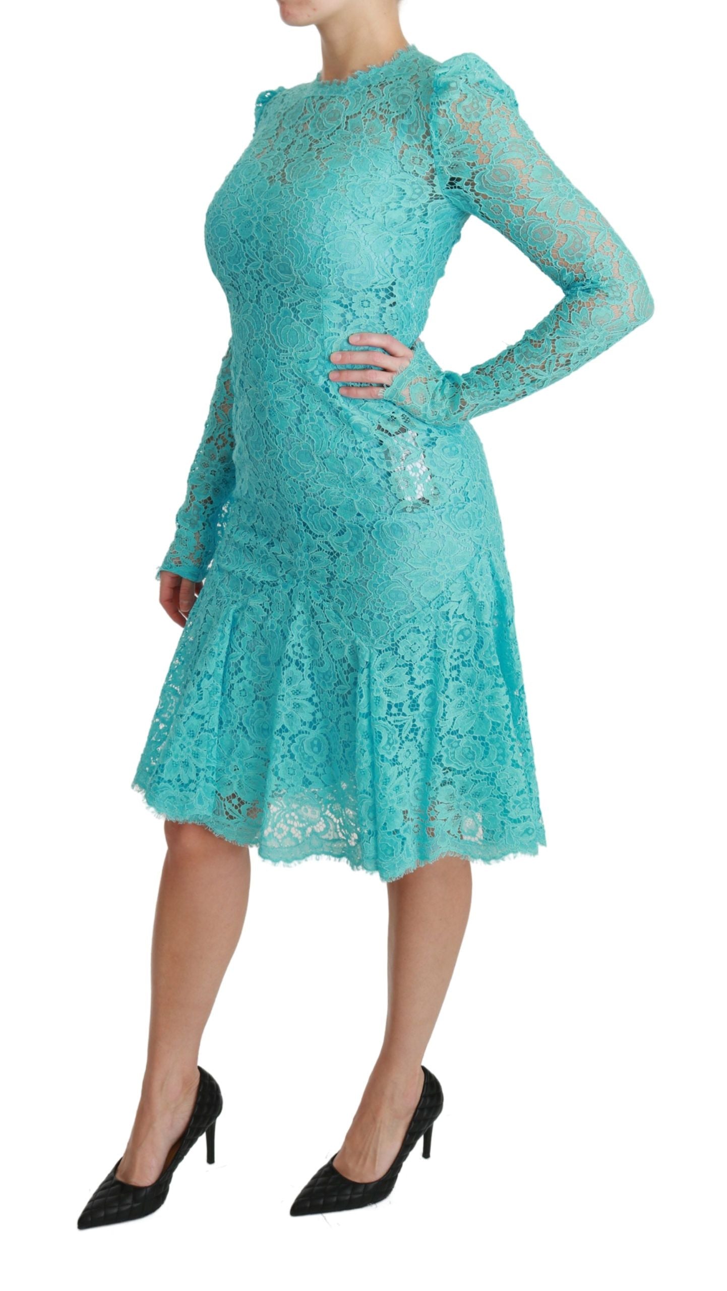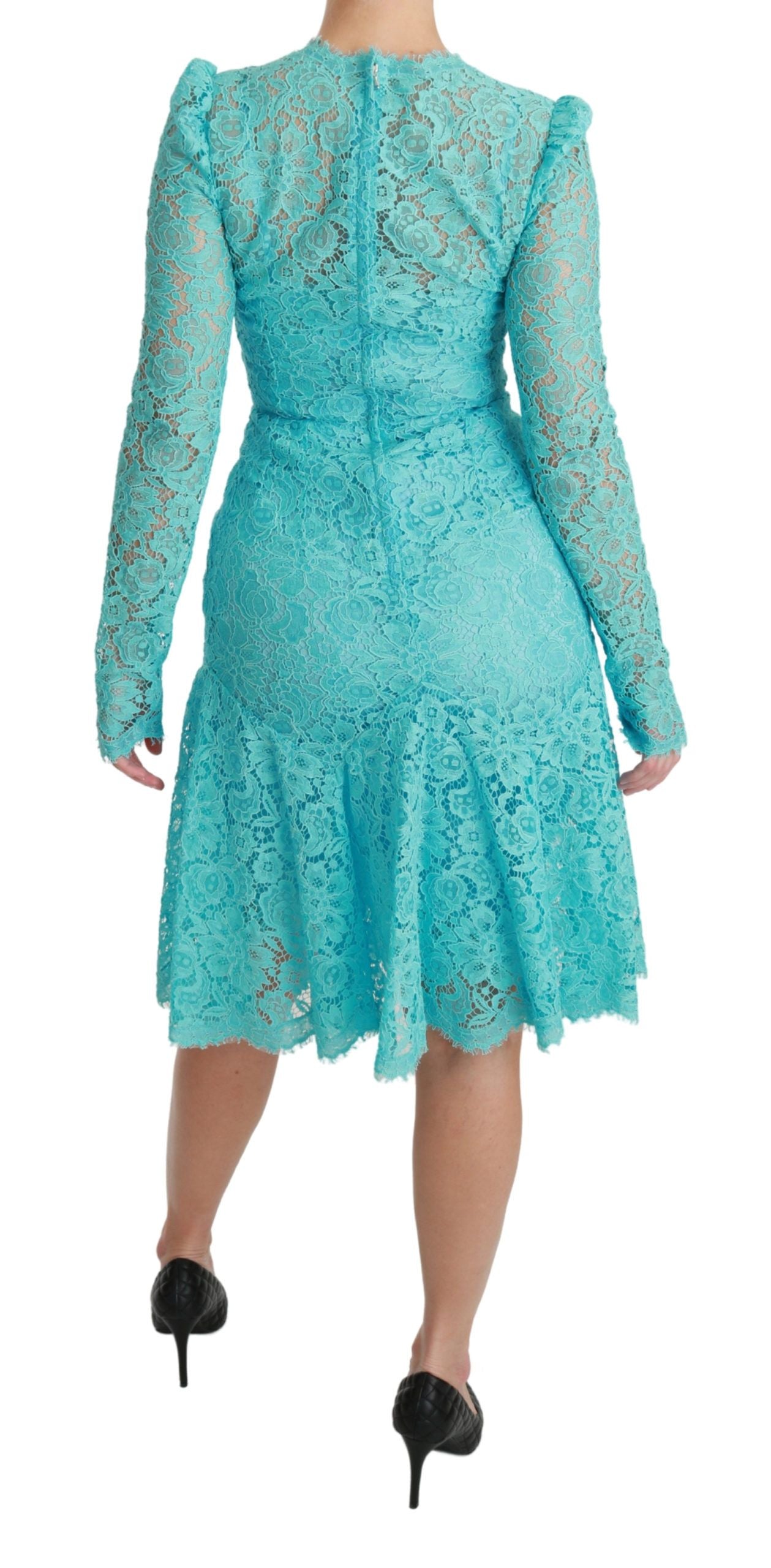 Step into a world of elegance with this exquisite Dolce & Gabbana knee-length sheath dress, perfect for your upscale events. Featuring a delicate Light Blue Lace design, this stunning piece is complete with a figure-flattering fit and flare silhouette and a sophisticated silk stretch inner lining, ensuring both comfort and style. Expertly crafted in Italy, this dress showcases the brand’s signature high-end craftsmanship and eye for exclusive fashion.
