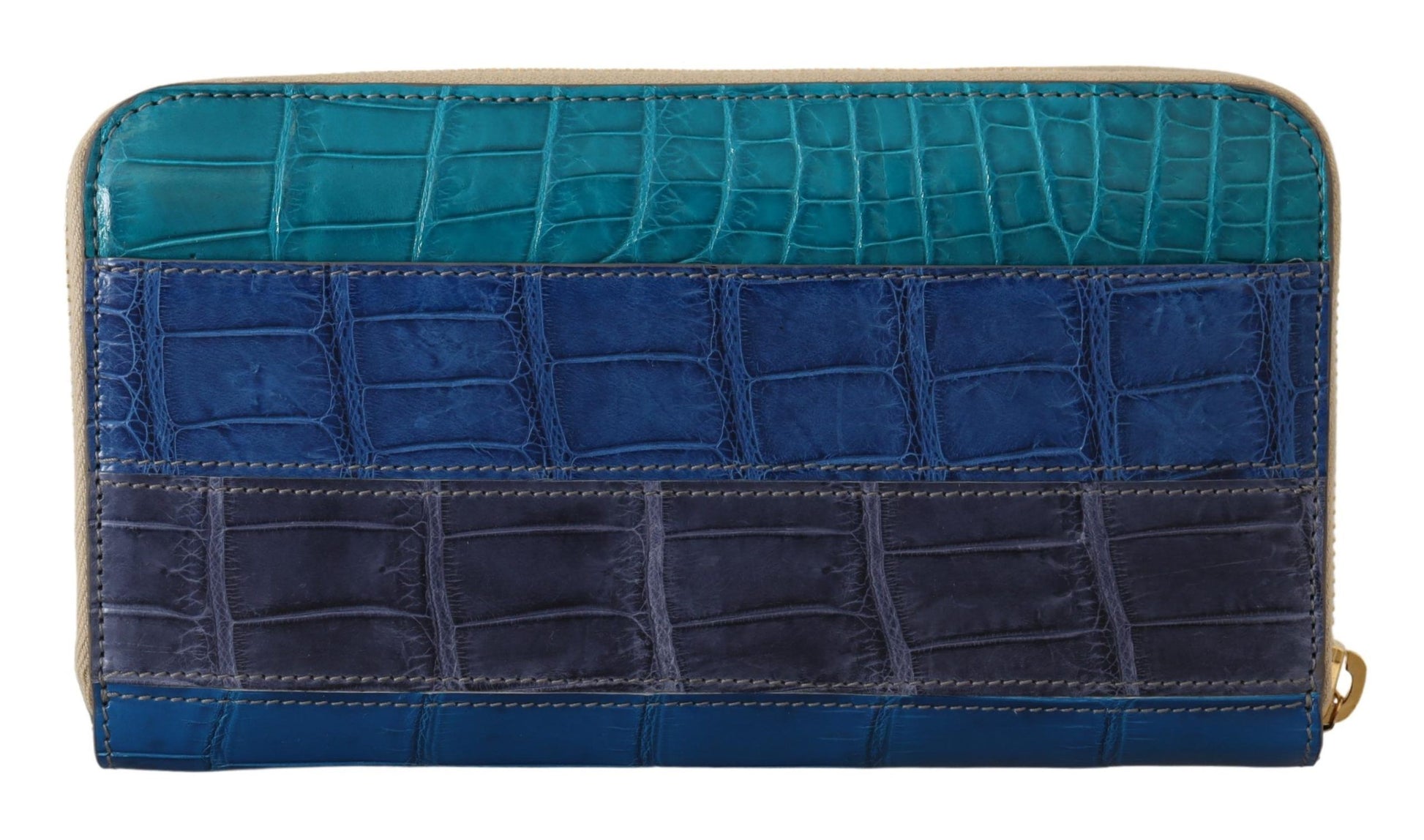 Indulge in the elegance of high craftsmanship with this Dolce & Gabbana continental wallet. Flaunting a blue multicolor palette complemented by luxurious gold metal detailing, this 100% crocodile leather wallet is a stunning fusion of fashion and function. Its zip-around closure opens to a sophisticated gray leather interior, featuring organized slots for cards, bills, and coins. Perfectly sized for everyday glamour, it will carry your essentials with ease while making a style statement.