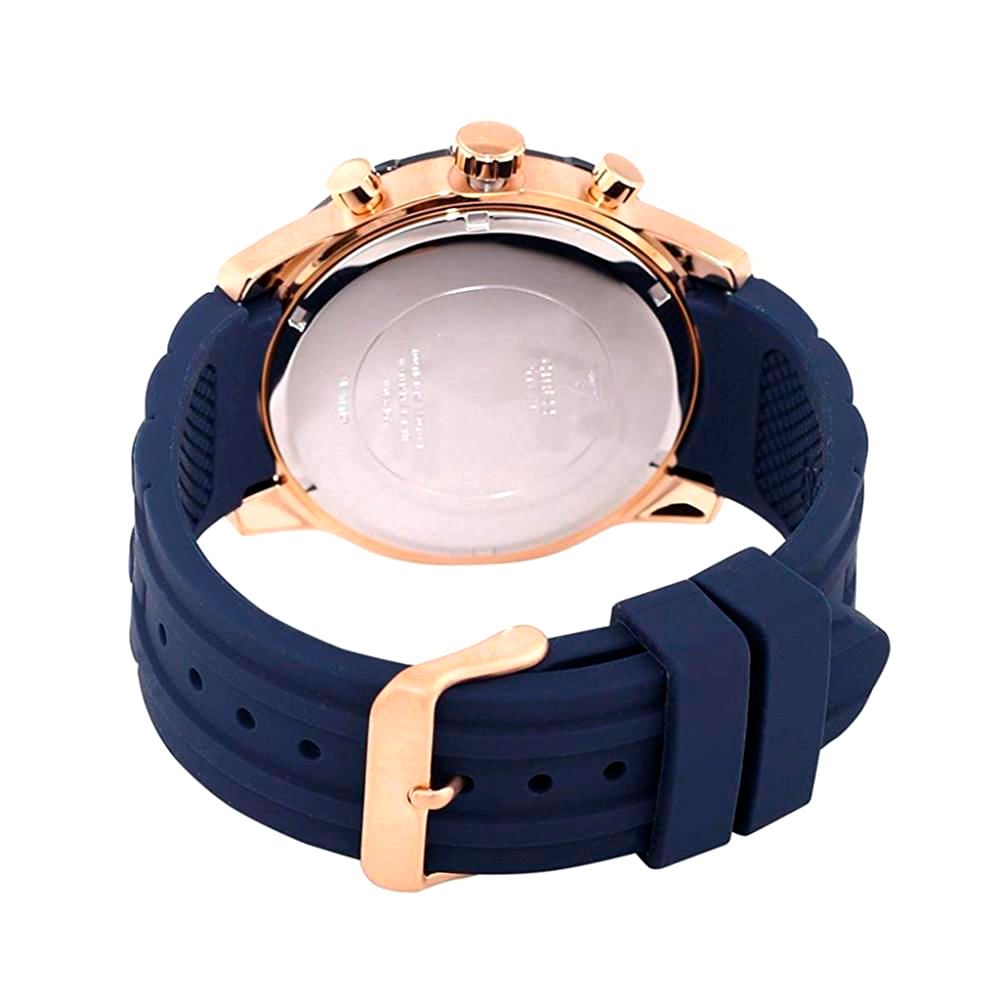 Type of mechanism: QUARTZ. Display: ANALOGICAL. Material Of Case: STAINLESS STEEL. Colour Of Case: PINK. Material Of Bracelet: RUBBER. Colour Of Bracelet: BLUE. Dial Colour:WHITE. Glass type: MINERAL. Clousure: BUCKLE. Water resistence: 10ATM. Diameter dial: 45MM. Special Functions: