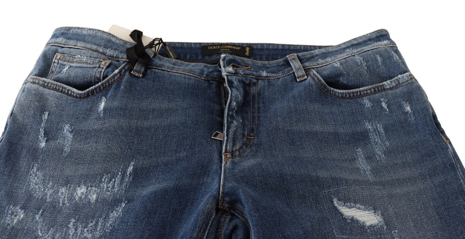 Revamp your wardrobe with the elegant sophistication of Dolce & Gabbana’s distressed skinny jeans. Perfect for those who love to combine glamour with a touch of edge, these jeans feature a flattering mid waist and convenient zipper closure, tailored for a regular fit that contours gracefully to your figure. Constructed from a premium cotton blend, they assure comfort without compromising on durability or style.