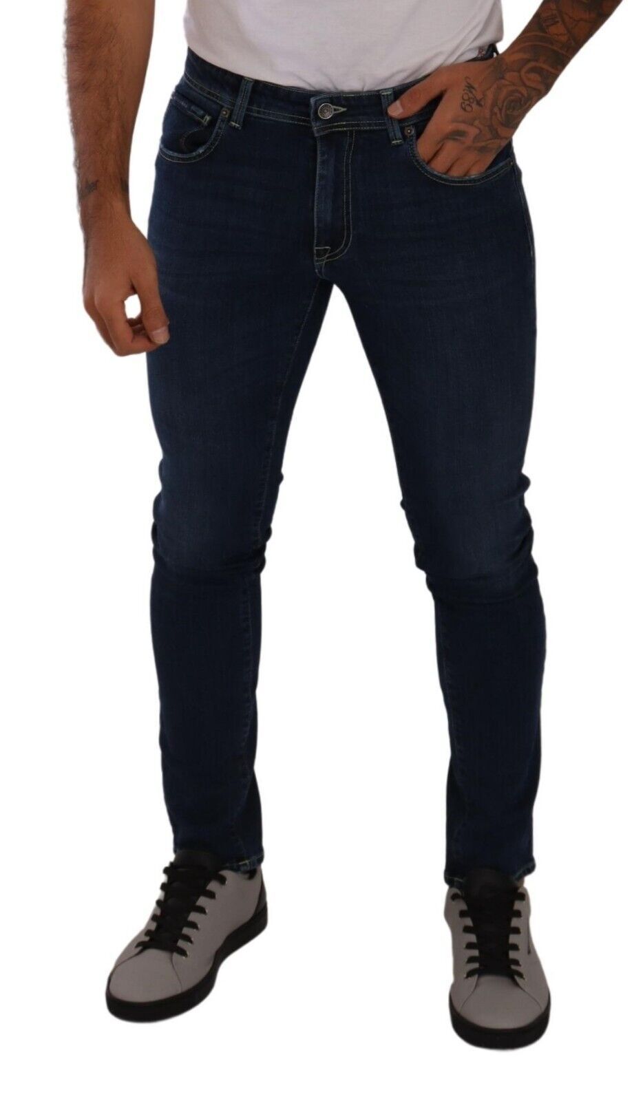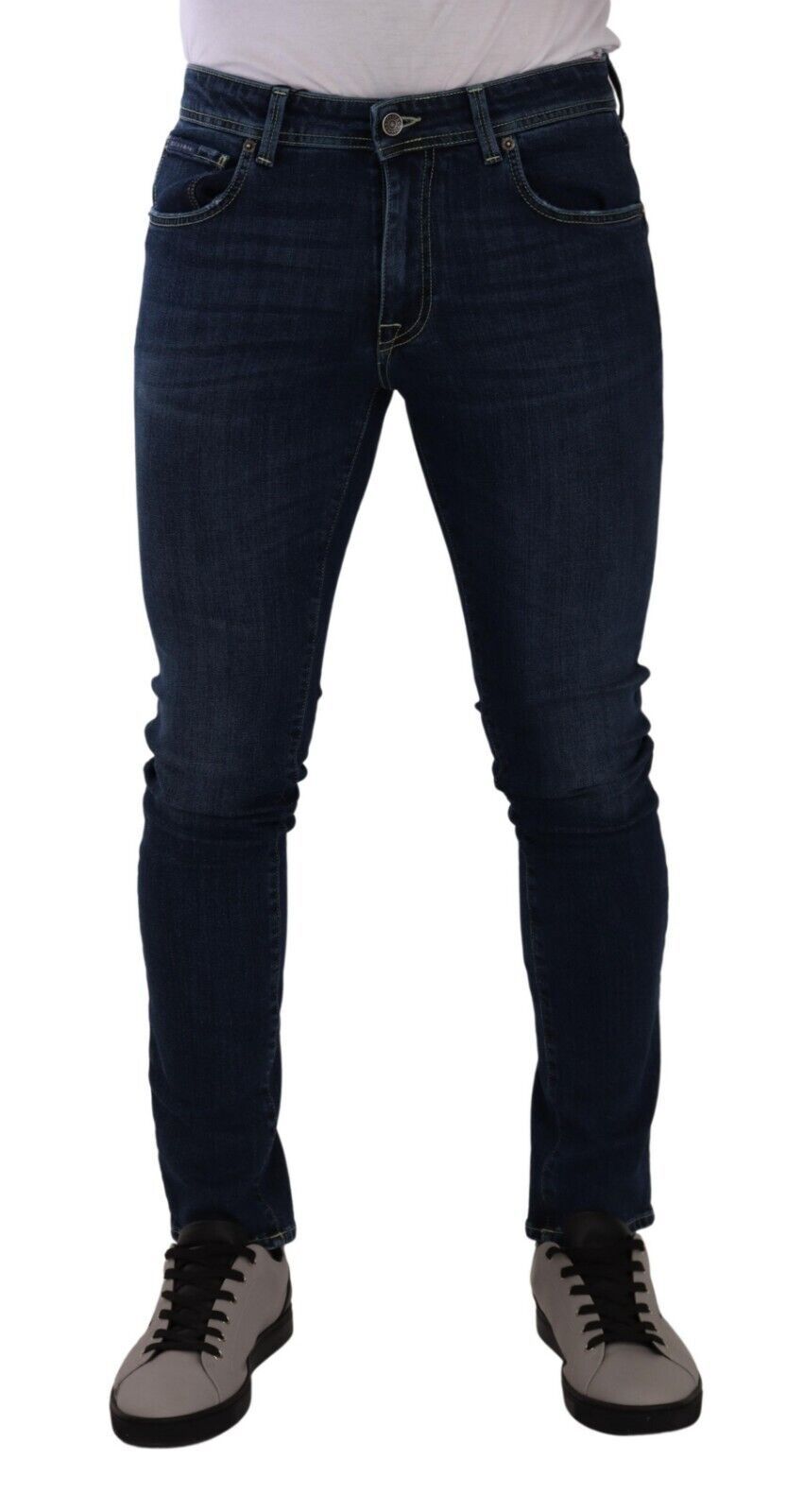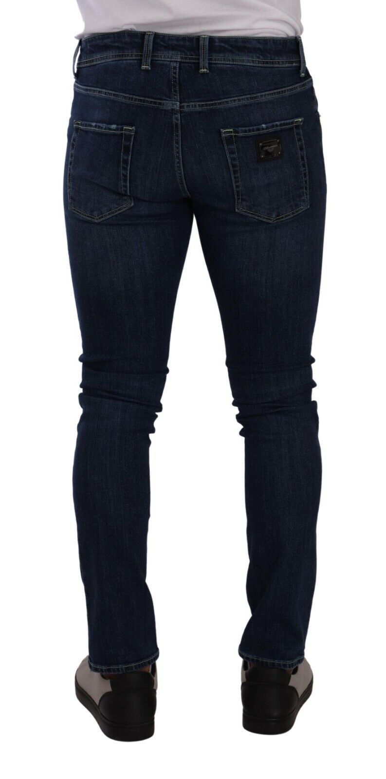 Step into luxury with these stunning Dolce & Gabbana skinny denim jeans. With their slim fit and rich dark blue wash, they are the perfect blend of high-fashion flair and comfort. Expertly crafted in Italy, these jeans feature a classic zipper and button closure, and boast the iconic logo details that signify premium quality. Perfect for fashion-forward individuals, they’re a versatile addition to any wardrobe.