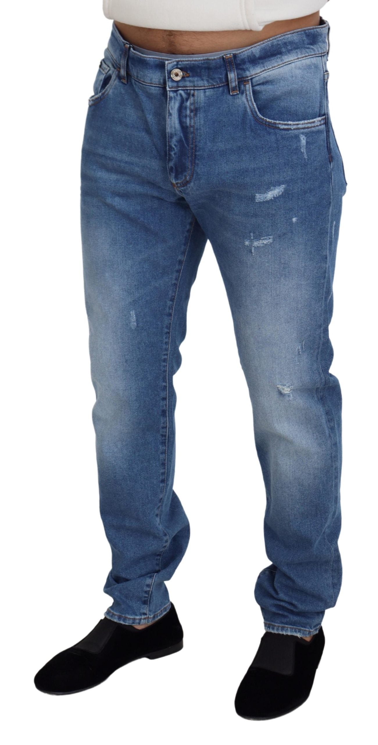 Step into style with these sleek and sophisticated Denim Pants from the prestigious Dolce & Gabbana. Expertly crafted in Italy, these jeans are a perfect blend of high-quality materials and classic design, featuring a modern blue washed hue that ensures versatility and elegance. The comfortable stretch of 98% cotton and 2% elastane provides a superb fit, while the logo details add a distinguished touch of luxury. With a convenient zipper closure, these pants are as practical as they are stylish. Add a dash of designer excellence to your wardrobe today!