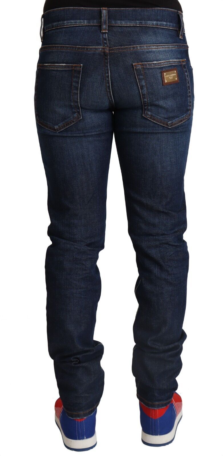Step into style with these luxurious skinny denim jeans by Dolce & Gabbana, perfect for elevating any ensemble. Crafted in Italy from the finest cotton blend with a hint of stretch for the optimal mix of comfort and sleek design, these jeans feature contemporary washed blue hues honed with signature logo details and meticulous craftsmanship. Embrace Italian elegance with a slim fit silhouette that pairs seamlessly with both casual and sophisticated looks.