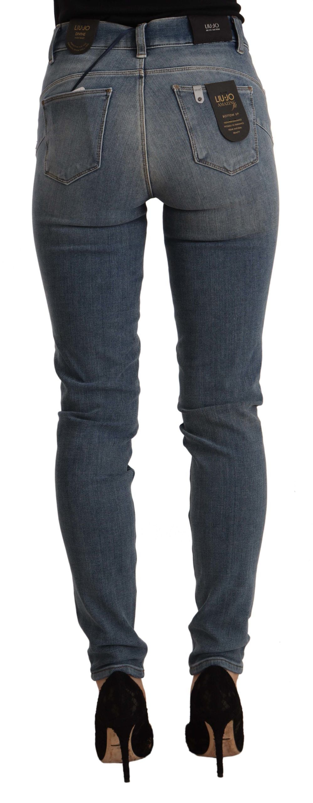 Step into style with these sophisticated high waist jeans from Liu Jo, perfect for adding a touch of elegance to your denim collection. Designed to flatter your figure, these jeans boast a slim fit cut crafted from a comfortable cotton blend, complete with a seamless zipper and button closure. The exquisite blue washed hue and subtle logo details lend a refined touch to your everyday look.