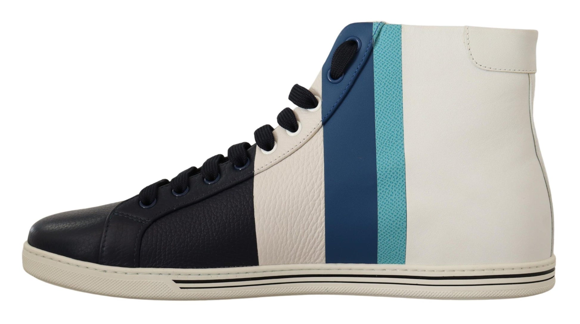Step up your sneaker game with these stunning, brand new leather high tops. These authentic sneakers boast a sleek white and blue color scheme that effortlessly complements any outfit, whether casual or sporty. Crafted with impeccable Italian quality, they come equipped with a durable rubber sole and subtle logo details that represent the luxurious essence of Dolce & Gabbana.