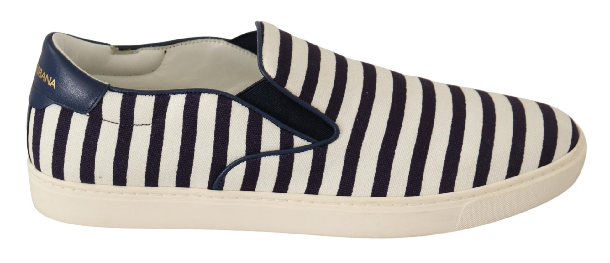 Immerse in the sophistication of these brand new , 100% Authentic Dolce & Gabbana slip-on trainers. Crafted with premium canvas cotton, these loafers feature a crisp blue and white striped design that’s perfect for any high-end casual or semi-formal ensemble. Resting on a durable rubber sole, they provide comfort without compromising style. Infused with Italian elegance, these shoes bear the distinctive logo details, reflecting your exquisite taste in luxury footwear.