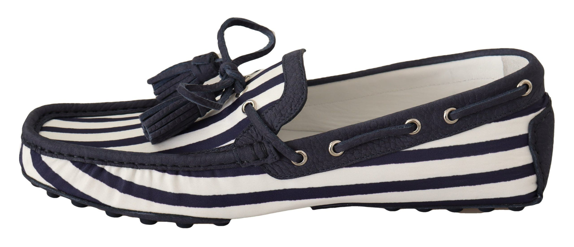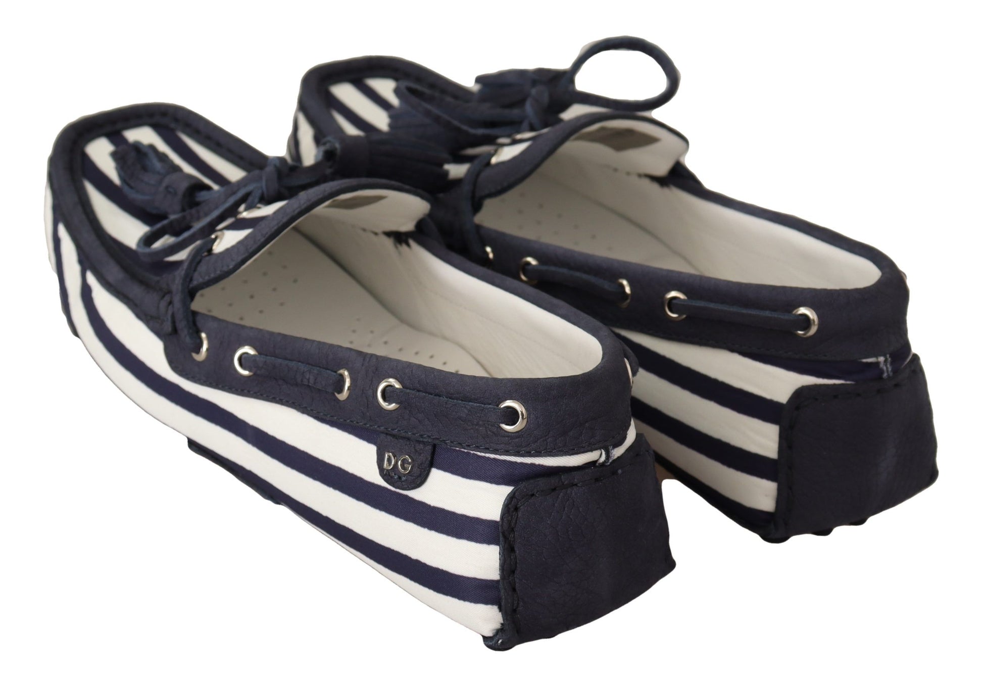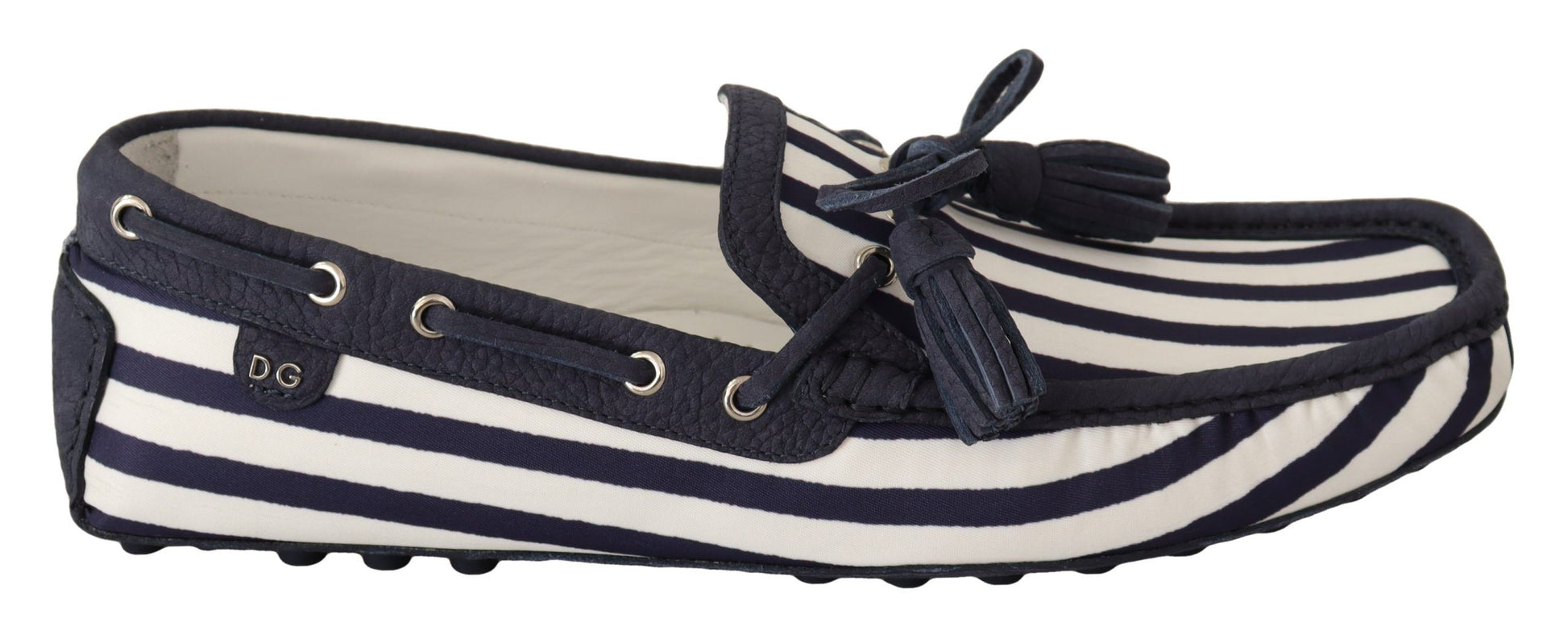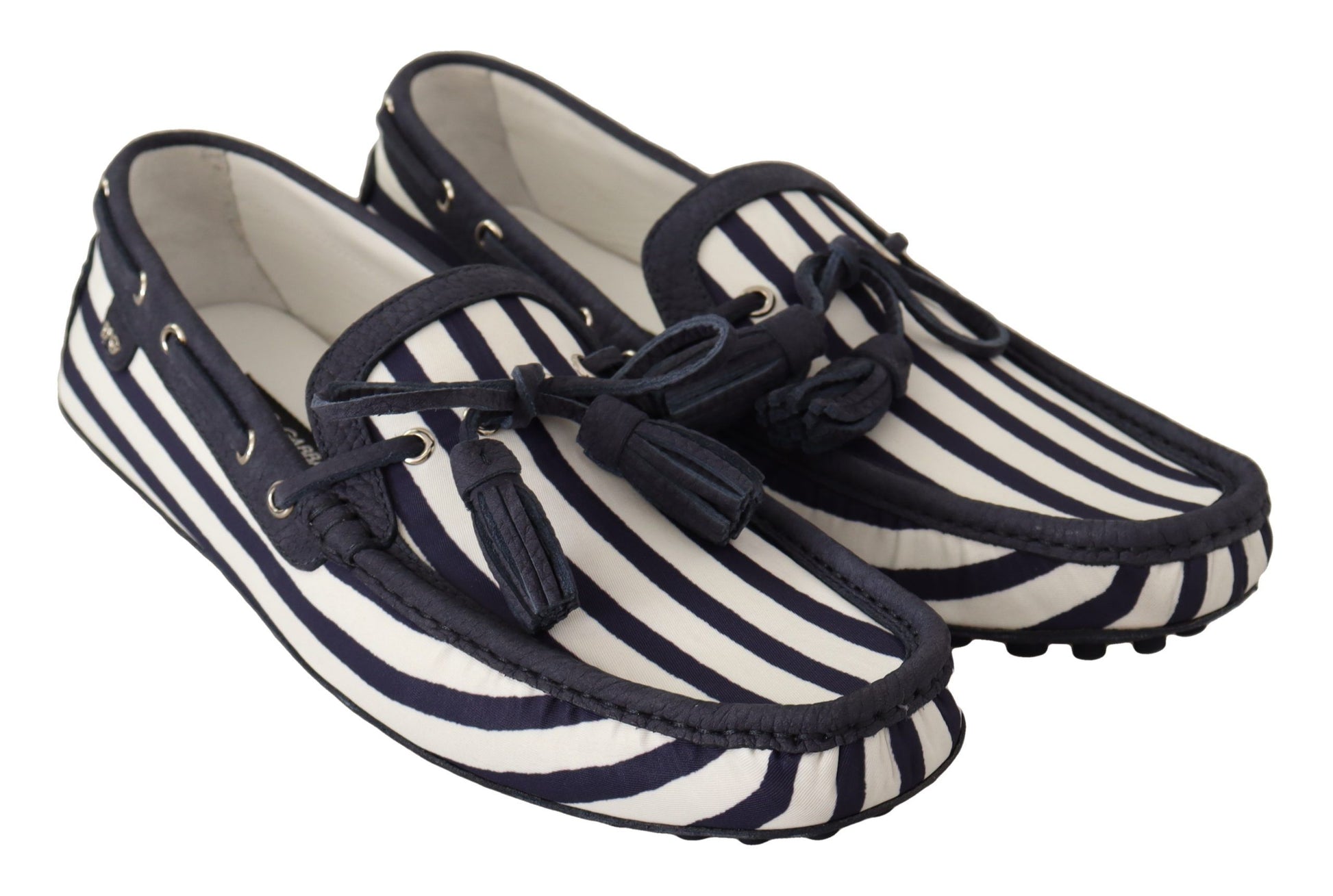 Step into sophistication with these eye-catching blue and white striped loafers, meticulously crafted by Dolce & Gabbana. These luxurious shoes, brand new with tags, boast an almond toe, elegant lace-up front, a comfortable branded insole, and a practical slip-on style paired with a durable rubber flat sole. True to Dolce & Gabbana’s reputation, these loafers are a statement of exclusive high craftsmanship, made in Italy. Perfect for the discerning gentleman who values both style and comfort.