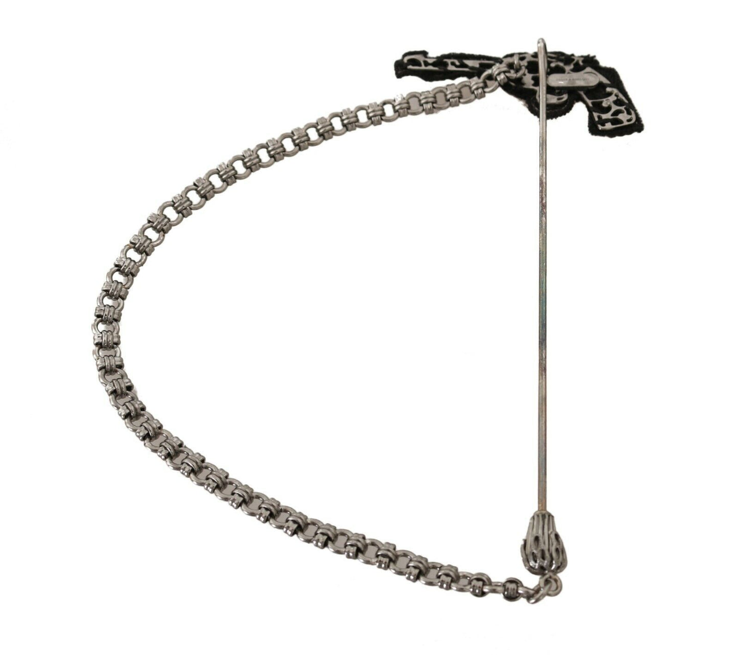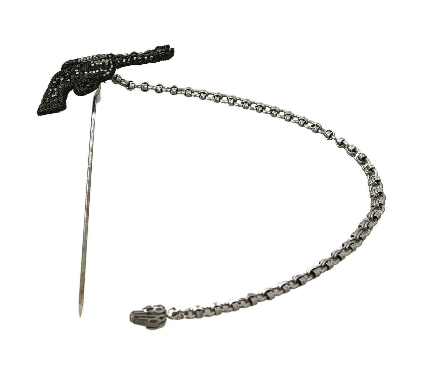 Accentuated with beads, a revolver replica, and a delicate chain, this lapel pin features the iconic Dolce & Gabbana logo, attesting to its designer quality. It’s a versatile addition to your accessory collection, proudly made in Italy.