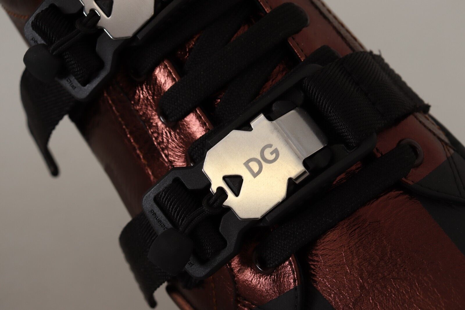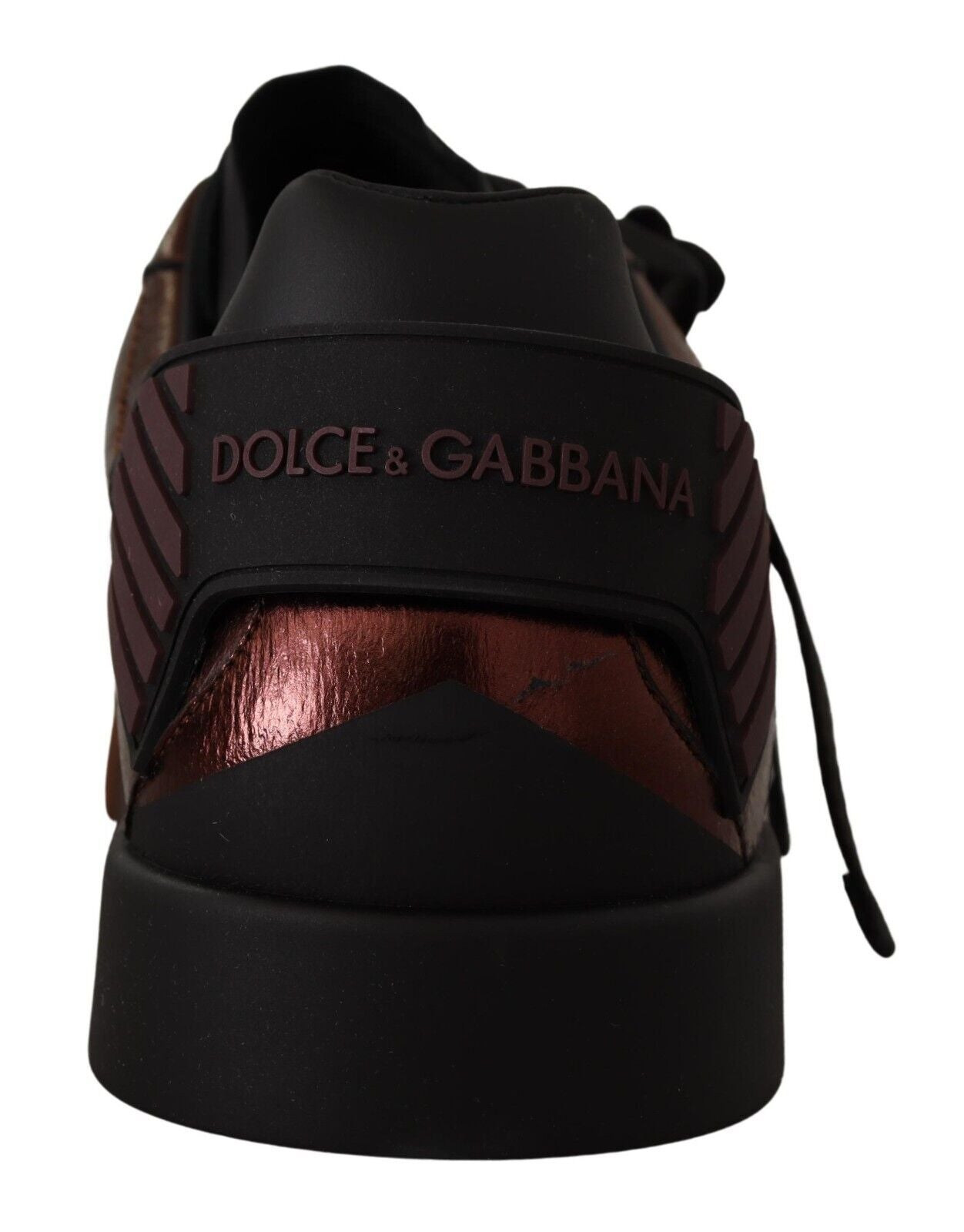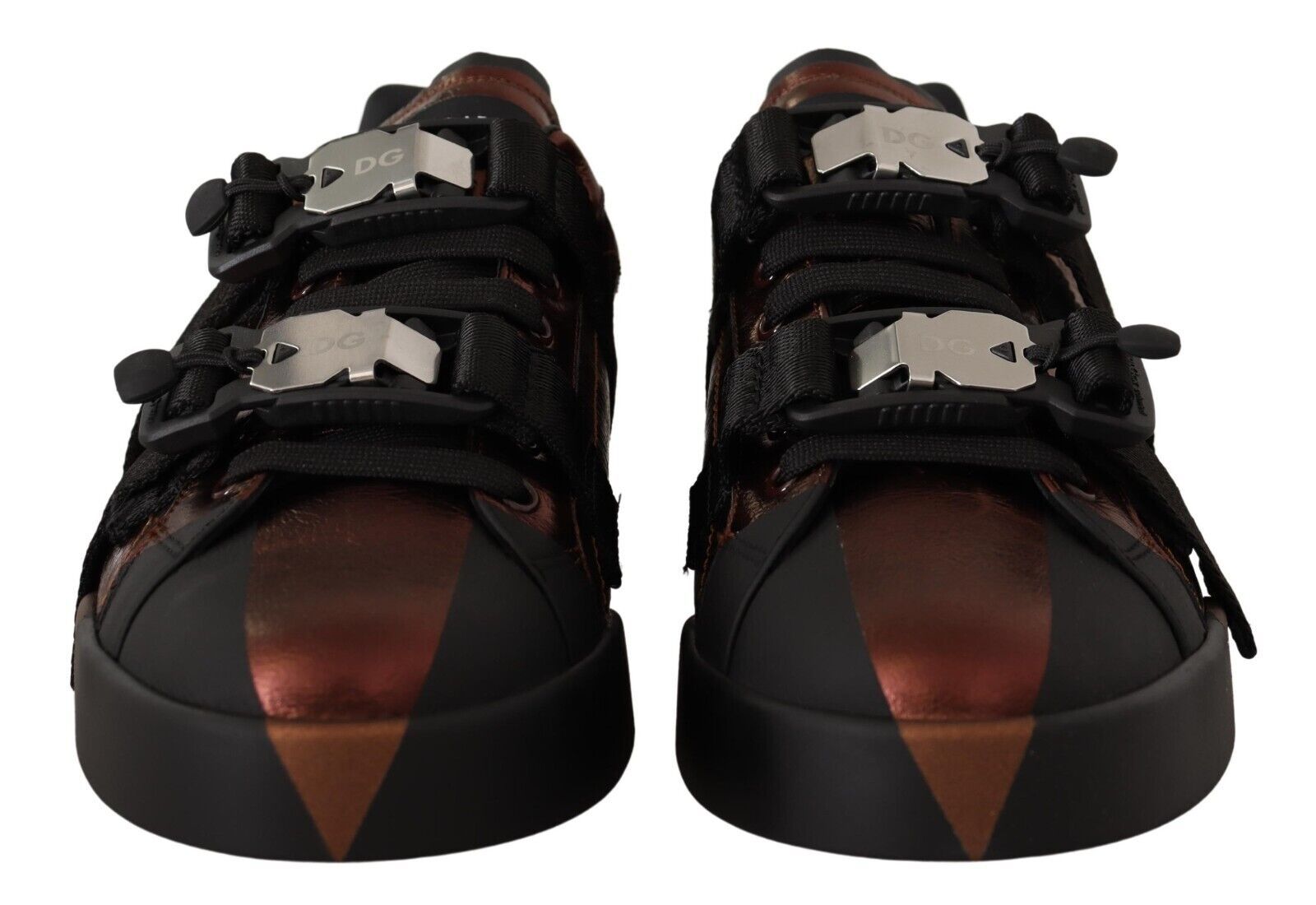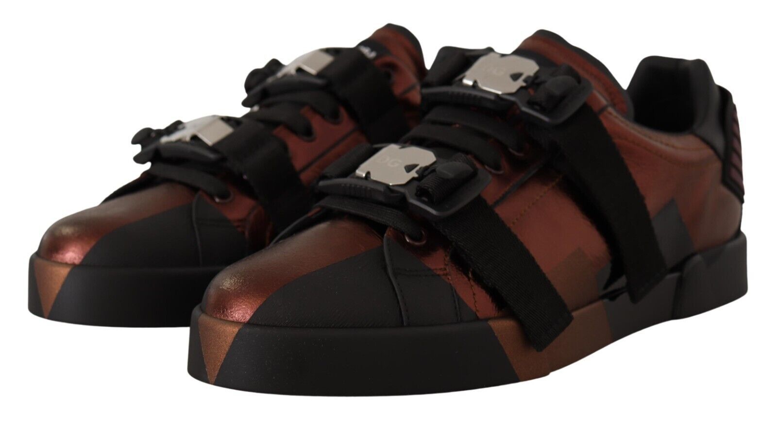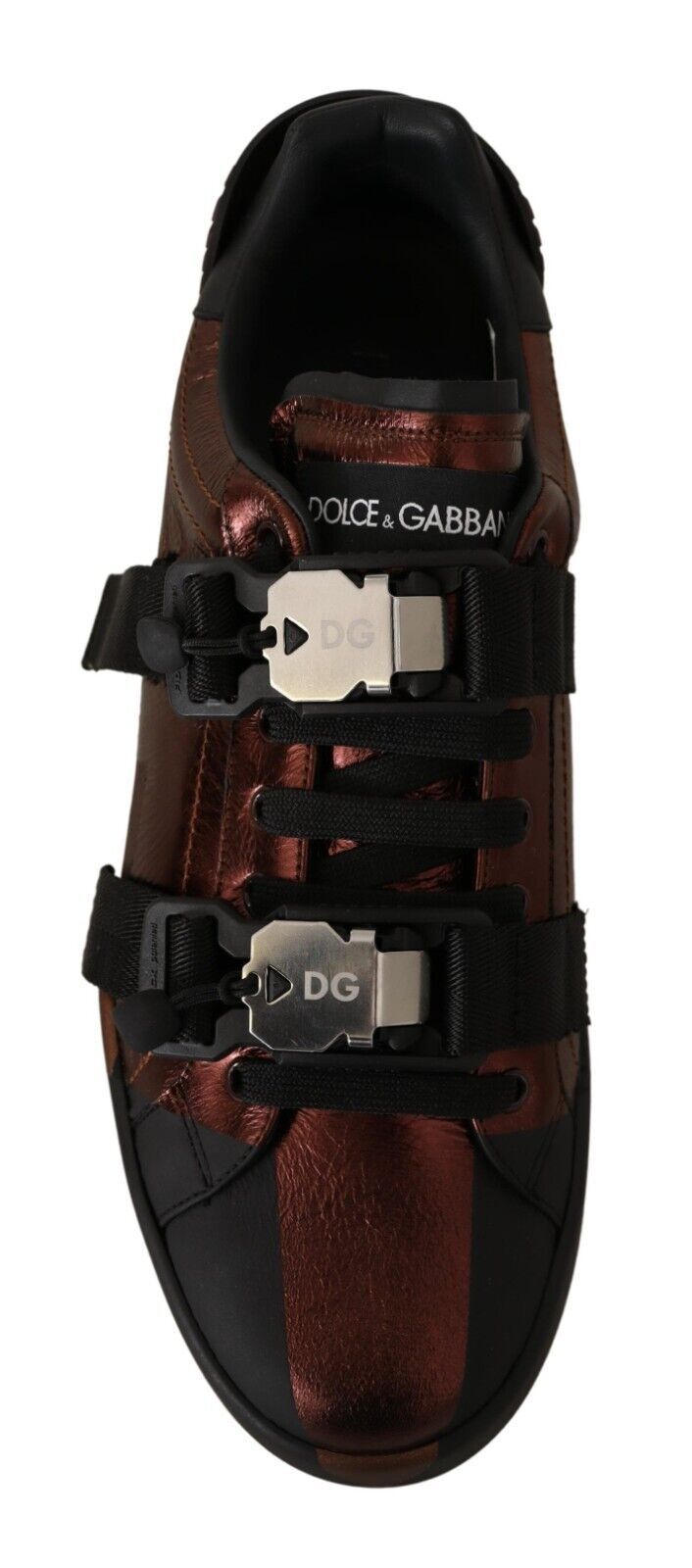 Step into luxury with these gorgeous new, 100% Authentic sneakers from Dolce & Gabbana. Designed for the stylish individual, these black and bronze low top casual sneakers feature a sleek leather construction, comfortable lace and buckle strap closure, and are finished with the brand’s iconic logo details. Perfectly crafted in Italy, they are the epitome of both comfort and high fashion. Elevate your footwear collection with this exquisite pair that combines durability with a cutting-edge design.