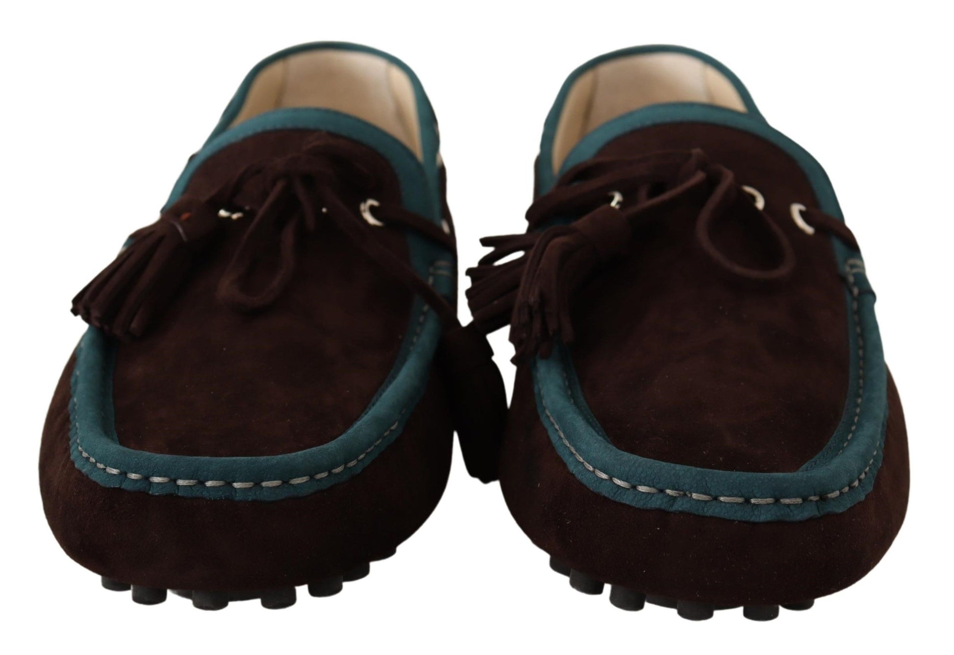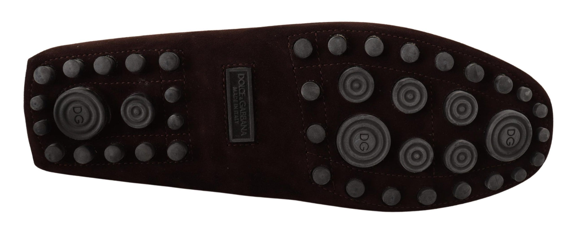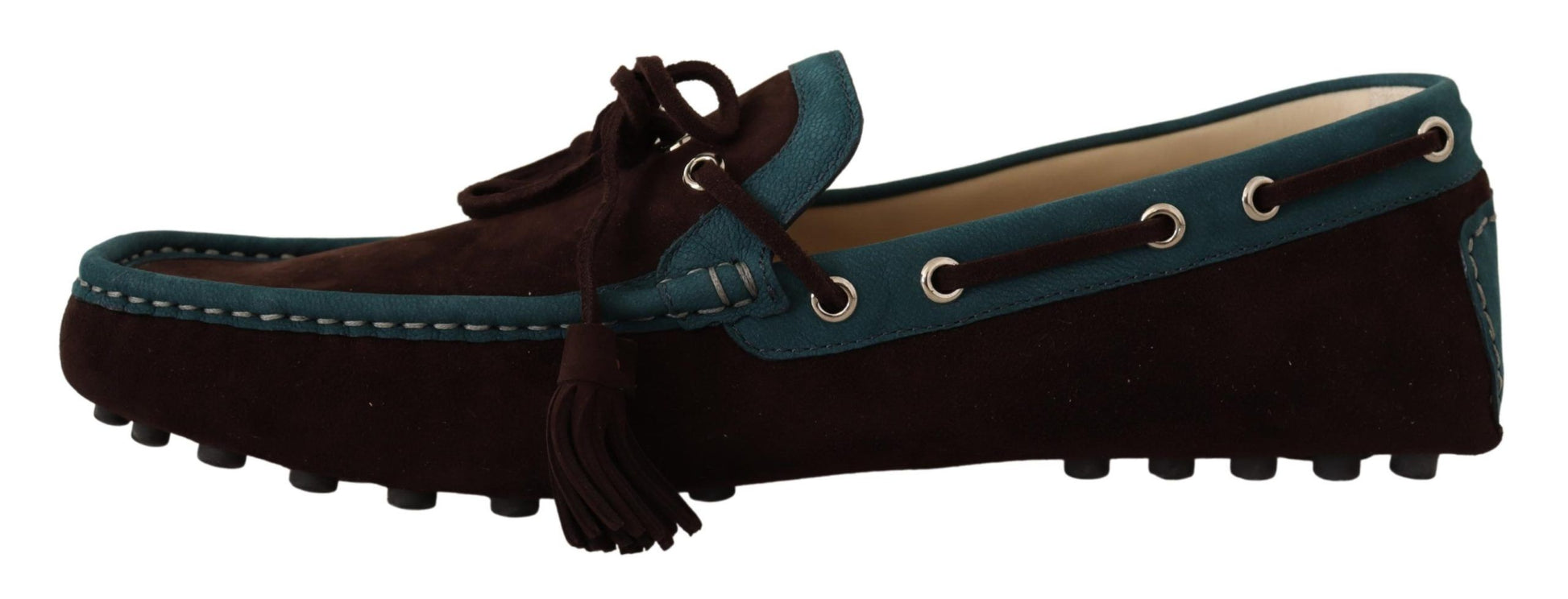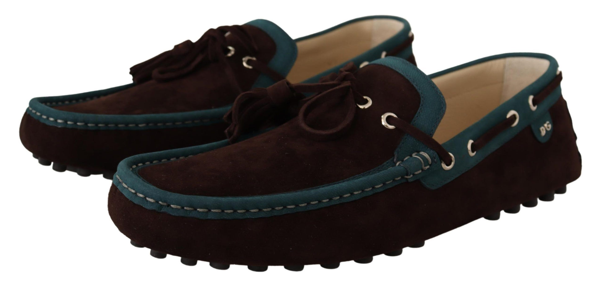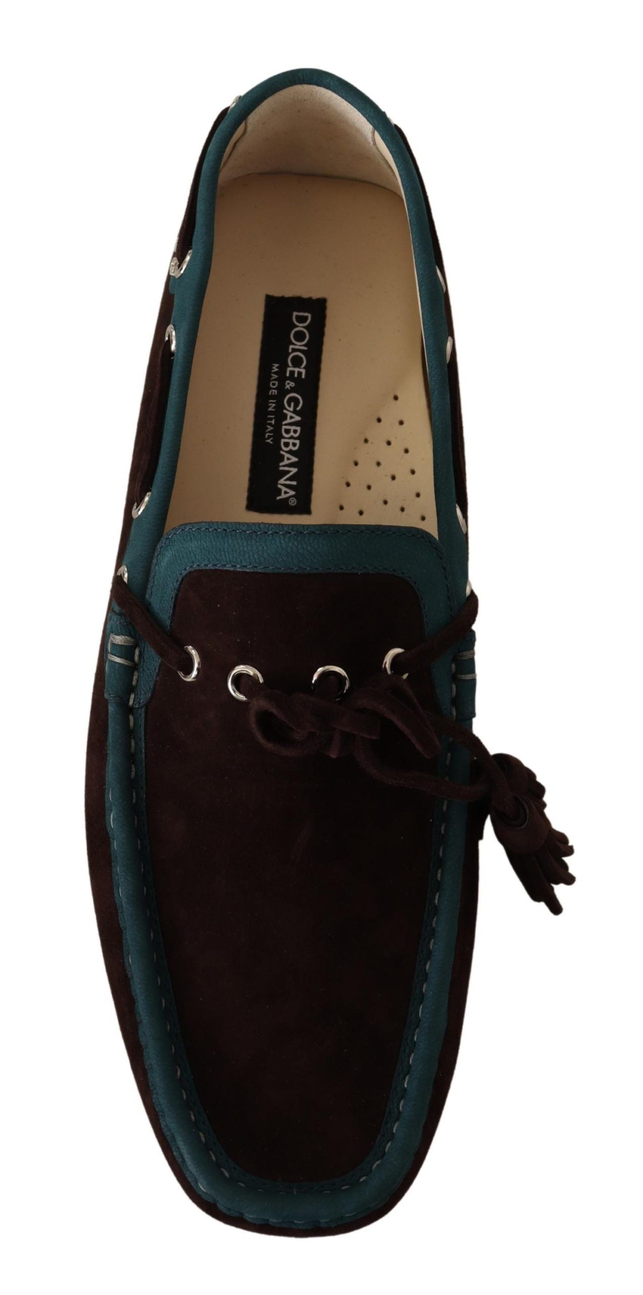 Indulge in the epitome of Italian craftsmanship with these luxurious loafers from Dolce & Gabbana. Designed to elevate your style, these loafers boast an elegant almond toe and a convenient lace-up front fastening for a personalized fit. The branded insole signifies the uniqueness of the brand, while the slip-on style ensures easy wearability. In shades of sophisticated brown and subtle blue, these shoes are the perfect addition to your footwear collection, complete with a durable rubber sole for longevity. Embrace the fusion of comfort and high fashion with these exquisite loafers, a true testament to superb quality and exclusive design.