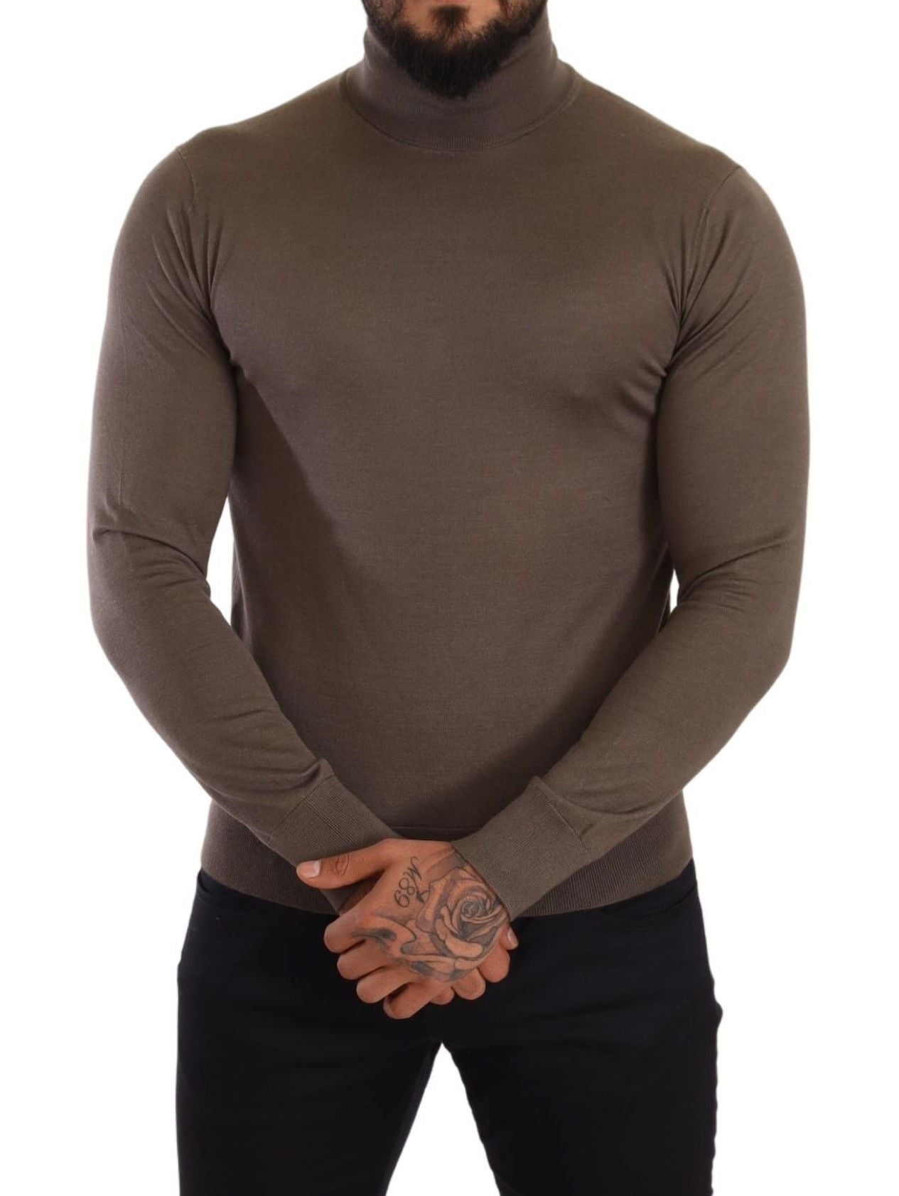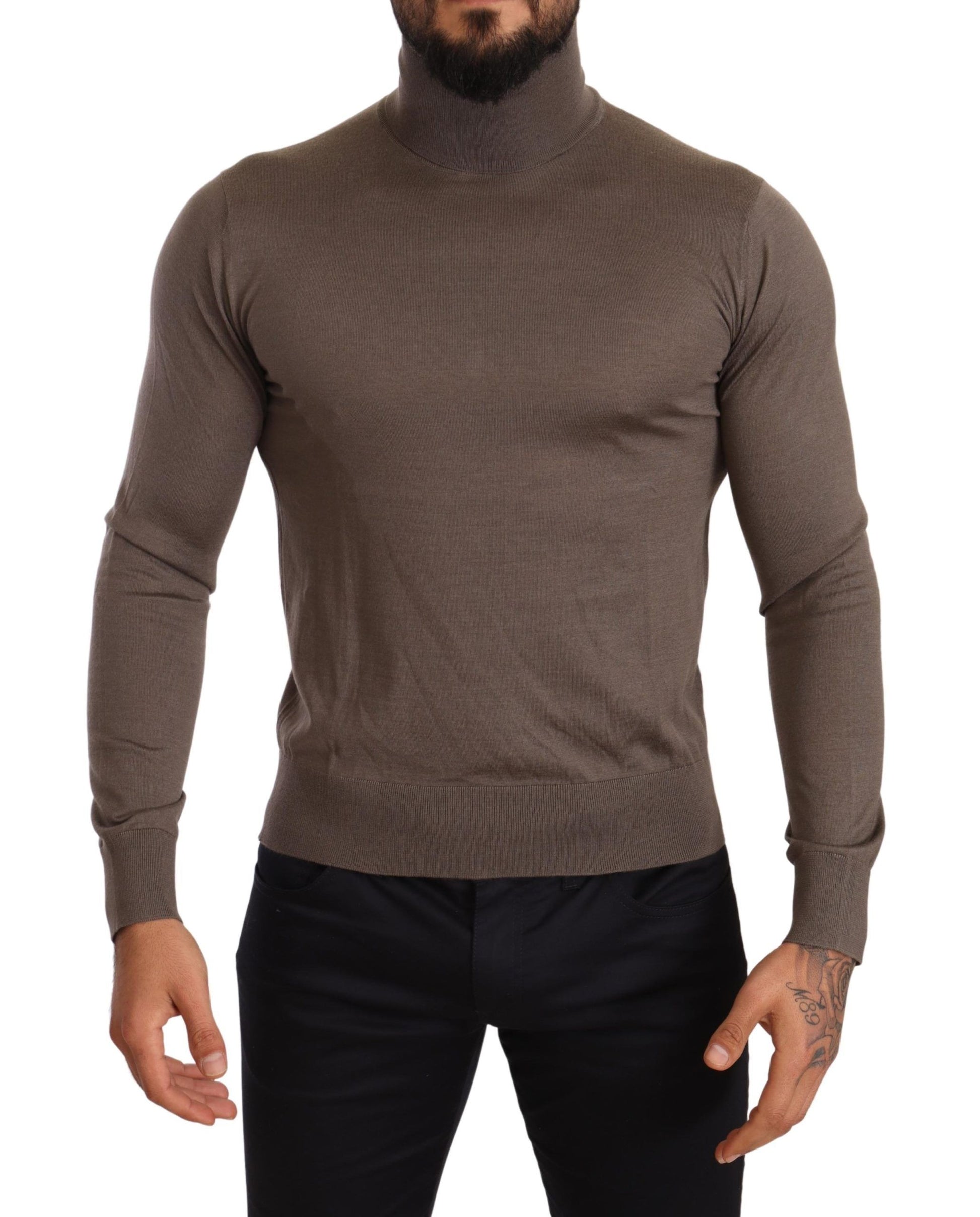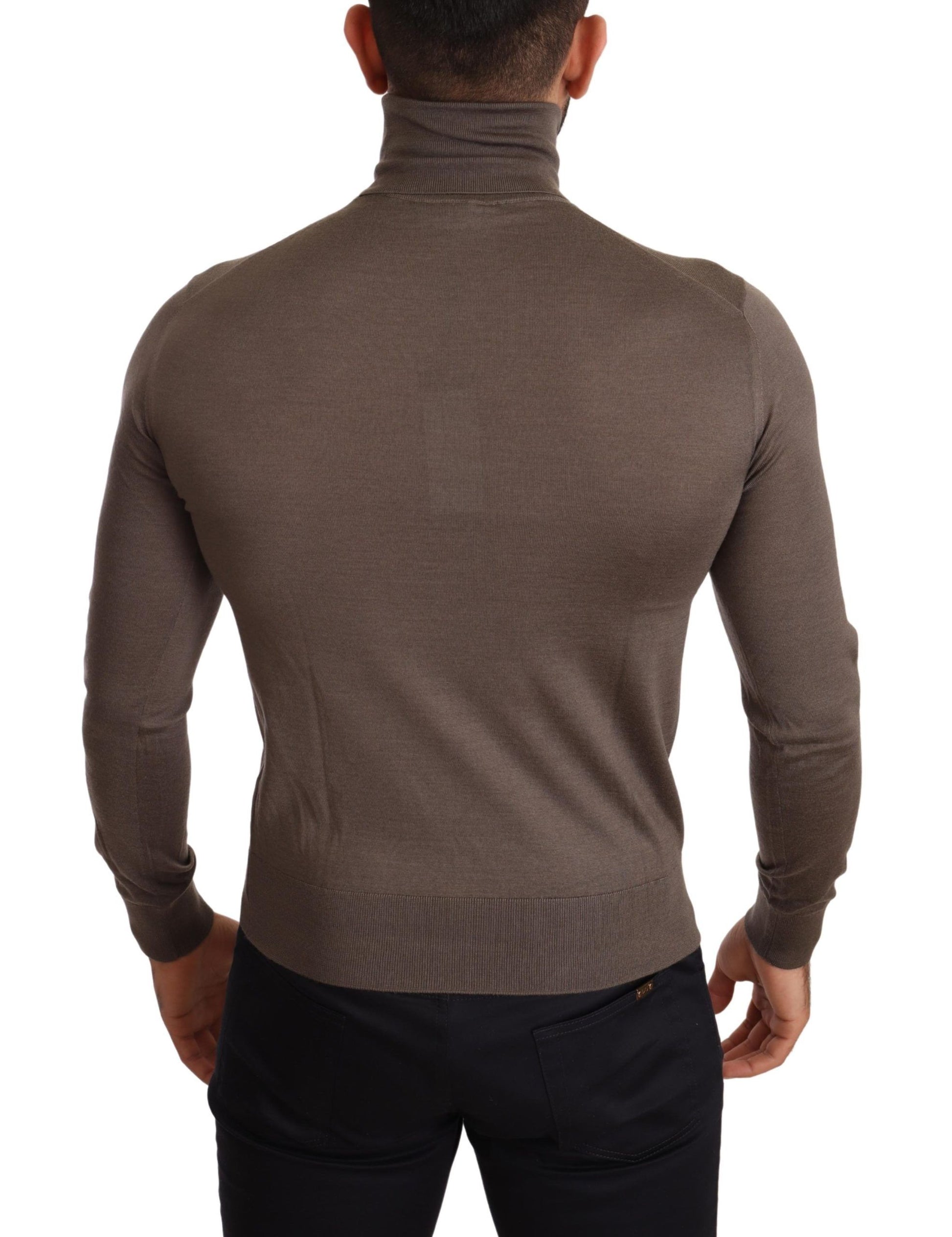 Indulge in the ultimate luxury with this exquisite turtleneck sweater from Dolce & Gabbana . Crafted from a premium blend of 70% cashmere and 30% silk, this piece delivers unparalleled softness and a refined aesthetic. The mid-weight knit ensures comfort and warmth, making it a perfect addition to your sophisticated wardrobe. It features ribbed trims along with the brand’s subtle logo details, all made in Italy with meticulous attention to craftsmanship. This handsome brown pullover is a timeless investment that radiates elegance.