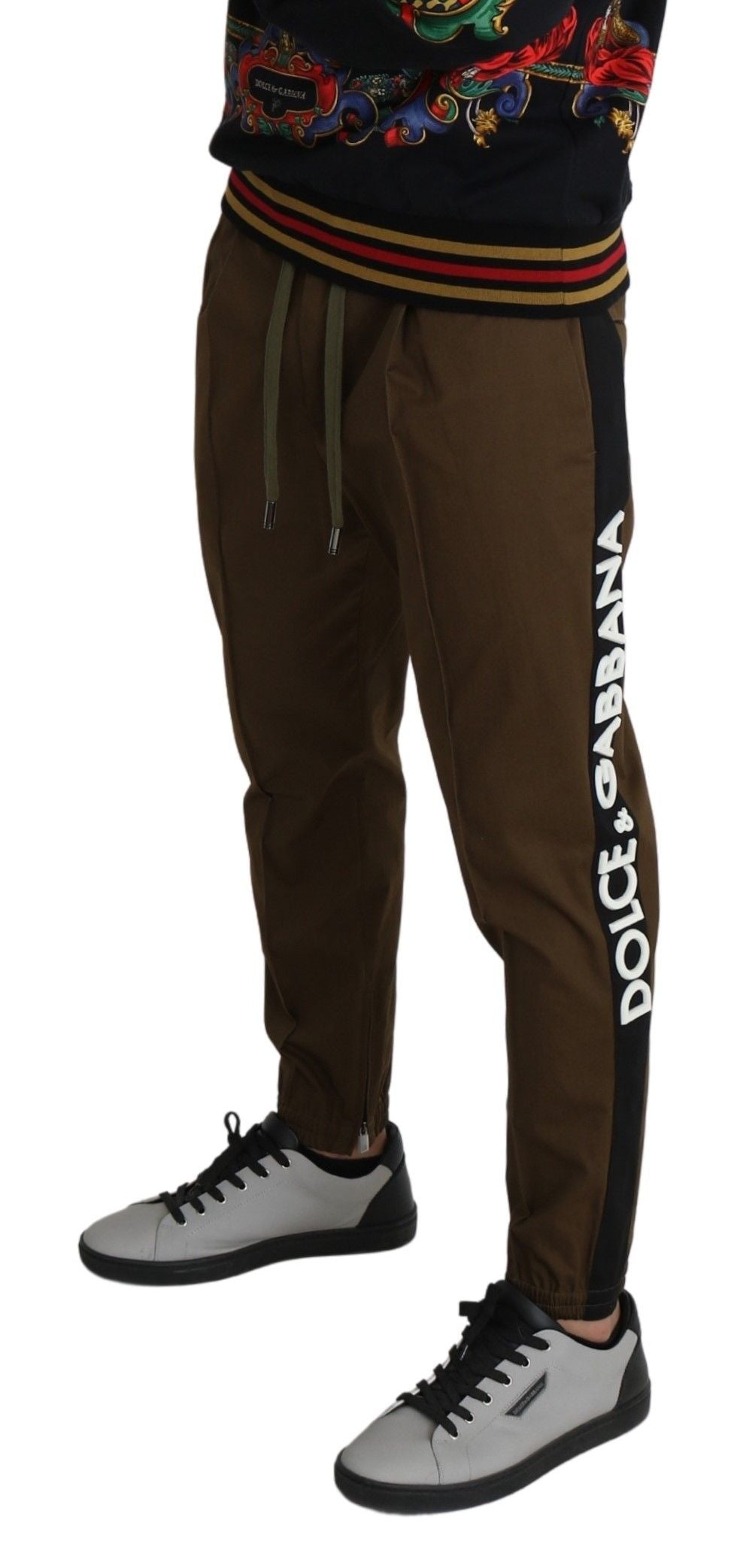 Indulge in the epitome of comfort with these Dolce & Gabbana premium sweatpants. Crafted from a sumptuous blend of high-quality cotton and a touch of elastane, these brown sweatpants feature a regular fit, ensuring both style and ease of movement. Accentuated with a standout logo detail and endowed with a convenient drawstring closure, they reflect a seamless blend of fashion and function. Perfect for adding a touch of luxury to your casual wear, these sweatpants are an outstanding Italian creation.