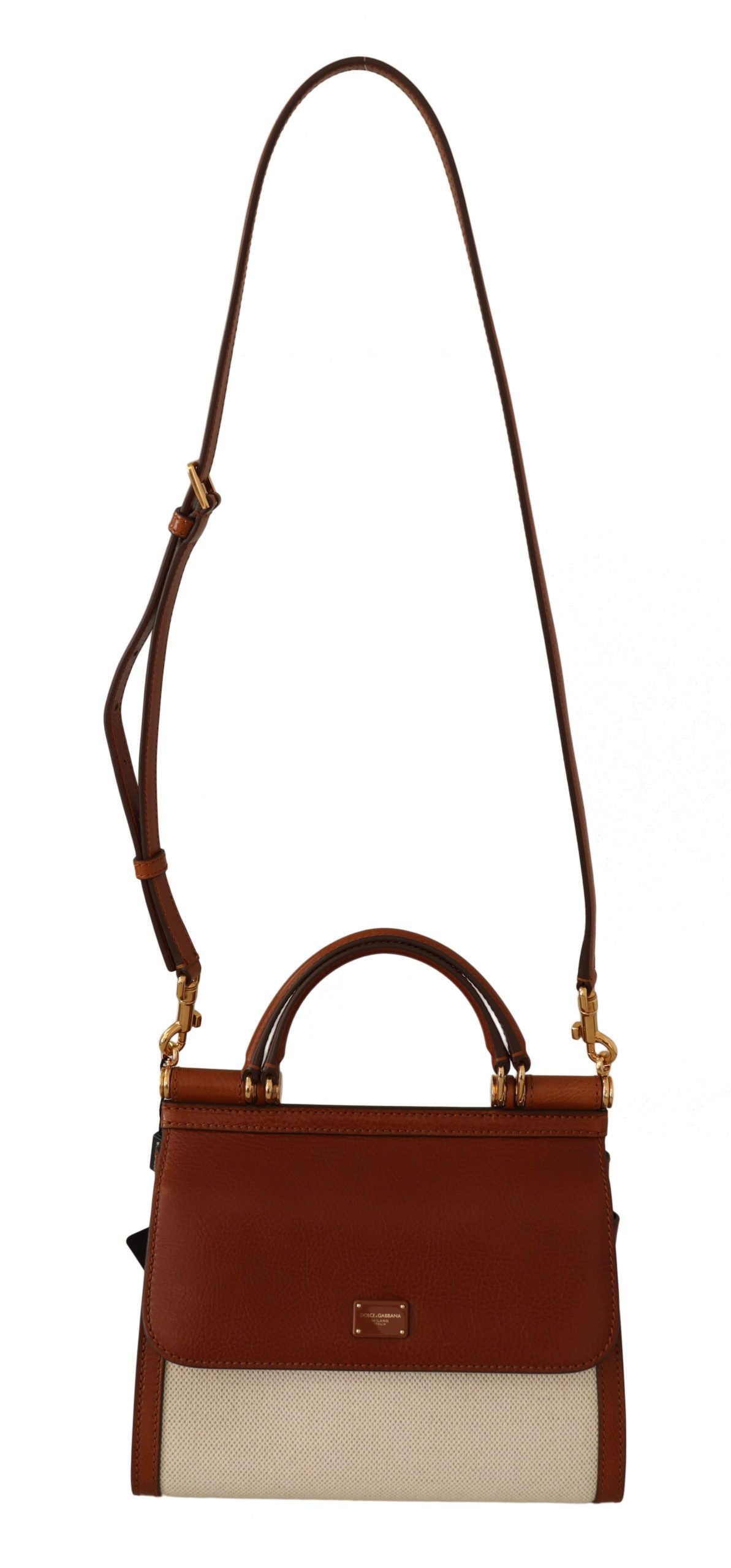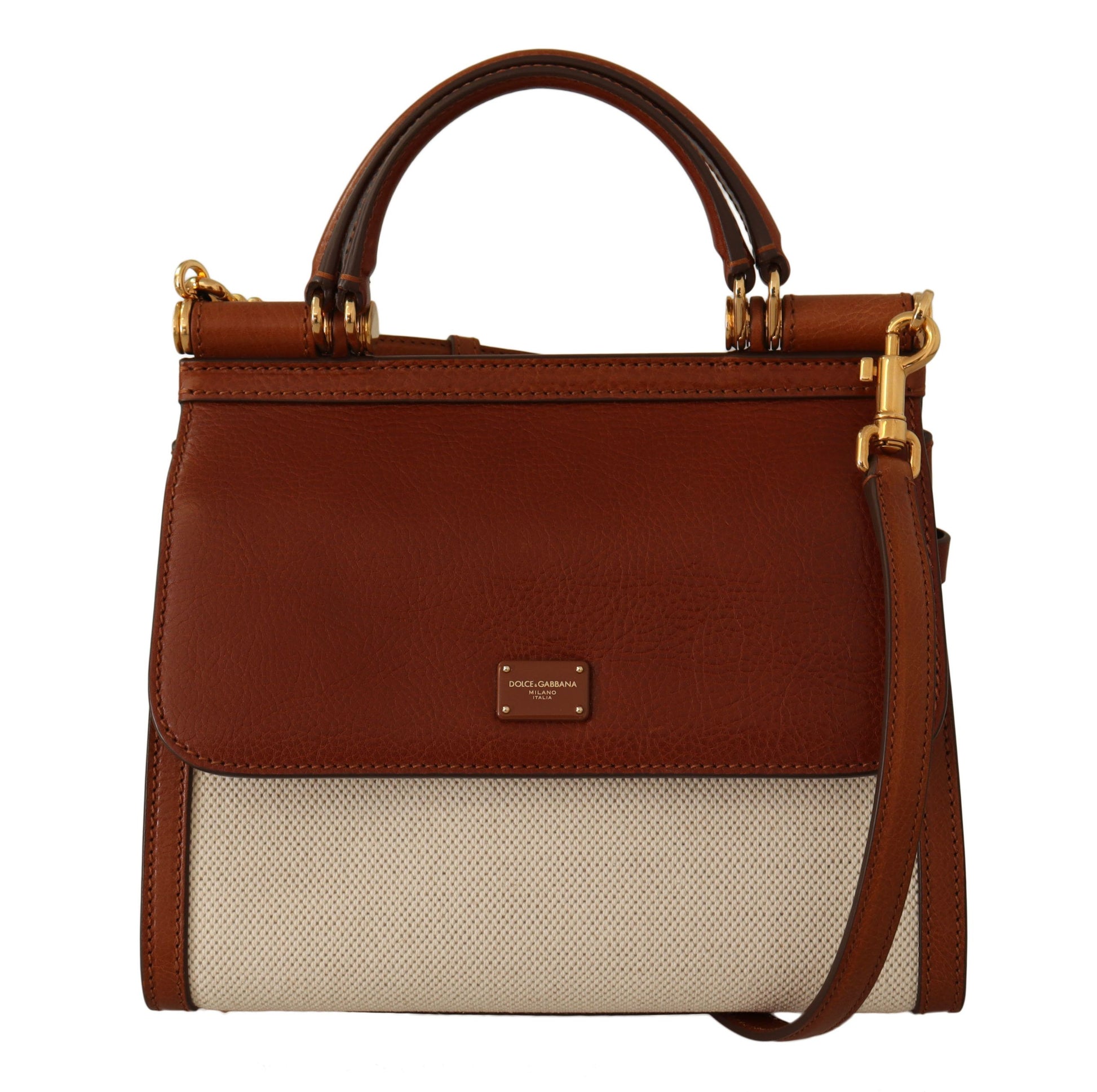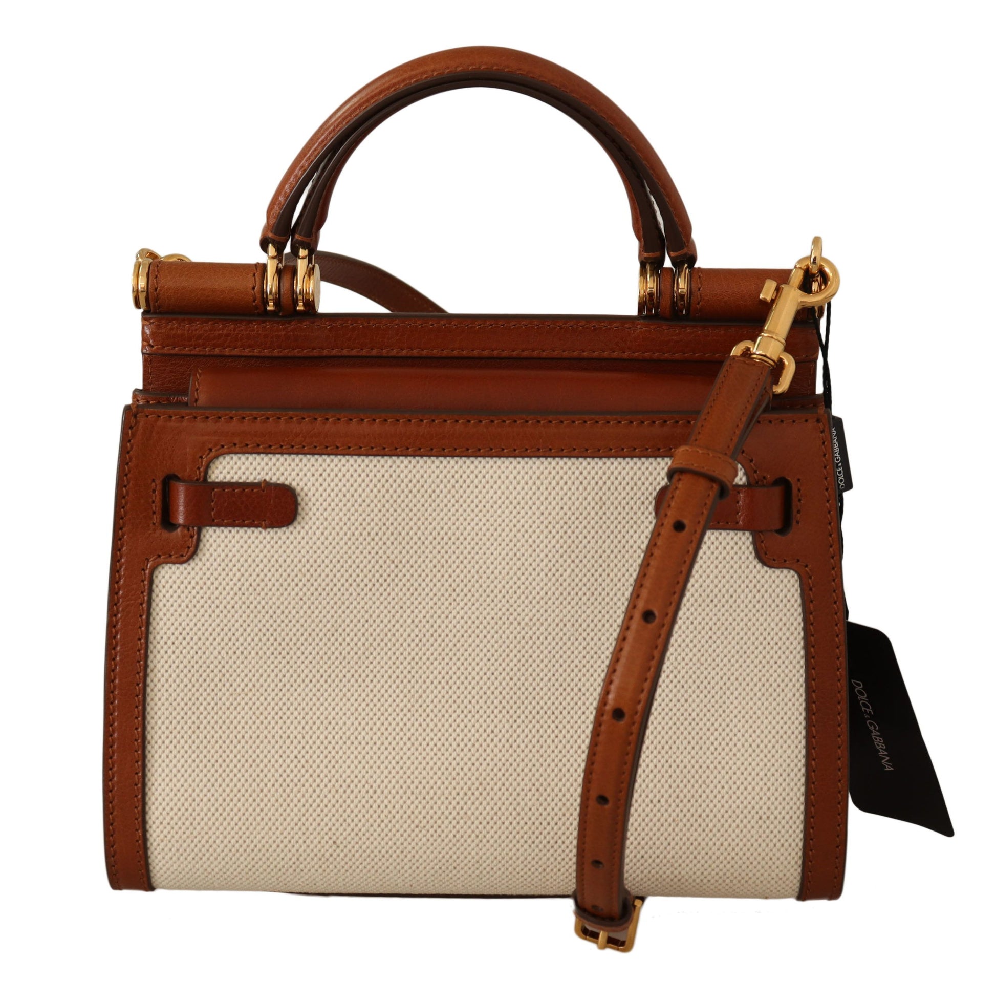 Indulge in the epitome of luxury with the Dolce & Gabbana Sicily Bag. This exquisite accessory is not only a statement piece but also a testament to the brand’s commitment to quality and design. Featuring a sophisticated brown and white color palette enhanced with gold metal detailing, this bag is crafted from a fine blend of cotton, linen, and premium leather, offering both durability and elegant appeal.